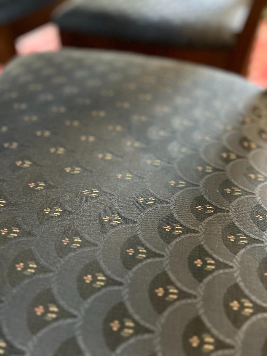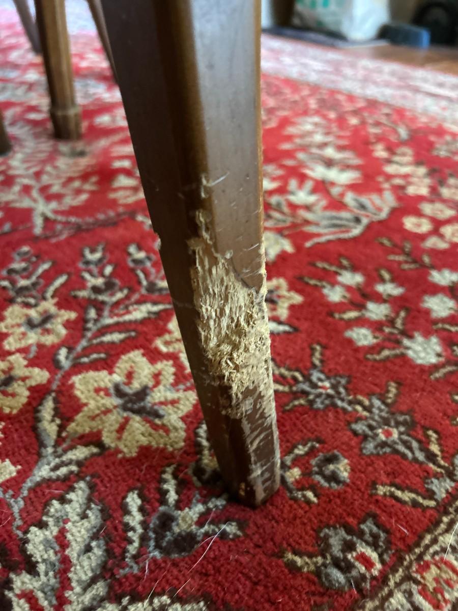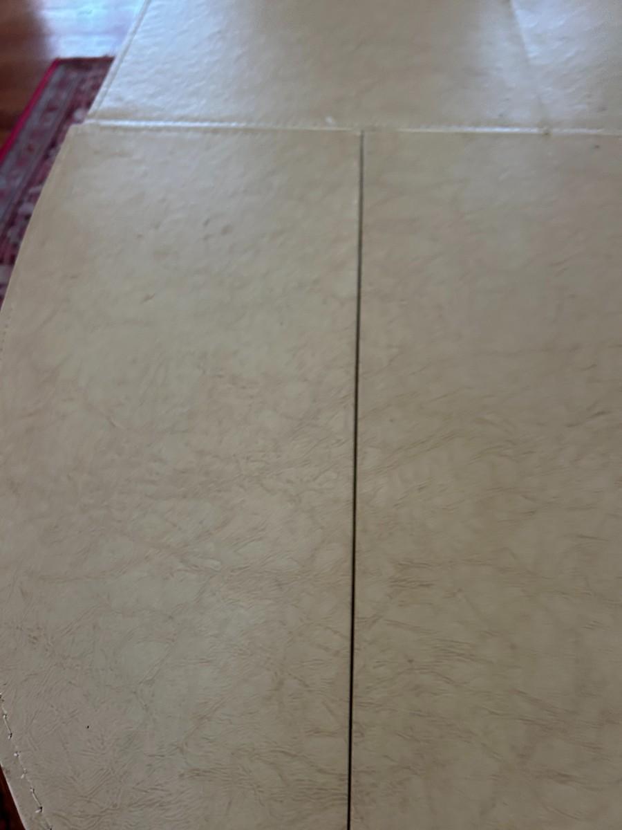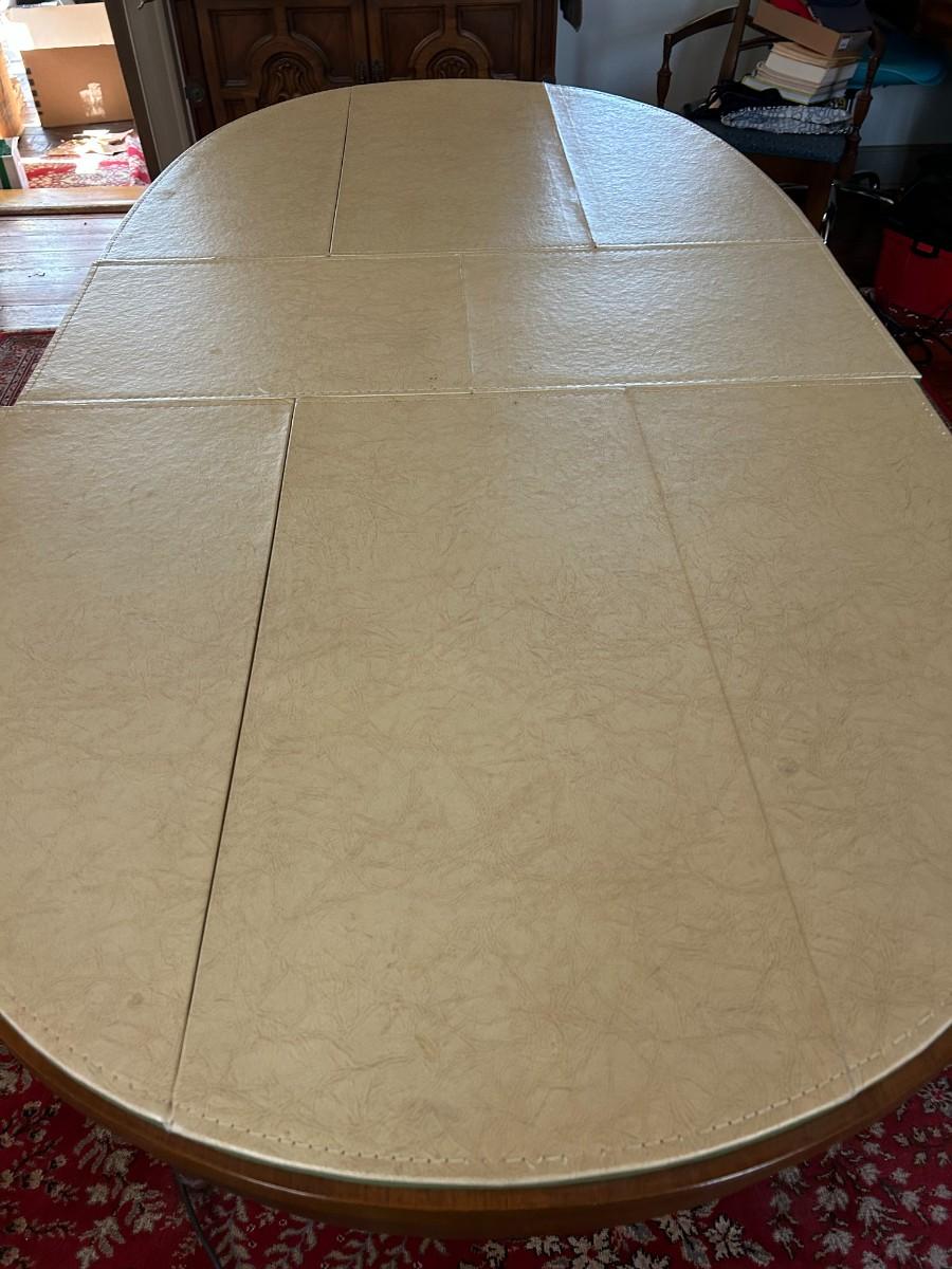 This beautiful MCM Dining set by American Furniture Company of Martinsville, VA has plenty of space for family and friends (or laundry). Table is 60lx38wx29.5h without any leaves, add one to get 74 inches long and a whopping 88 inches with both leaves. Chairs are covered in a classic but muted blue and gold fan fabric which were found to be a delectable treat for the dog. No matter which size, there is a protective mat to keep the table looking as gorgeous as it did on day one. BTW...if you choose to fix the chair legs, there are two ways about it, my way and the professional's way.
