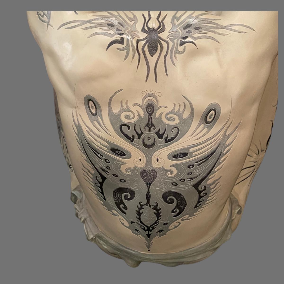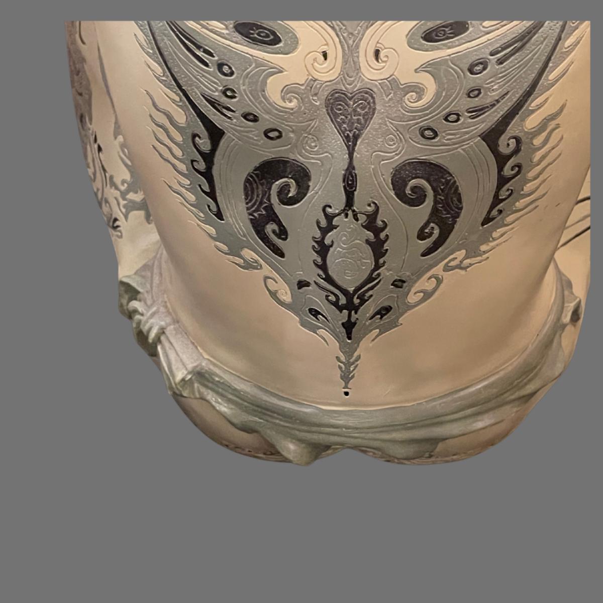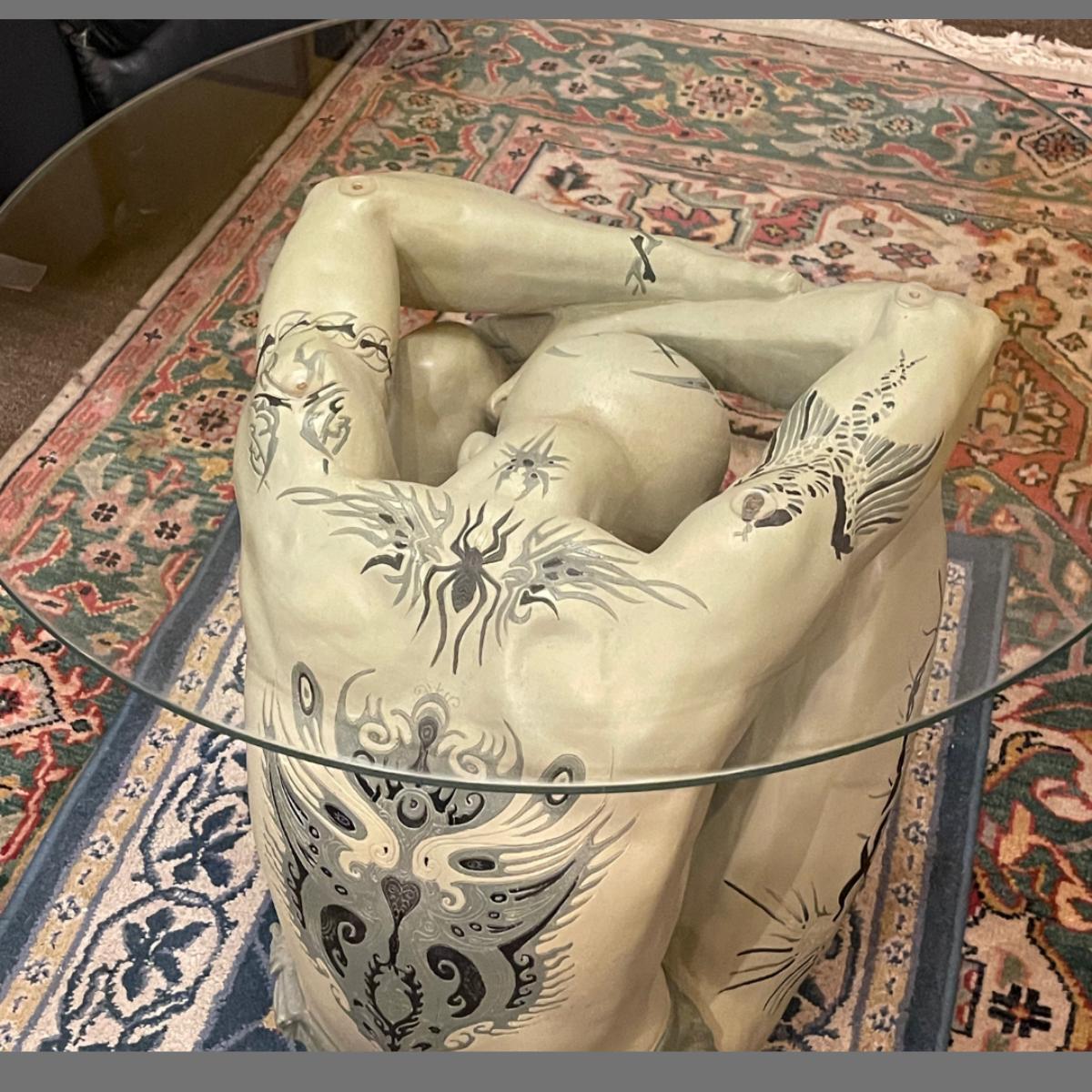 This is a very unique piece. Artist is unknown, but there were only 3 of these made. Glass is 27" and the statue is 15 x 20. It is a stunning piece and very unique.