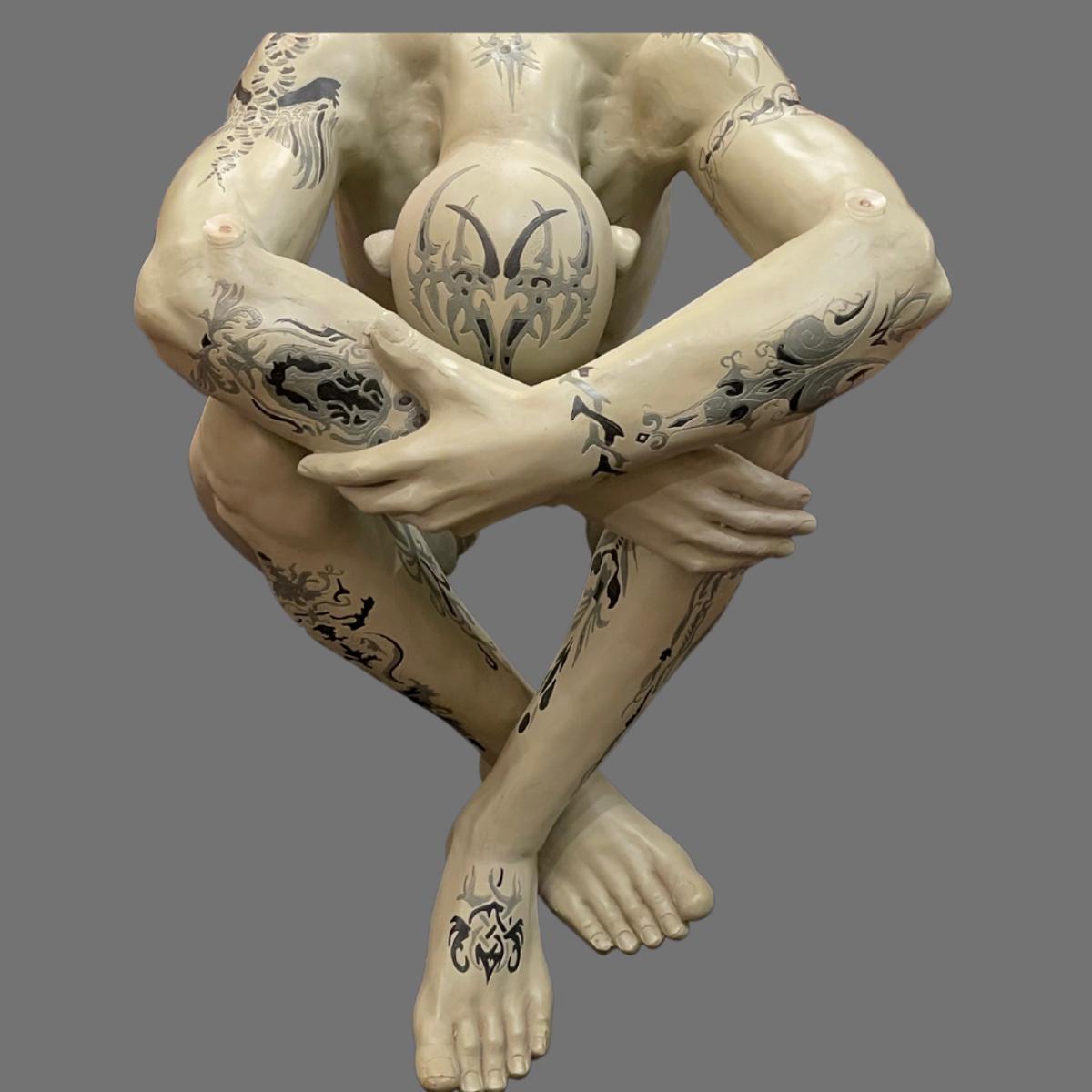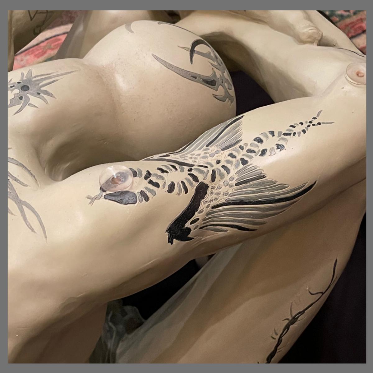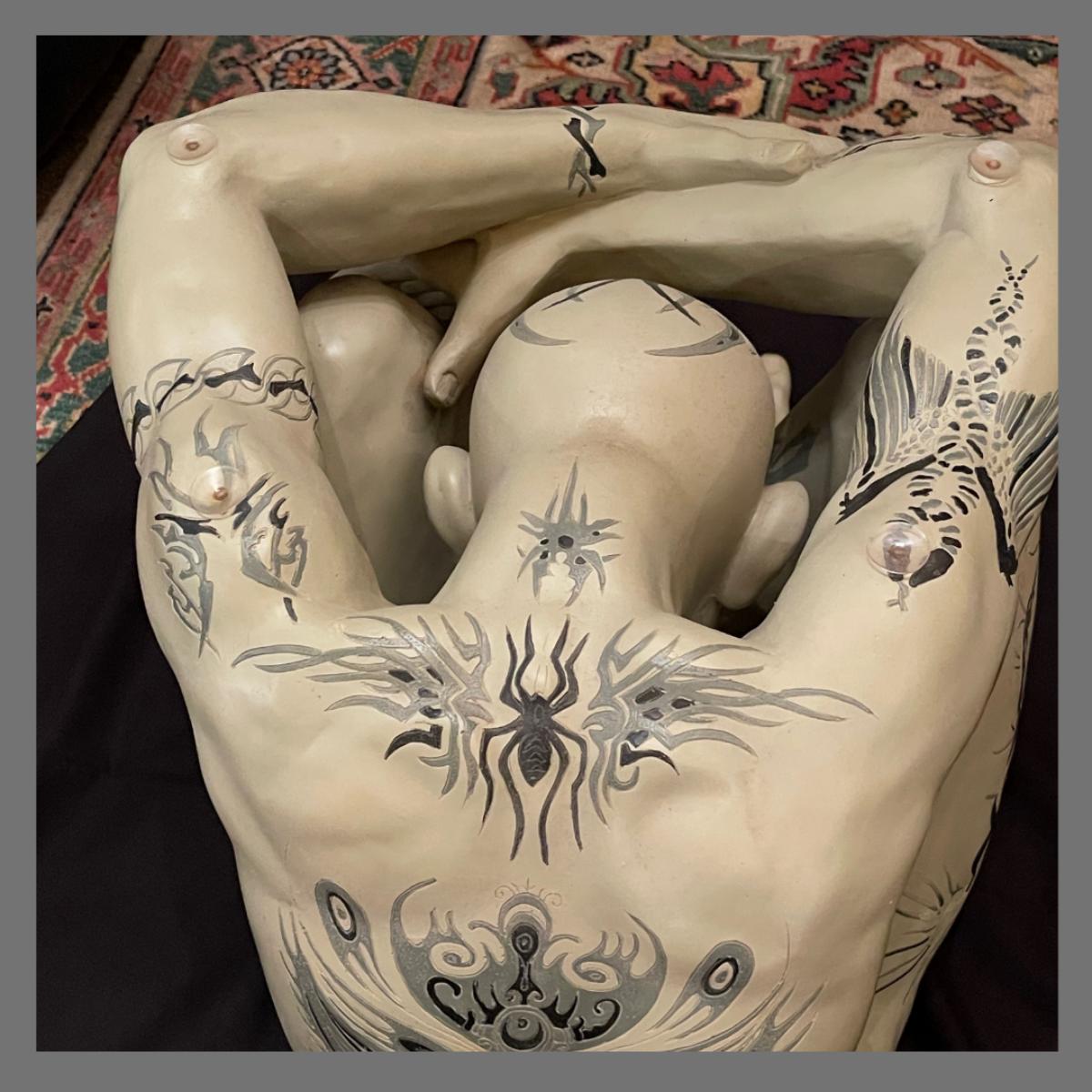 This is a very unique piece. Artist is unknown, but there were only 3 of these made. Glass is 27" and the statue is 15 x 20. It is a stunning piece and very unique.