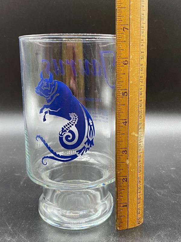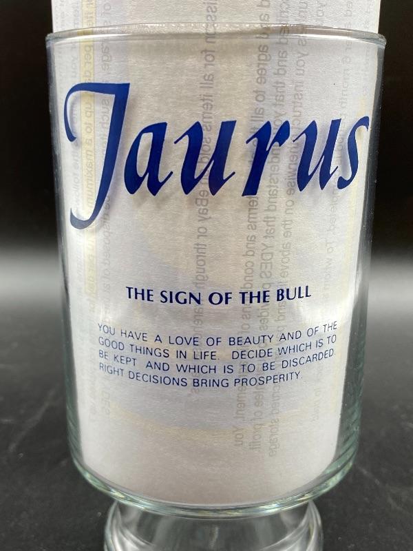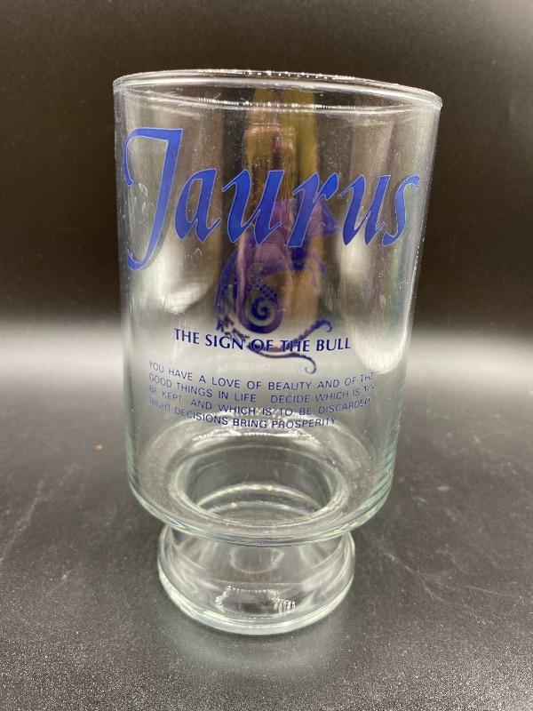 For the astrology followers, Taurus horoscope glass. Taurus, the sign of the bull, with a quote on one side and a image on the other. Large, almost 7".