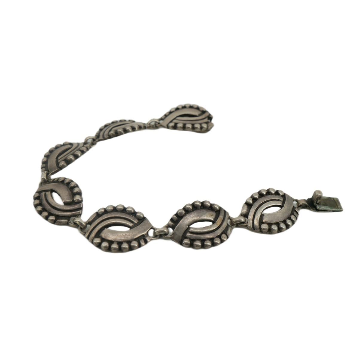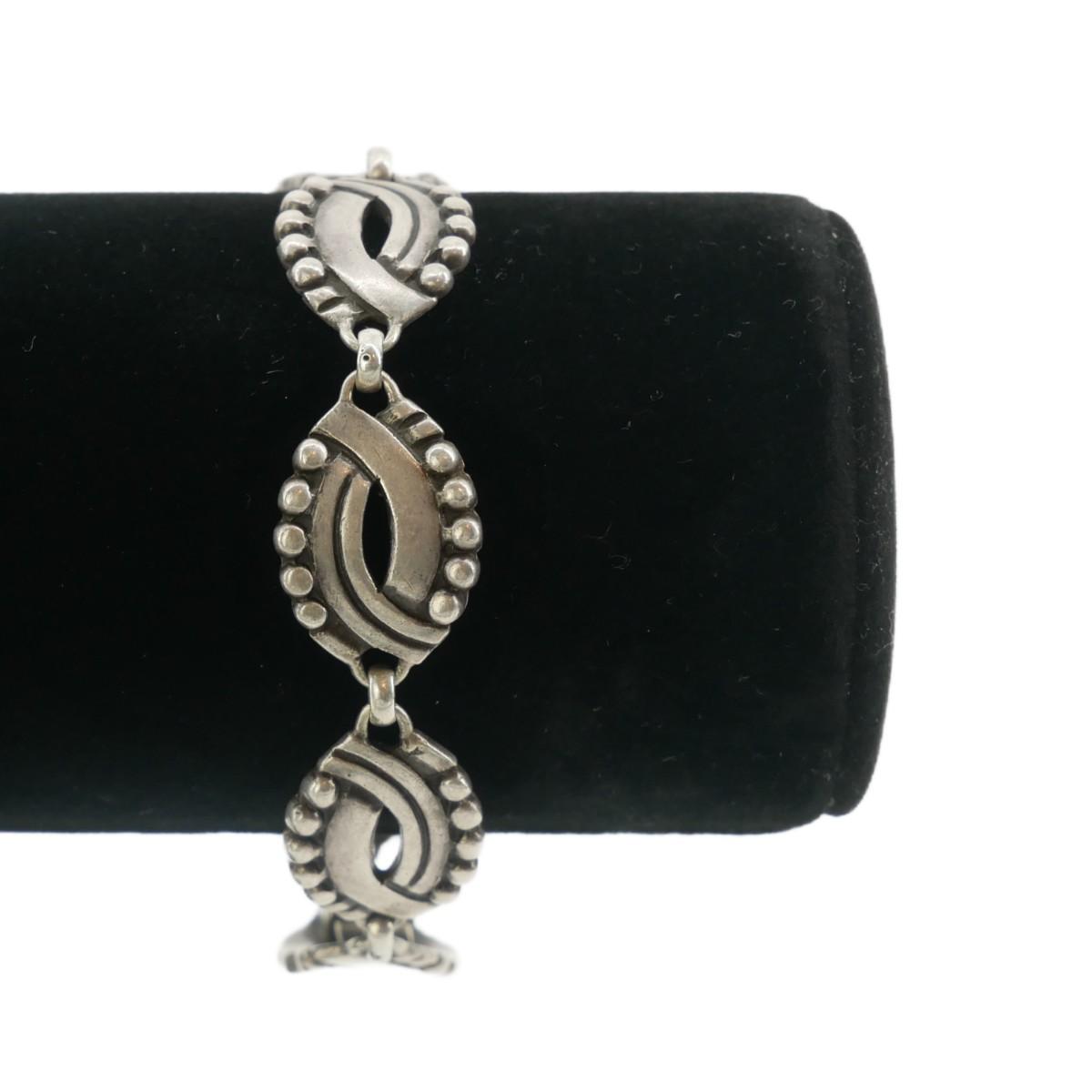 Gorgeous design on this Taxco, Mexico silver bracelet. Extremely small markings that have to be seen with a magnifier. Thought to say 940 Taxco. Piece measures 7" across and about 0.5" wide. Total piece measures 30g.
