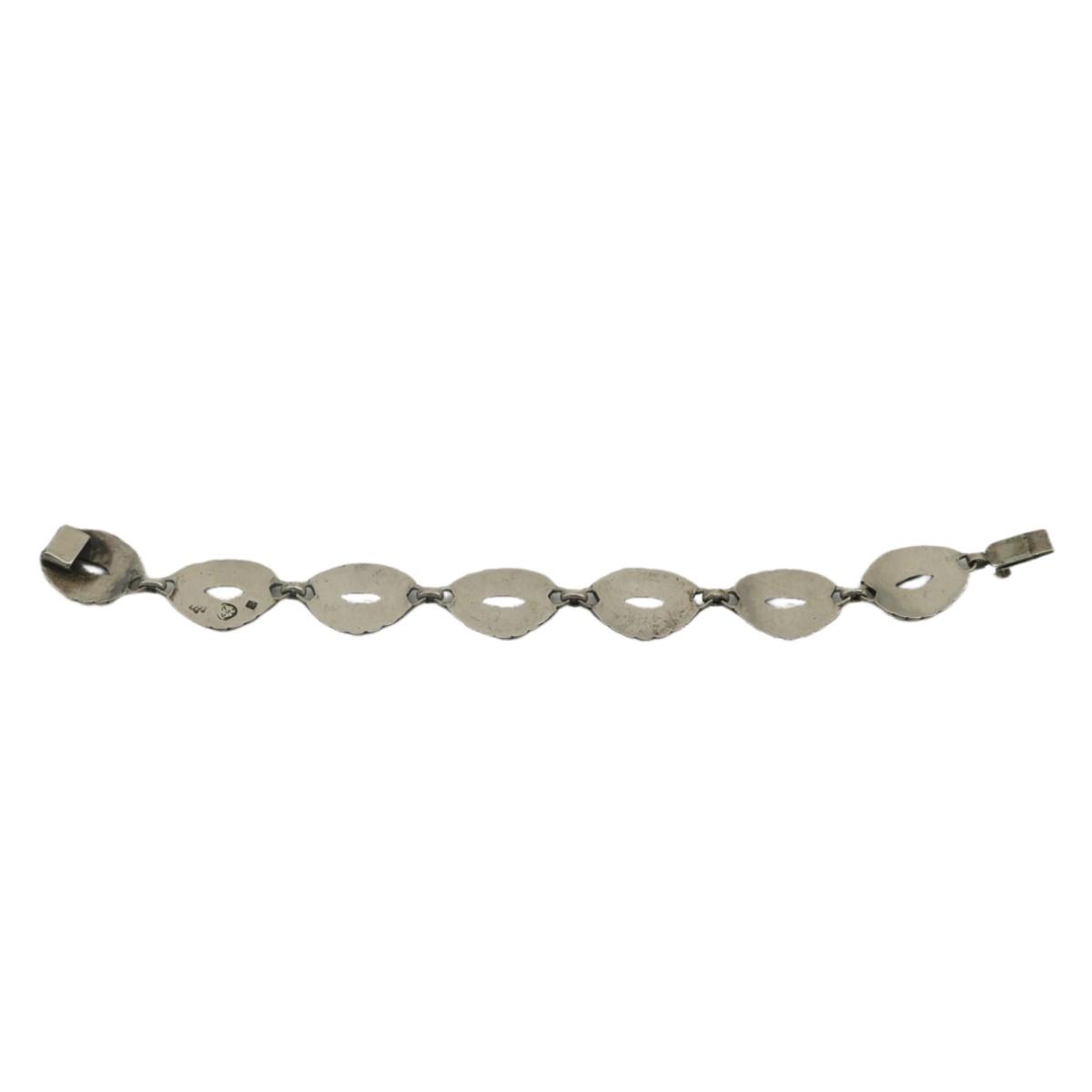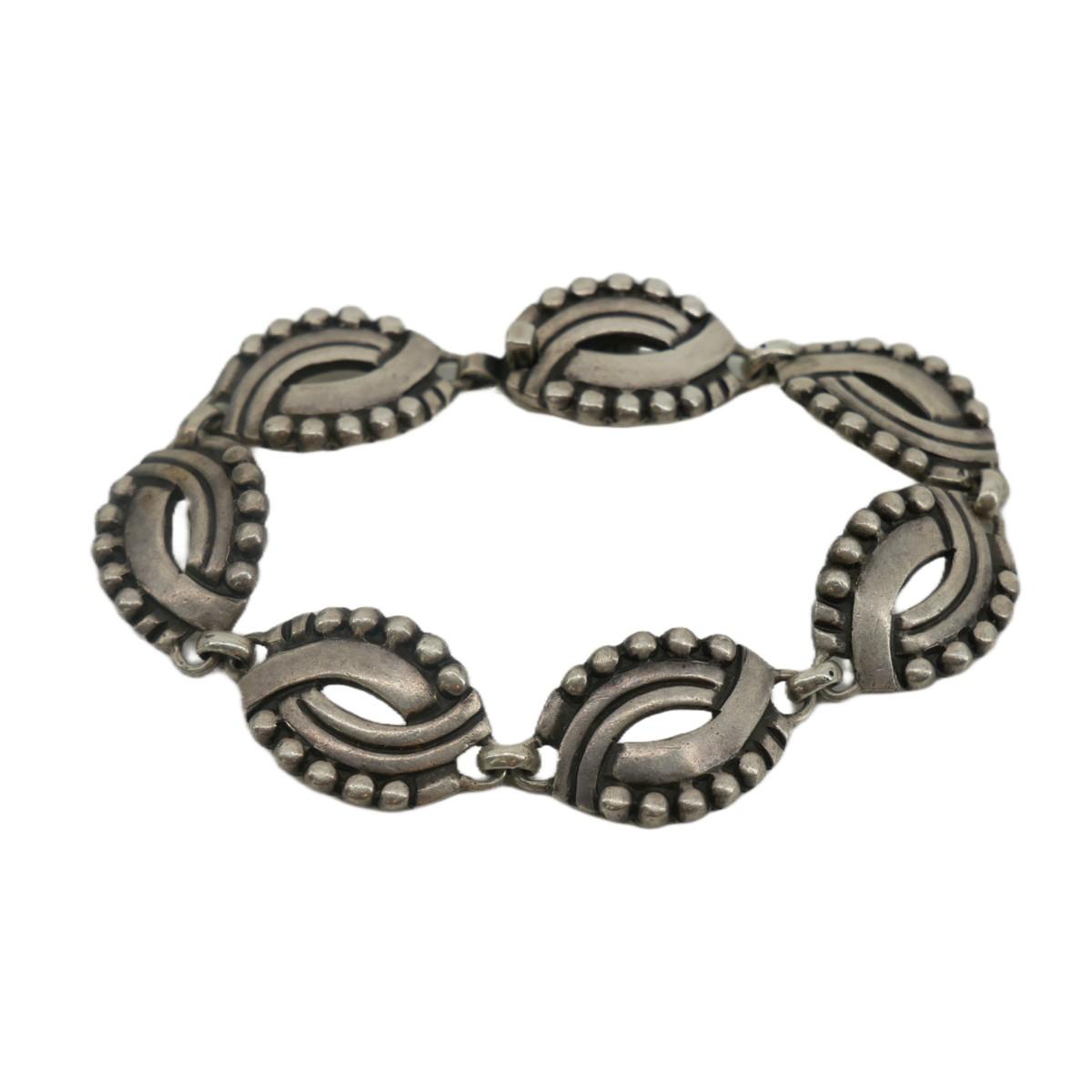Gorgeous design on this Taxco, Mexico silver bracelet. Extremely small markings that have to be seen with a magnifier. Thought to say 940 Taxco. Piece measures 7" across and about 0.5" wide. Total piece measures 30g.