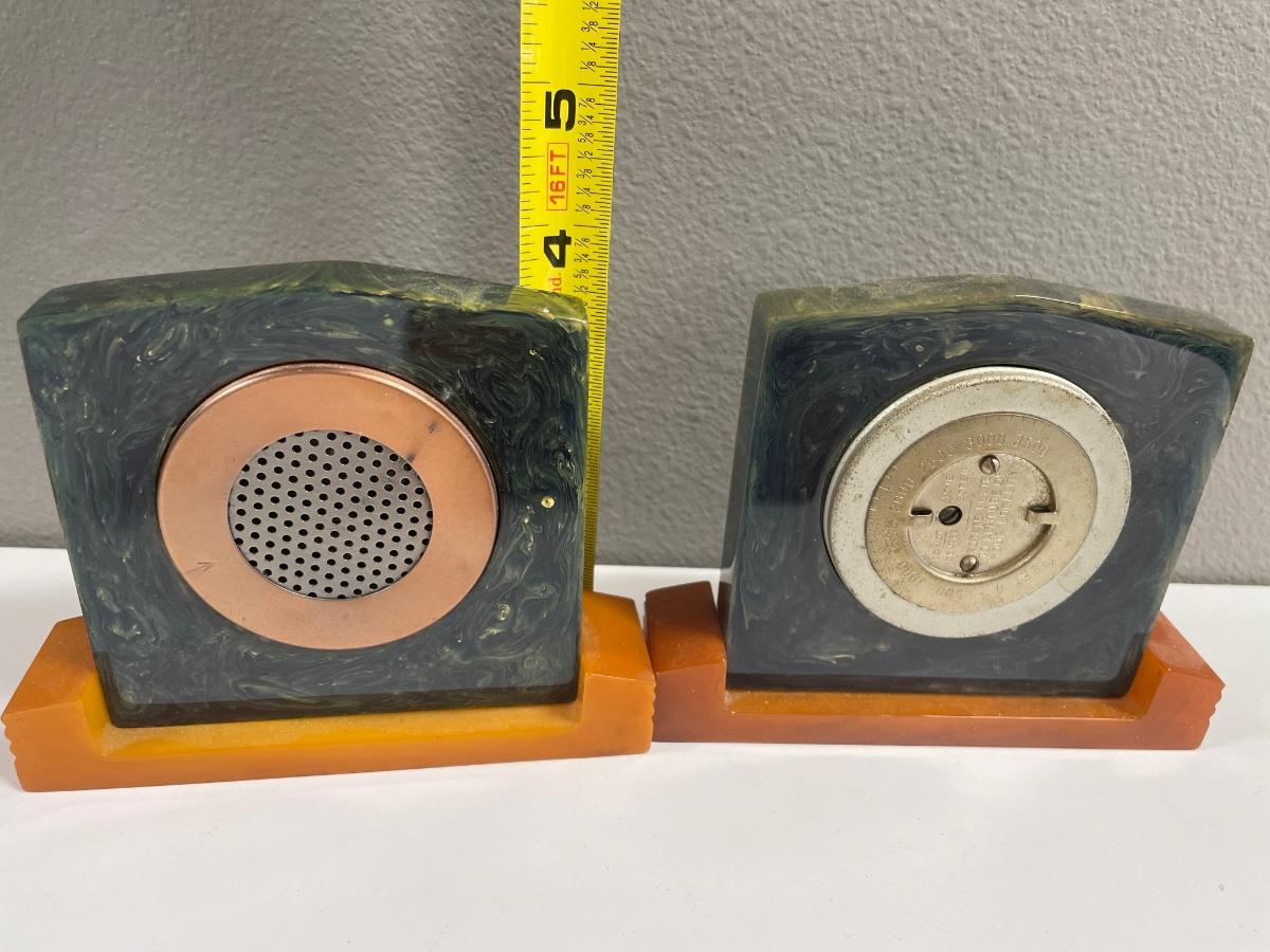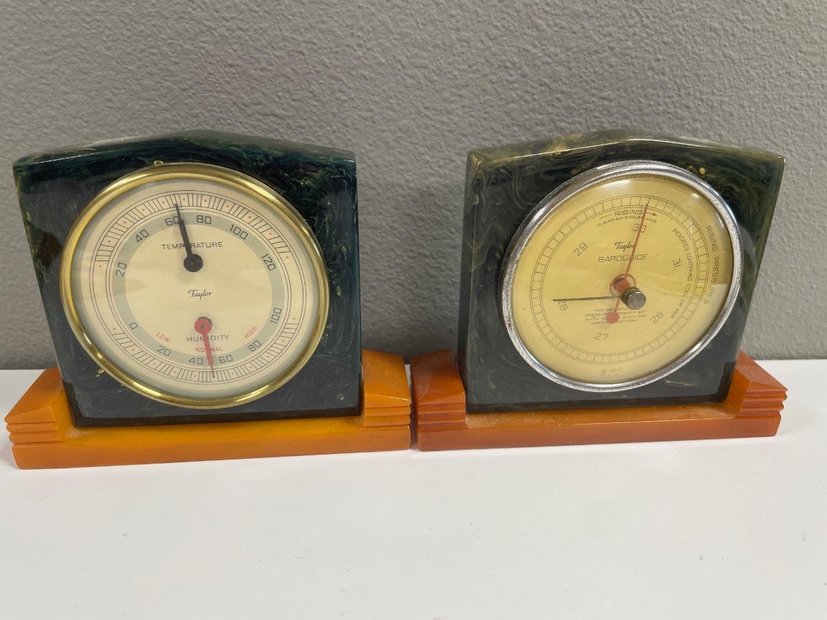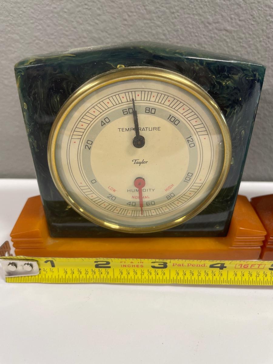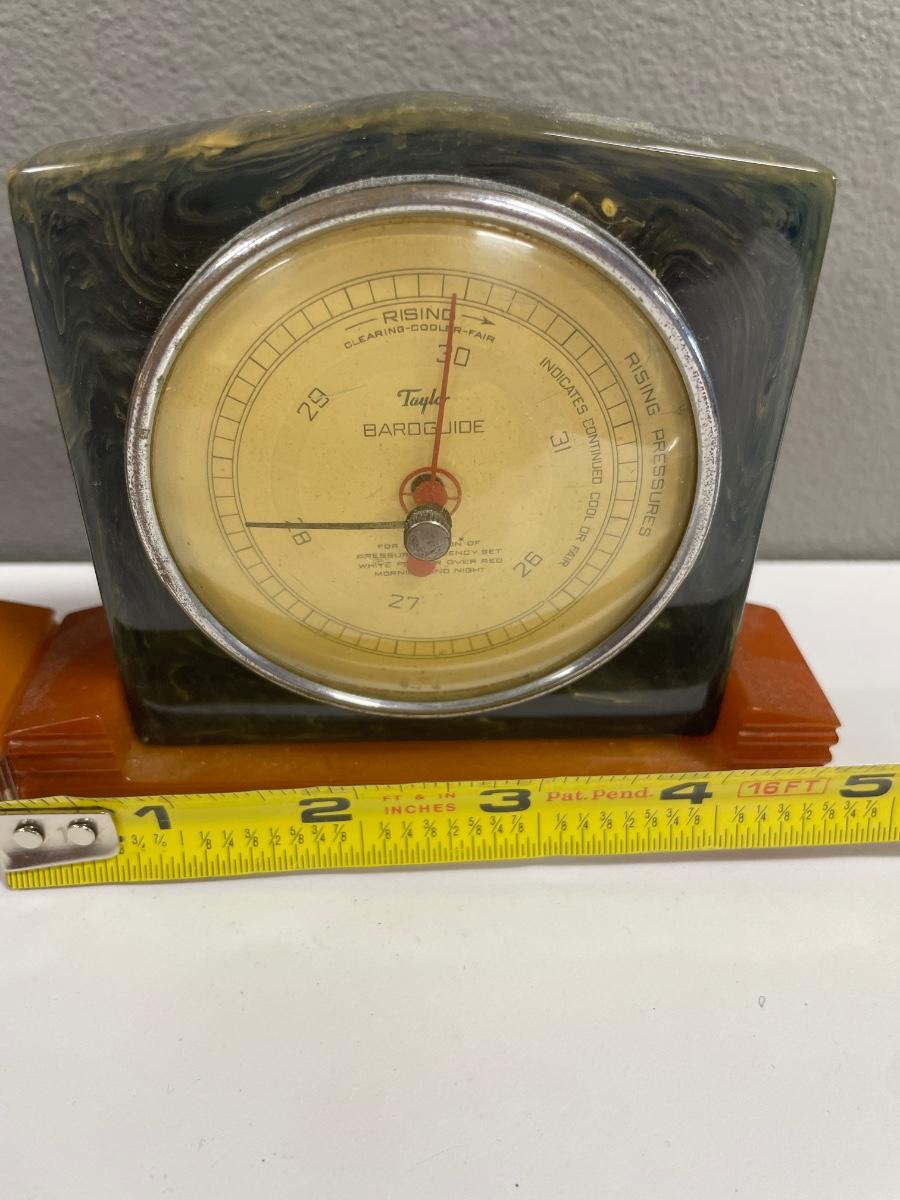 Vintage Art Deco Taylor Baroguide Barometer & Temp in Butterscotch Bakelite Catalin with green marbleized setting