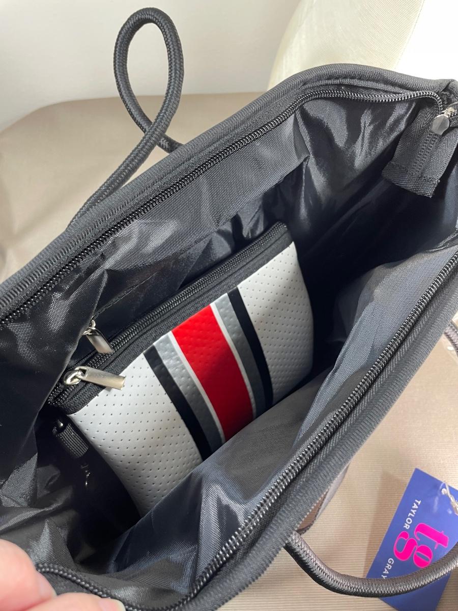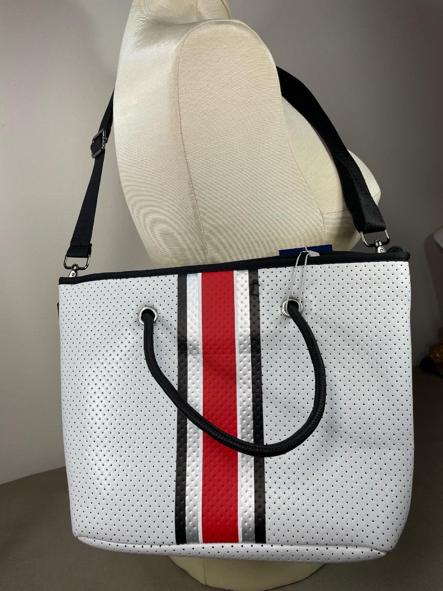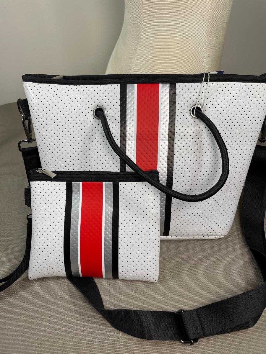 Fully lined, with detachable wristlet. White with red stripes. New with tag.
