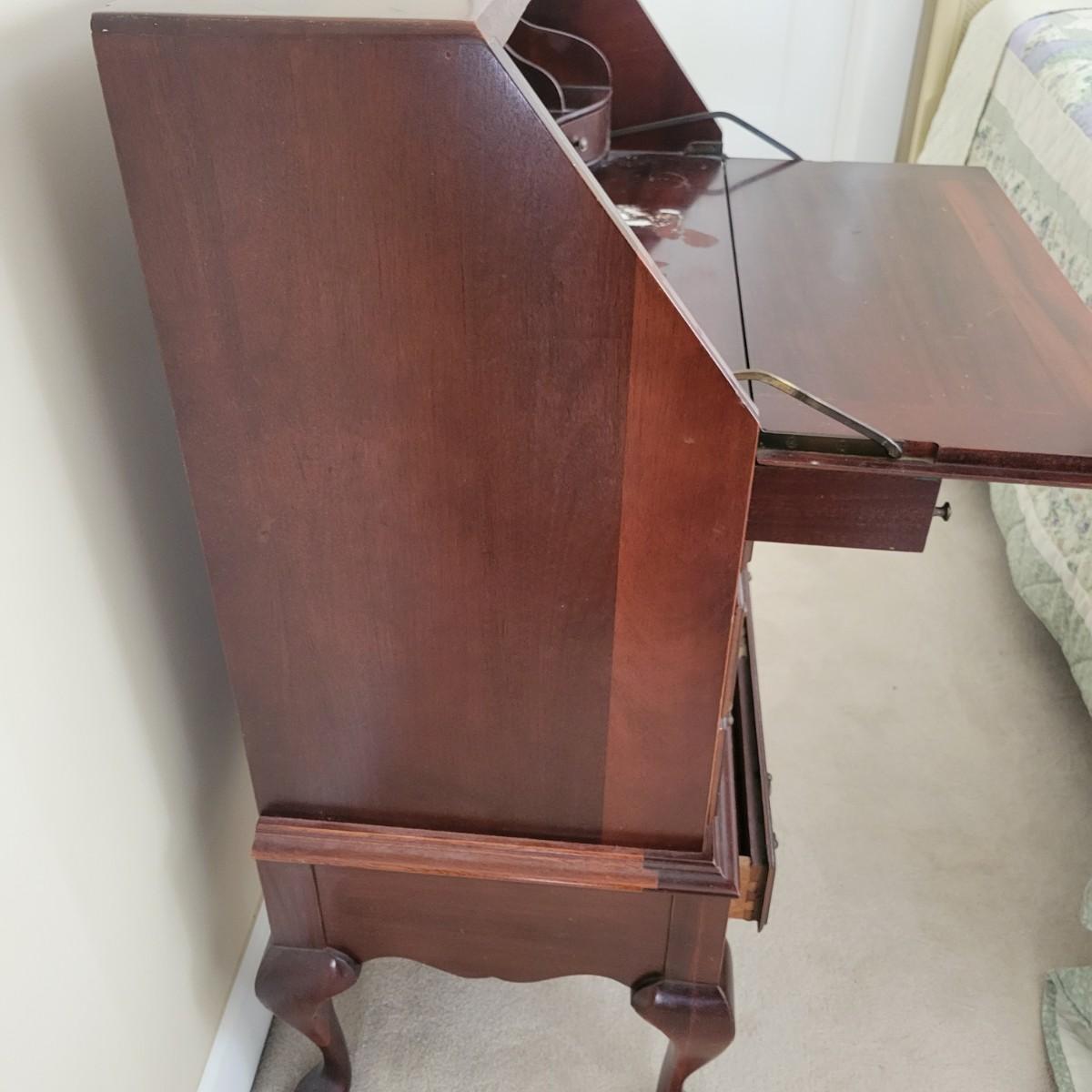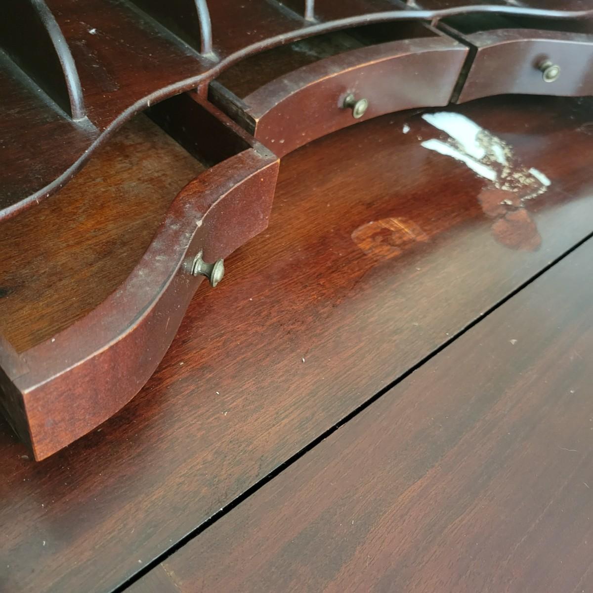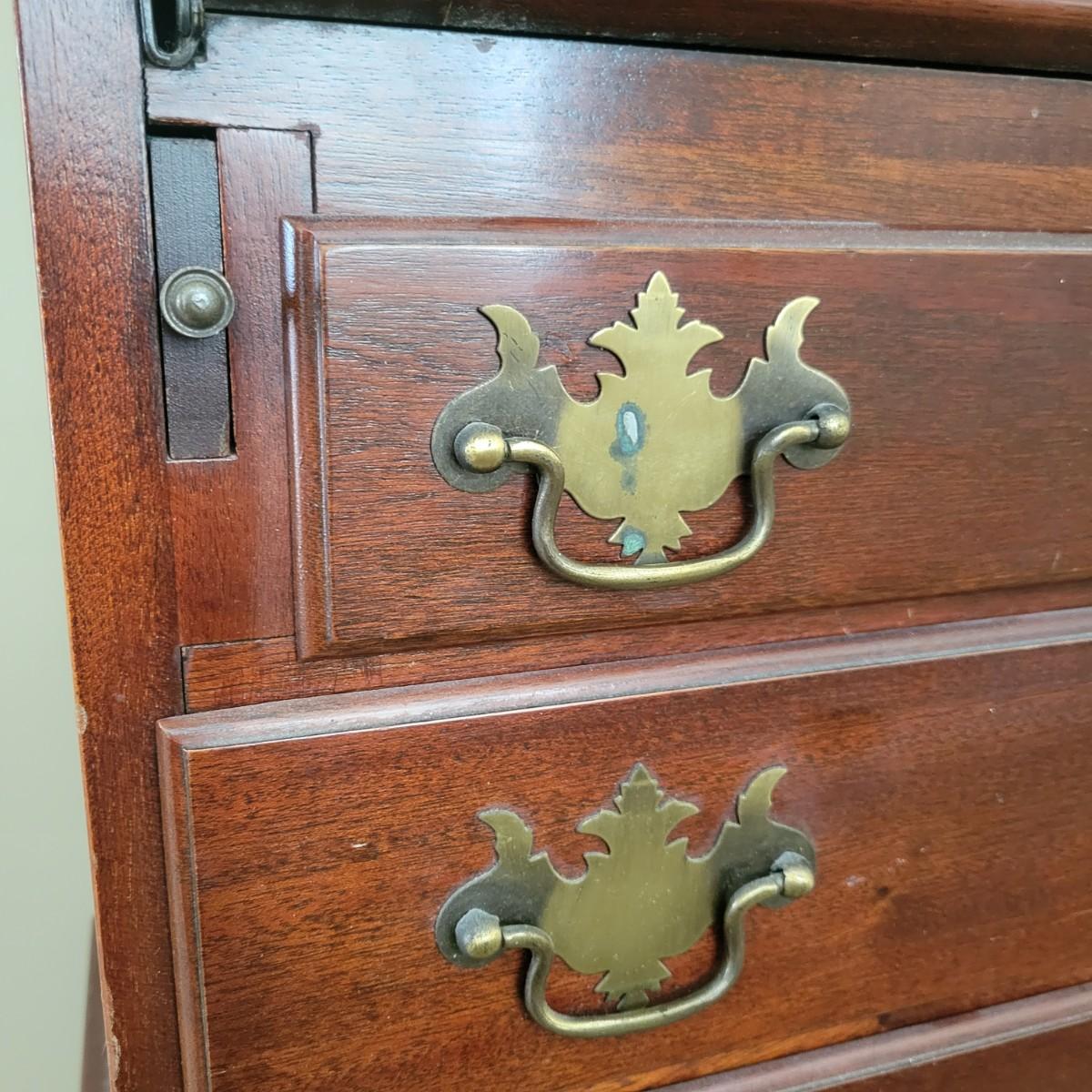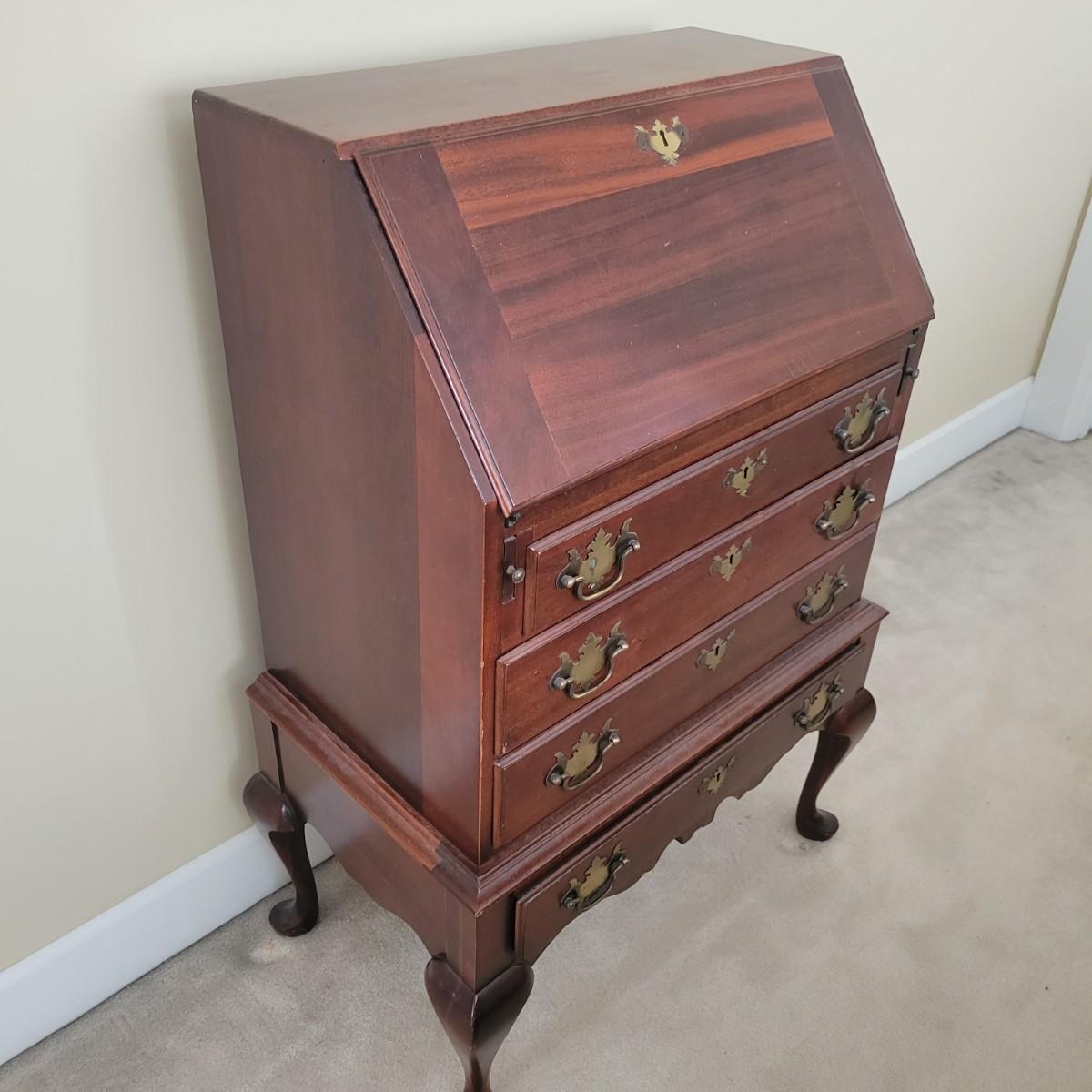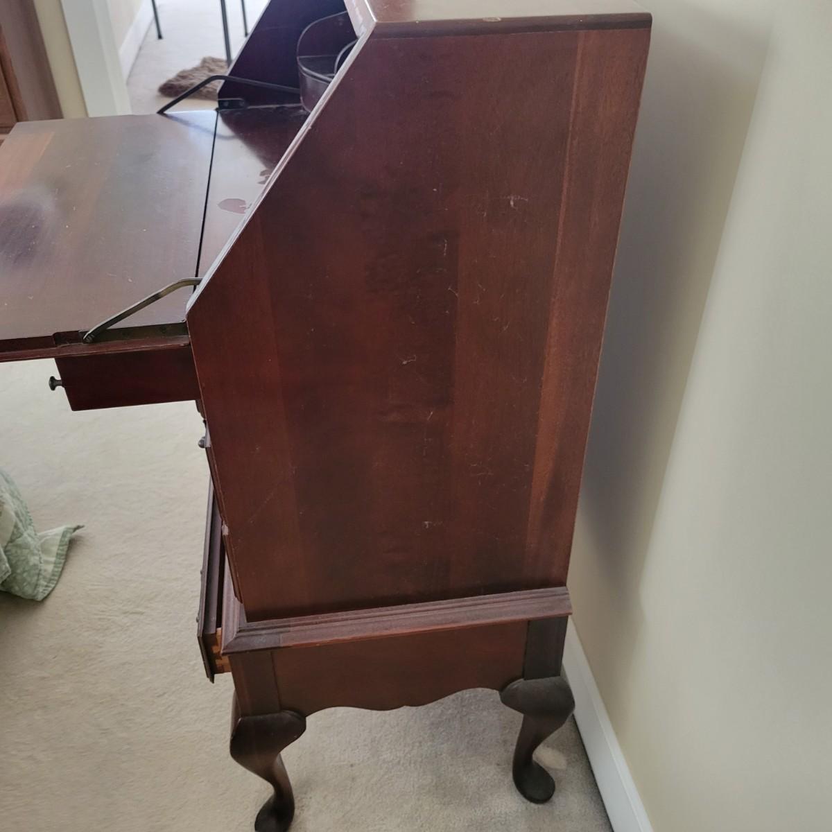 A solid wood with a rich cherry-colored stain that features four drawers and brass hardware. Its top folds down to create a writing surface and reveals three drawers and multiple nooks. There is no key for the locking mechanism. Measures approximately 26" x 15" x 39.5". The secretary is mostly in good condition with some blemishes and scratches that are shown in the pictures. Local pickup only. Winning bidder will need to bring assistance to move and there is also a set of stairs to navigate.
