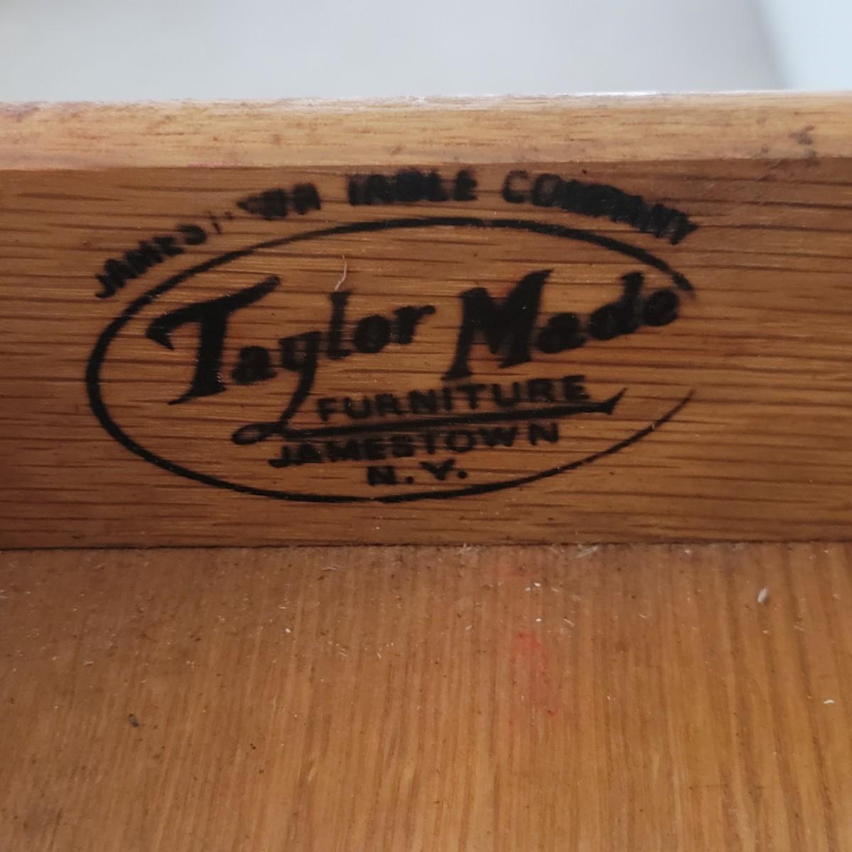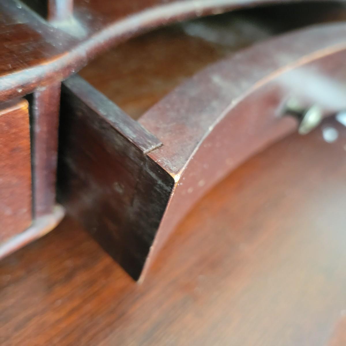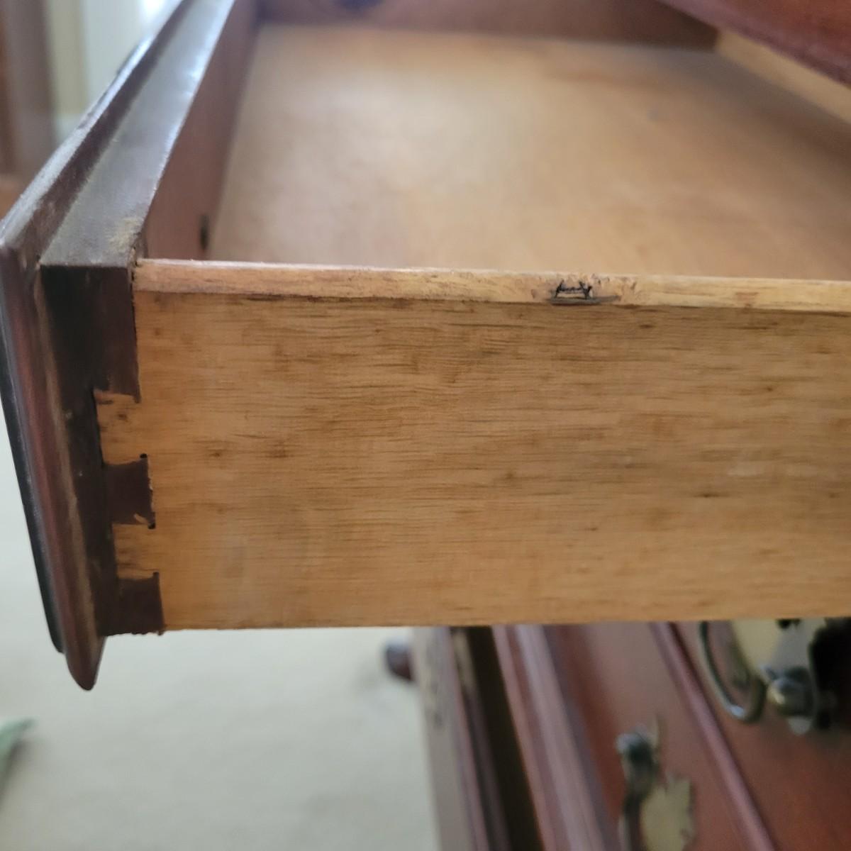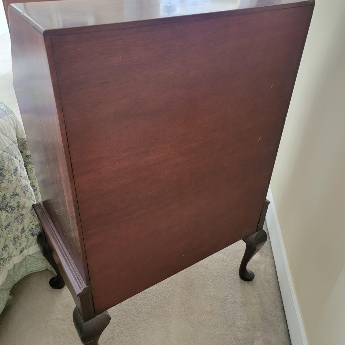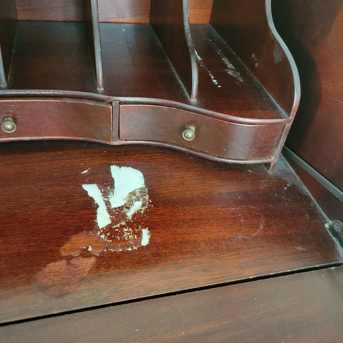 A solid wood with a rich cherry-colored stain that features four drawers and brass hardware. Its top folds down to create a writing surface and reveals three drawers and multiple nooks. There is no key for the locking mechanism. Measures approximately 26" x 15" x 39.5". The secretary is mostly in good condition with some blemishes and scratches that are shown in the pictures. Local pickup only. Winning bidder will need to bring assistance to move and there is also a set of stairs to navigate.