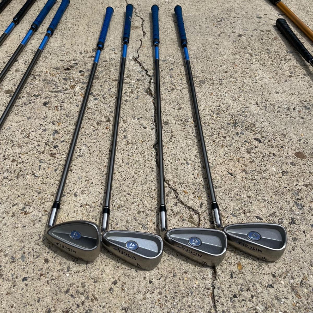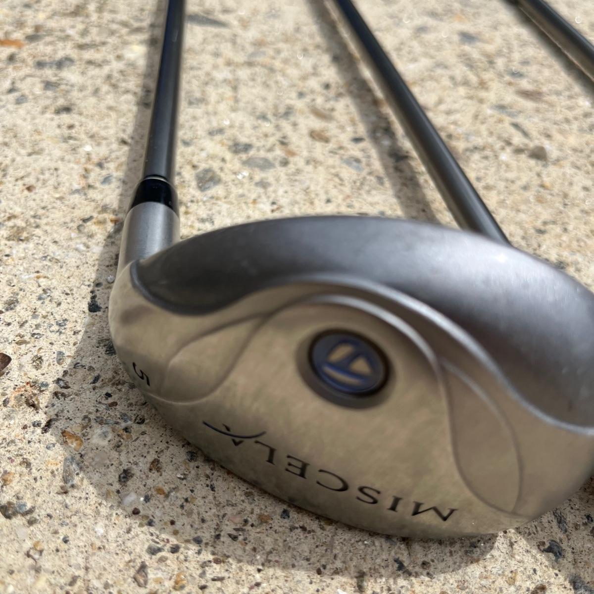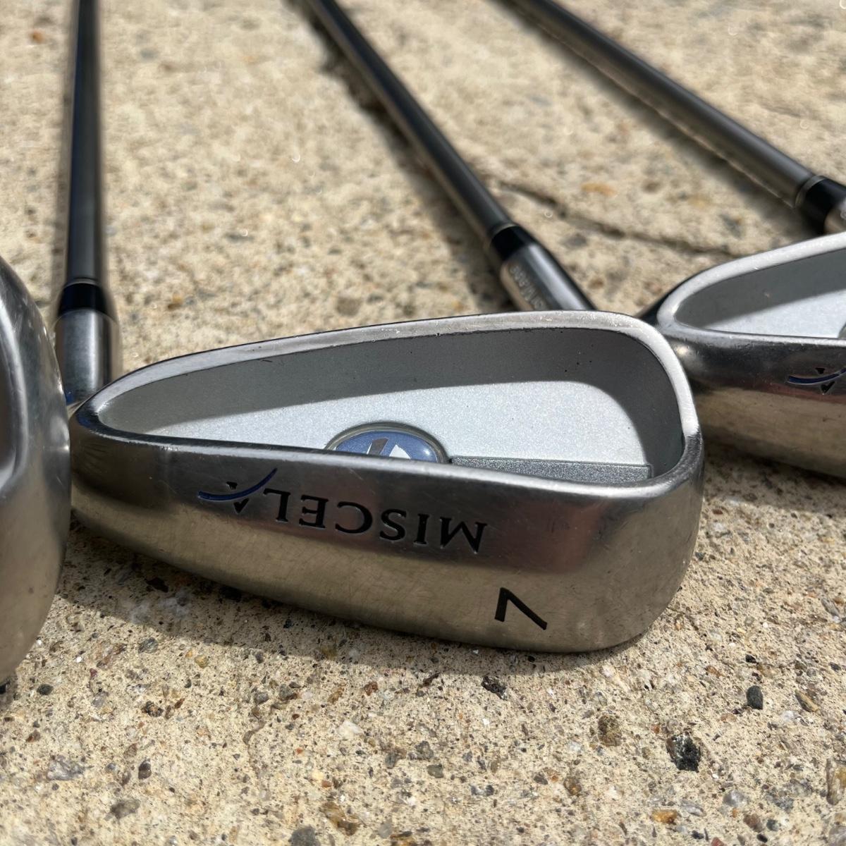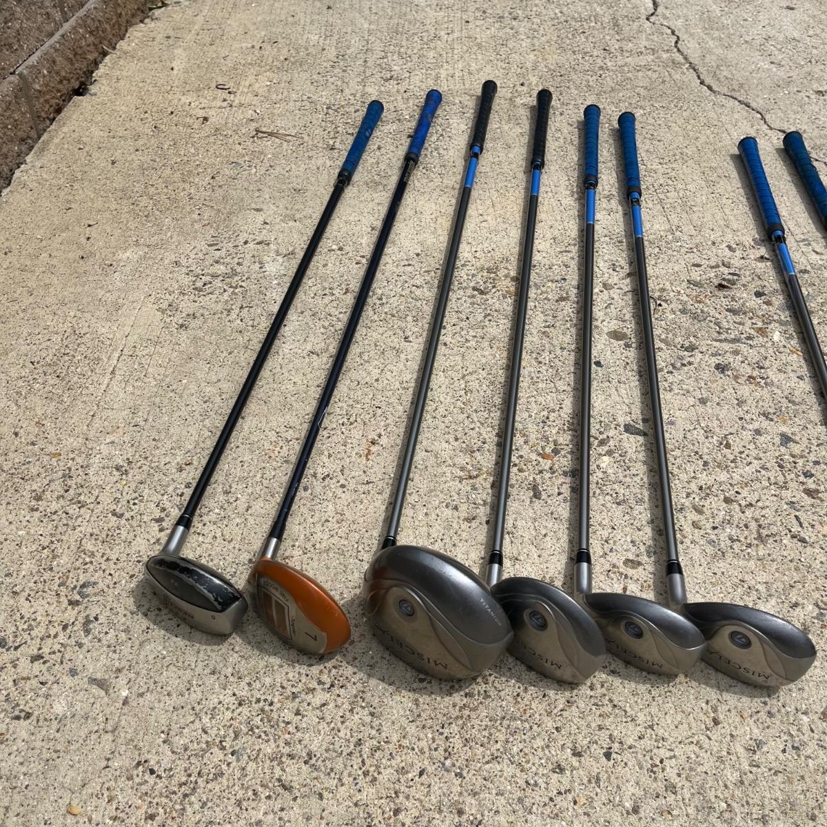 Lot includes ladies Miscela 7,8,9 irons and sand wedge, Miscela 1,3,5,6 woods, Taylor Made 5 wood , True Temper 7 wood, umbrella, ball pick up, bag and ball markers. Longest club measures 44” long.