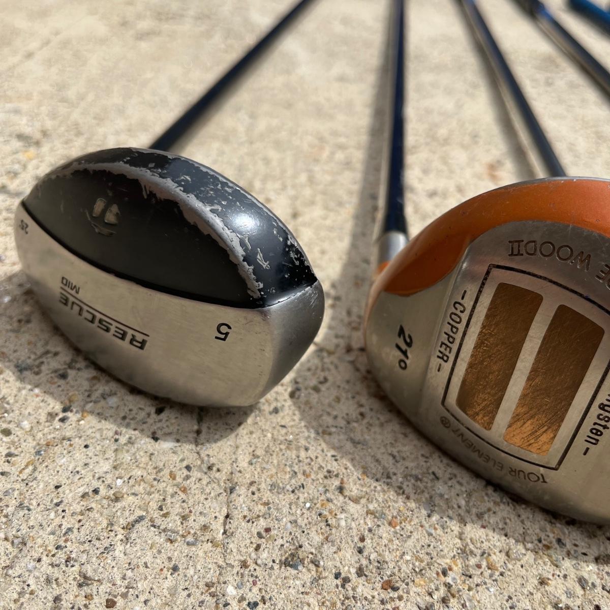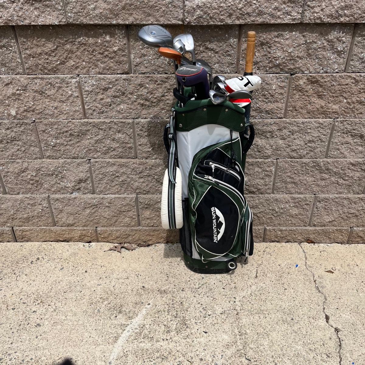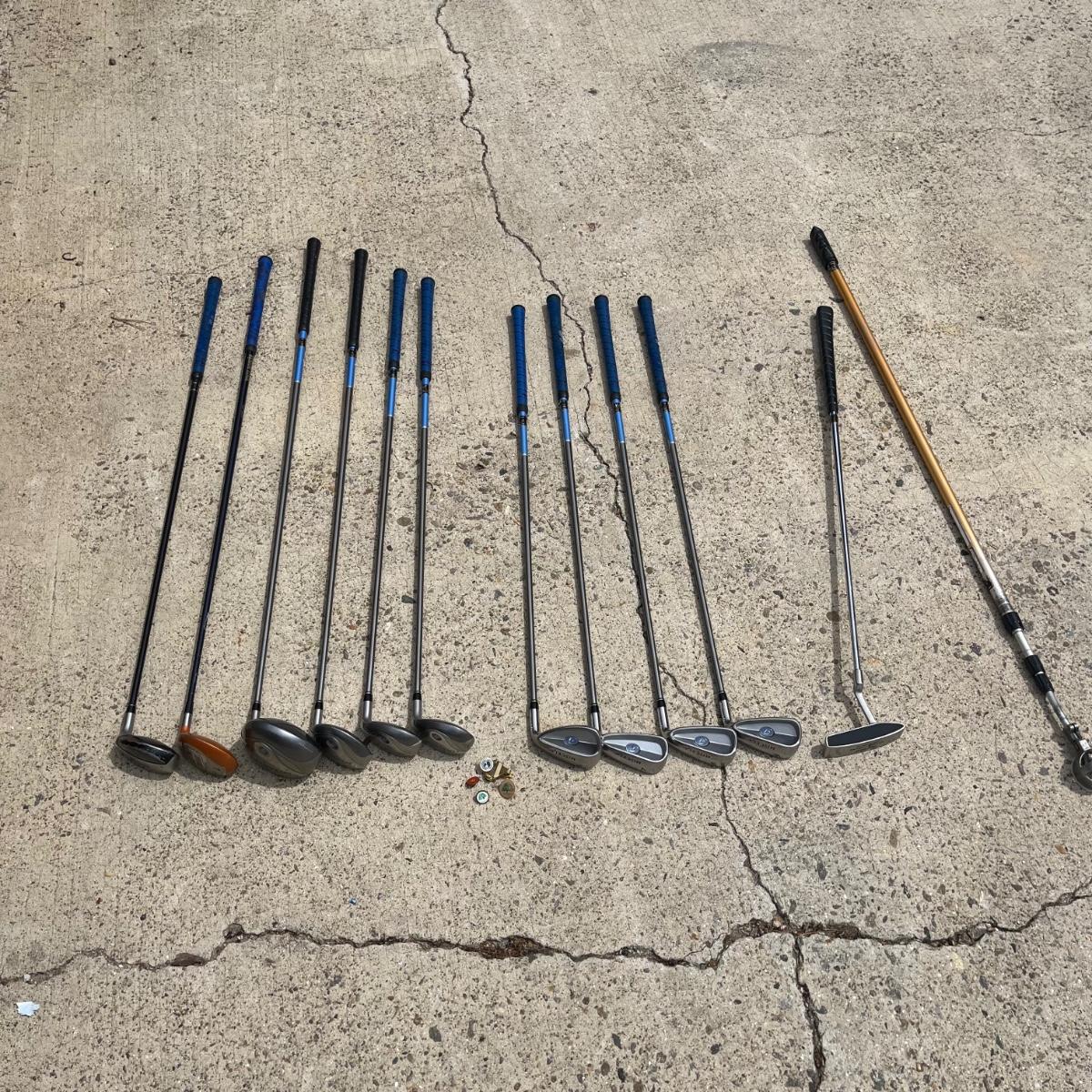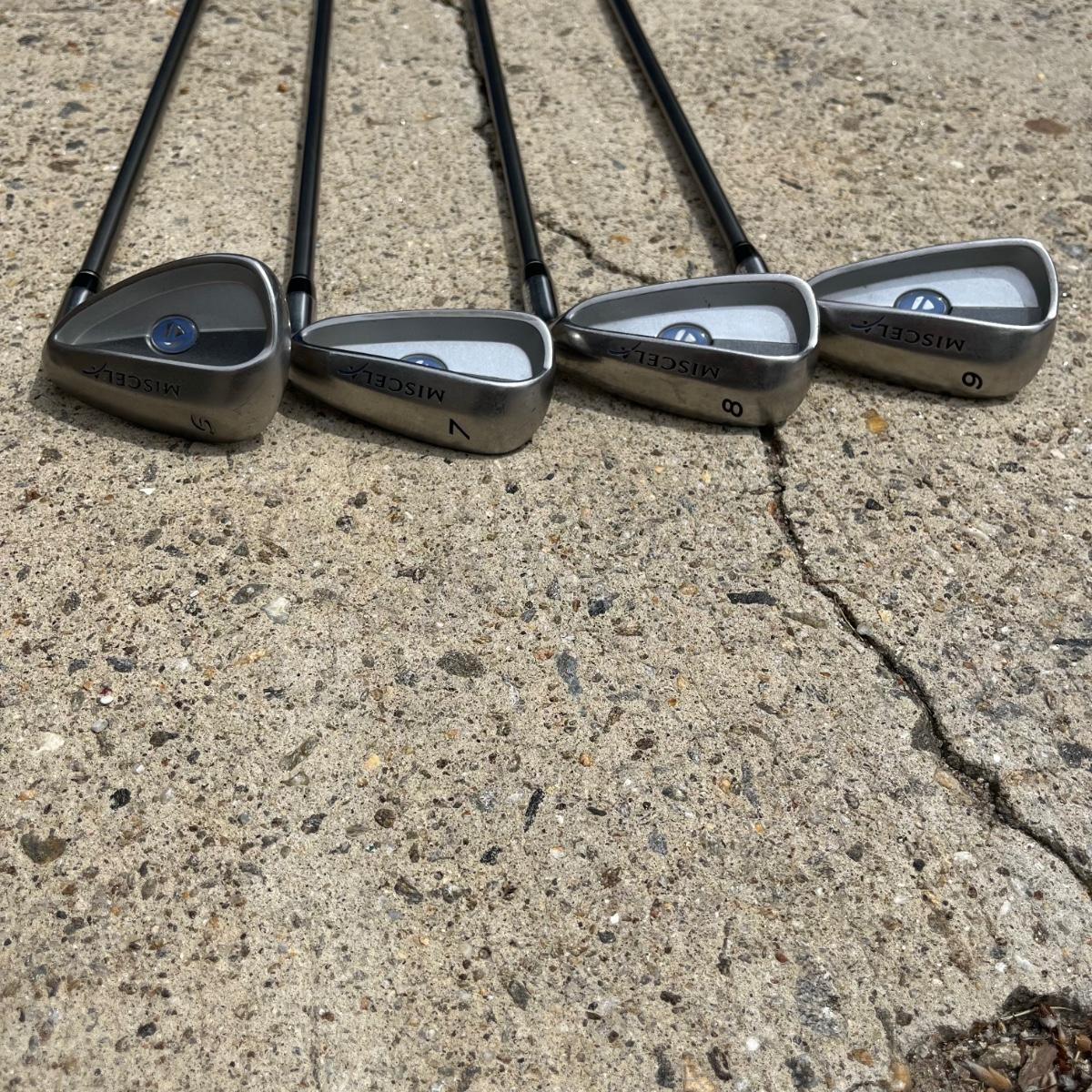 Lot includes ladies Miscela 7,8,9 irons and sand wedge, Miscela 1,3,5,6 woods, Taylor Made 5 wood , True Temper 7 wood, umbrella, ball pick up, bag and ball markers. Longest club measures 44” long.
