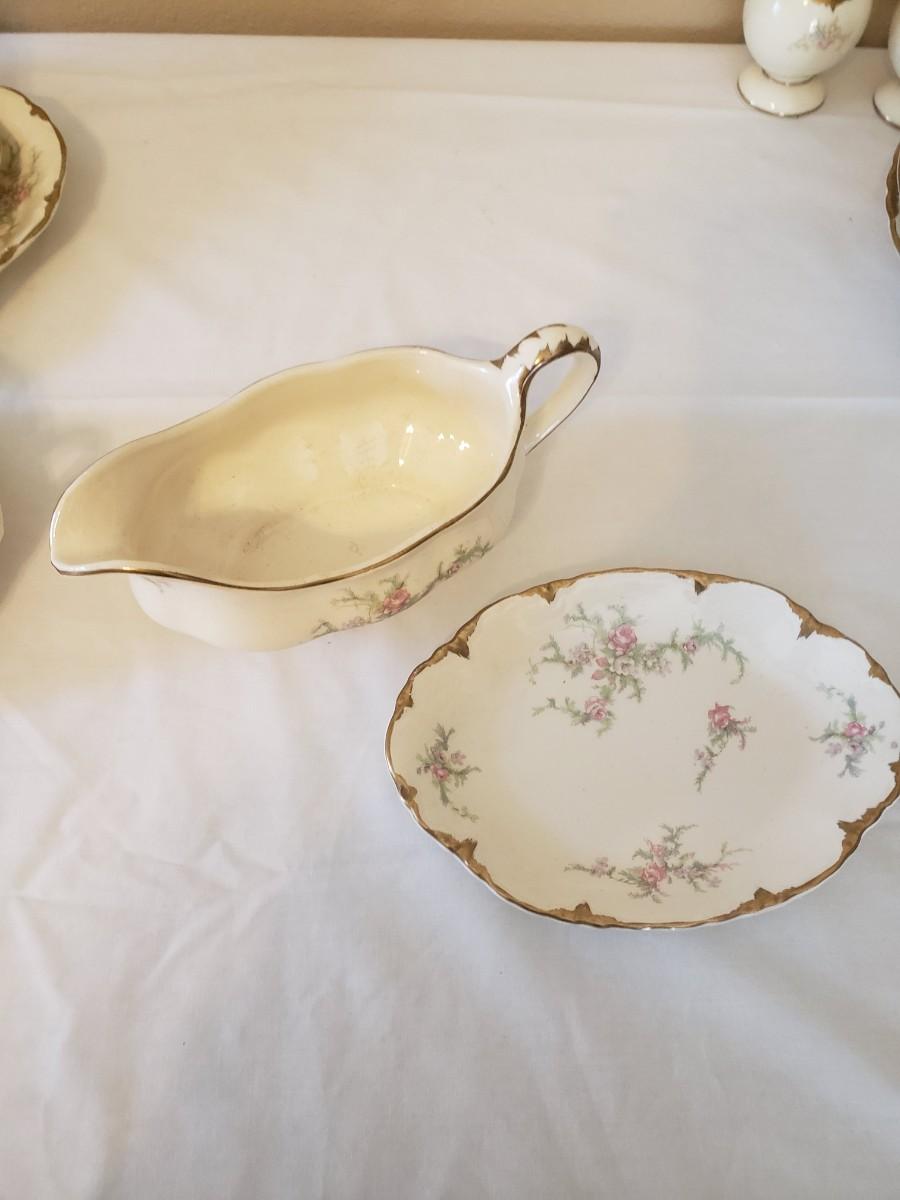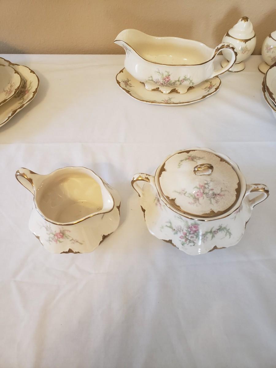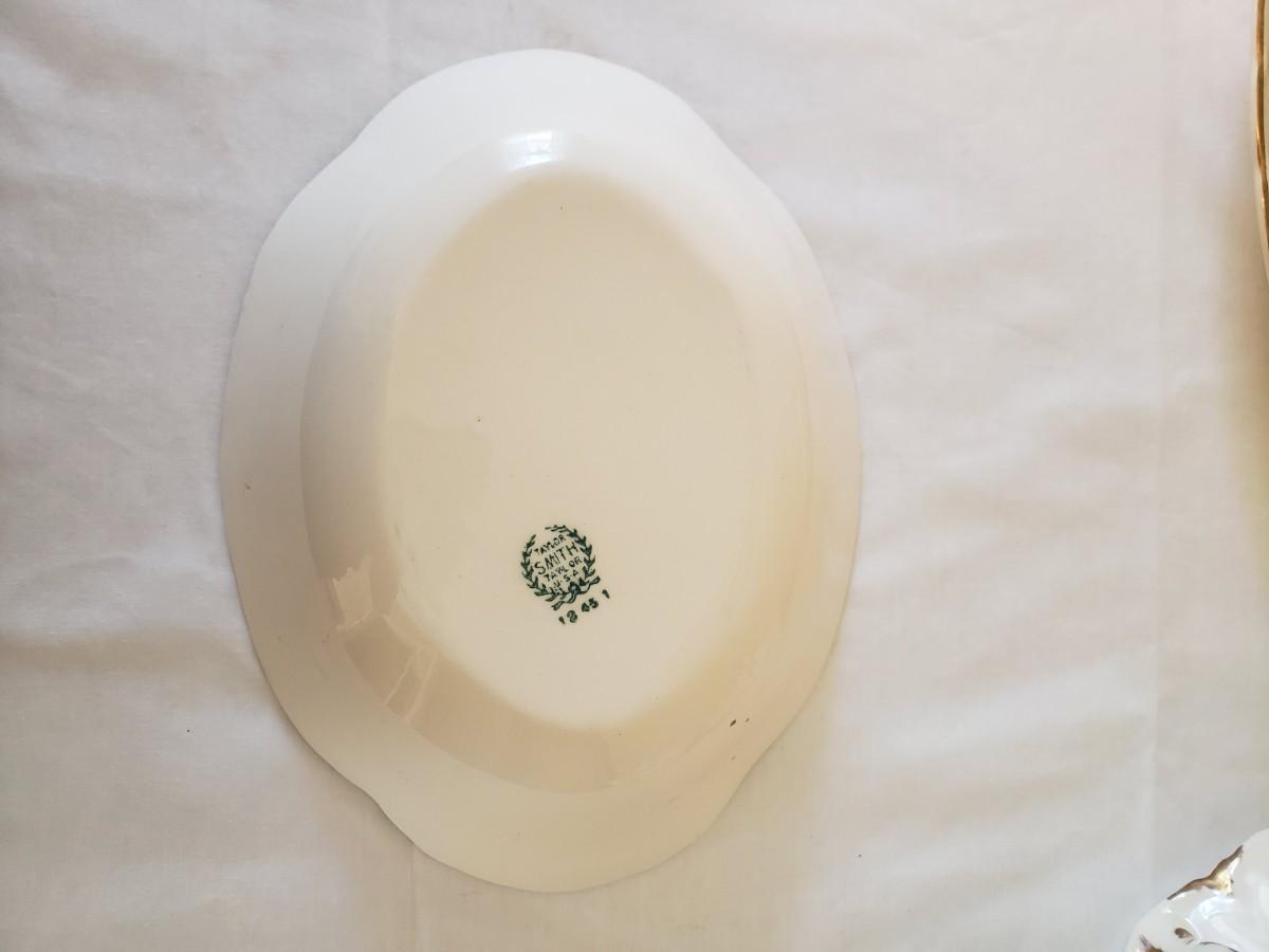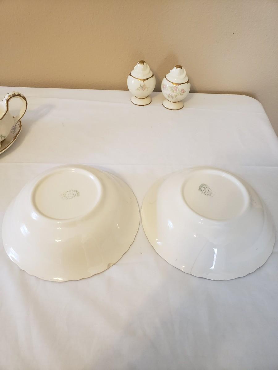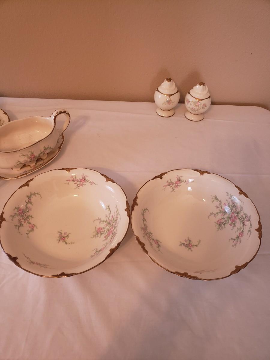 Taylor Smith China "Taylor" serving pieces. 9" oval platter; 11"& 13" oval platters; covered sugar bowl & creamer; 7" gravy boat with 7.5 " oval saucer; (2) 8" serving bowls & salt & pepper shakers (missing stoppers). Good vintage condition