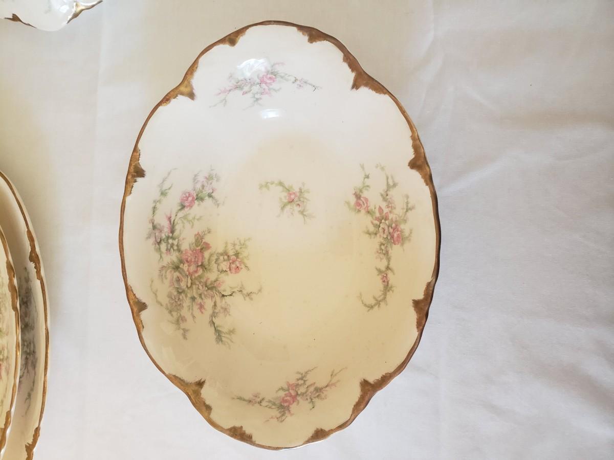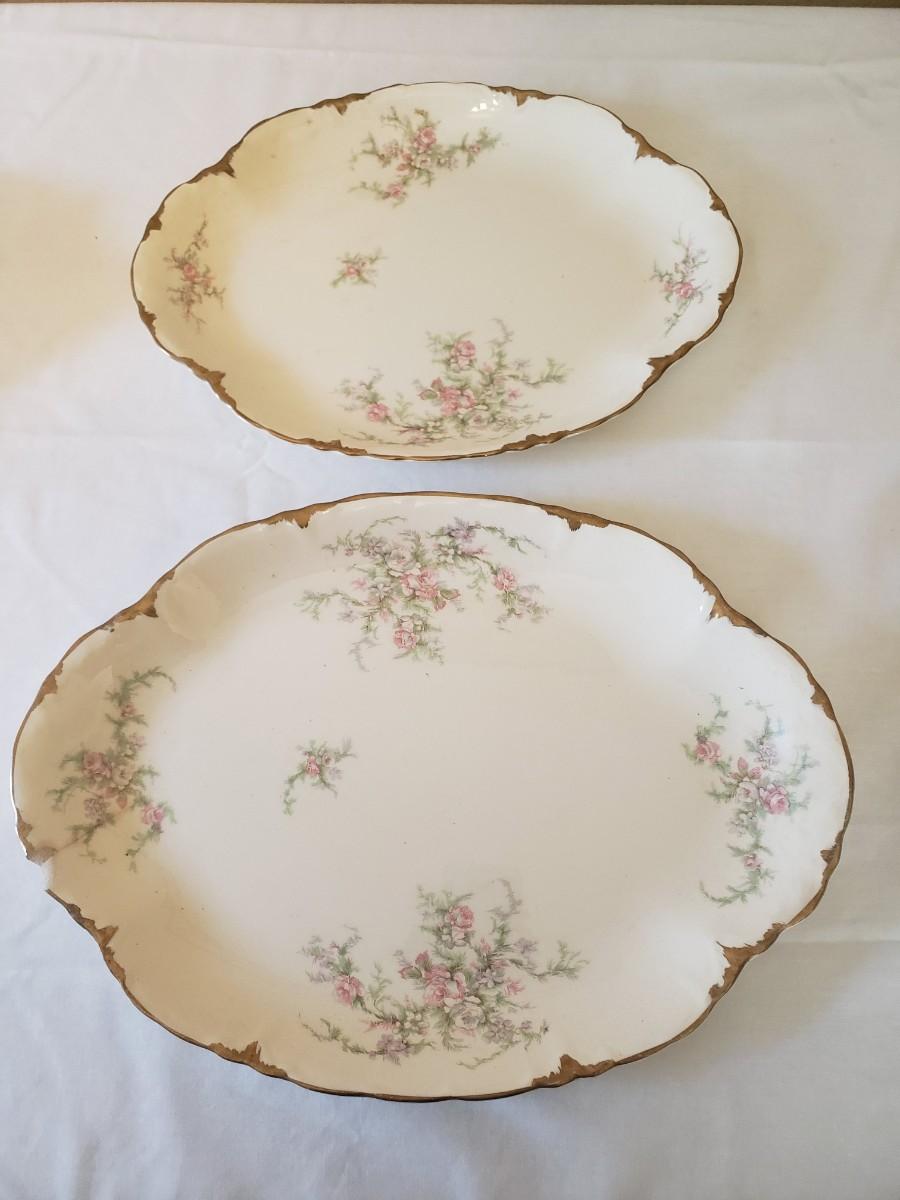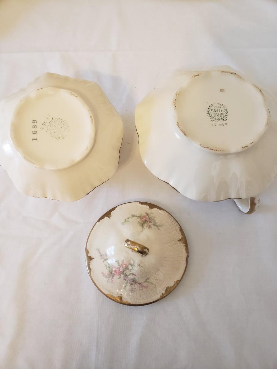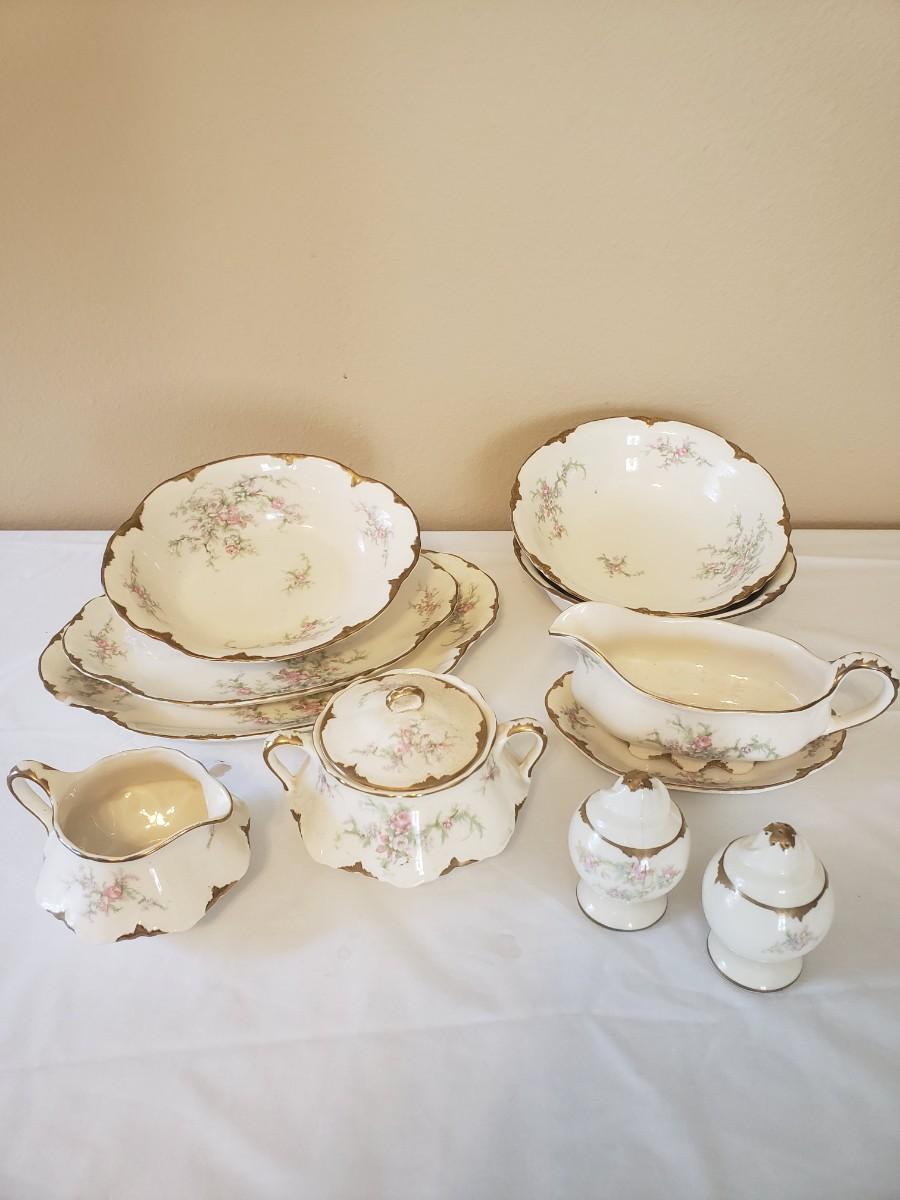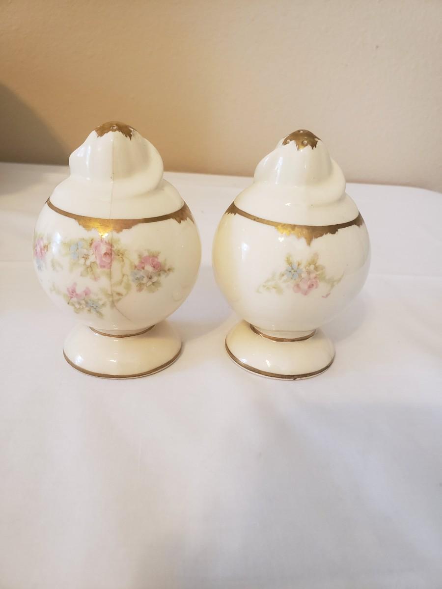 Taylor Smith China "Taylor" serving pieces. 9" oval platter; 11"& 13" oval platters; covered sugar bowl & creamer; 7" gravy boat with 7.5 " oval saucer; (2) 8" serving bowls & salt & pepper shakers (missing stoppers). Good vintage condition