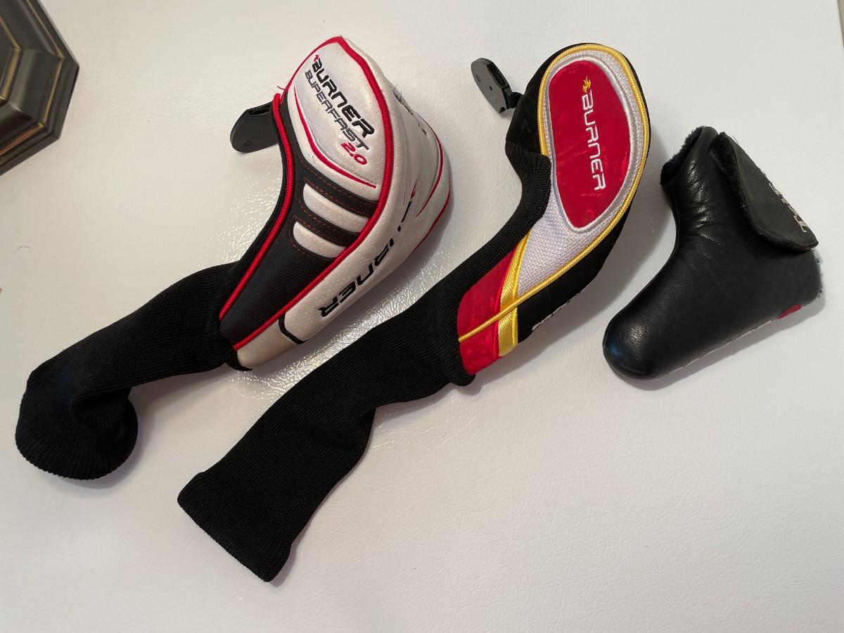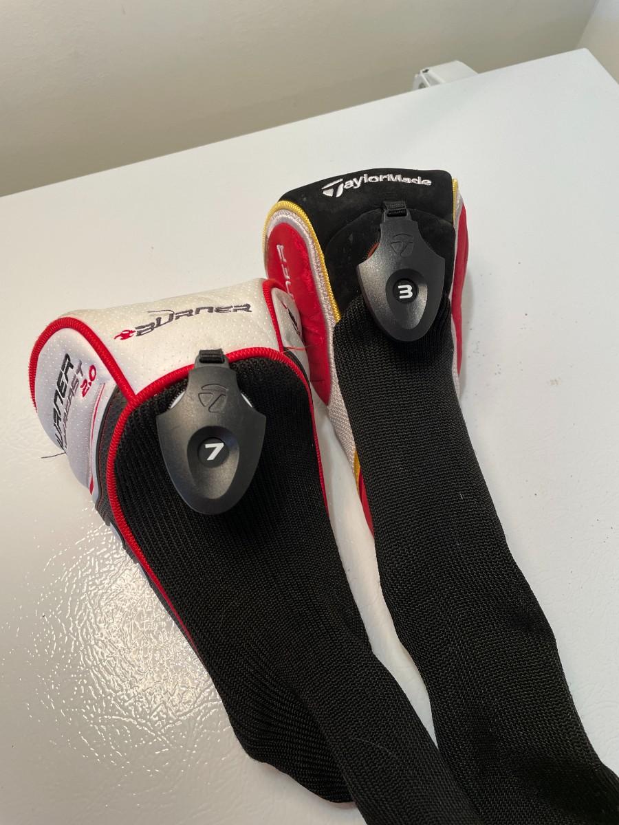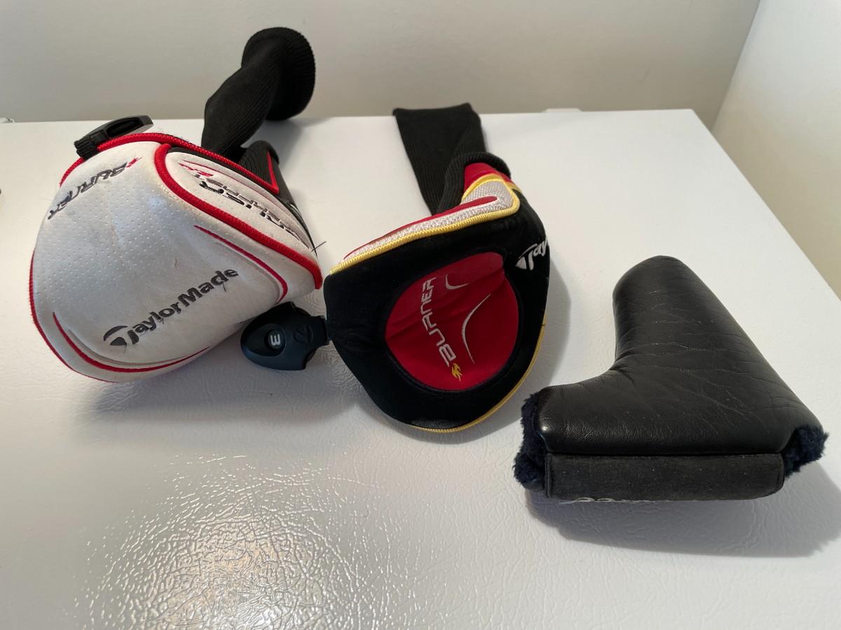 The TaylorMade Burner club head cover and the TaylorMade Superfast 2.0 club head cover have adjustable numbers to spin so that you can cover different clubs. The other is a Odyssey Tri-Force putter head cover