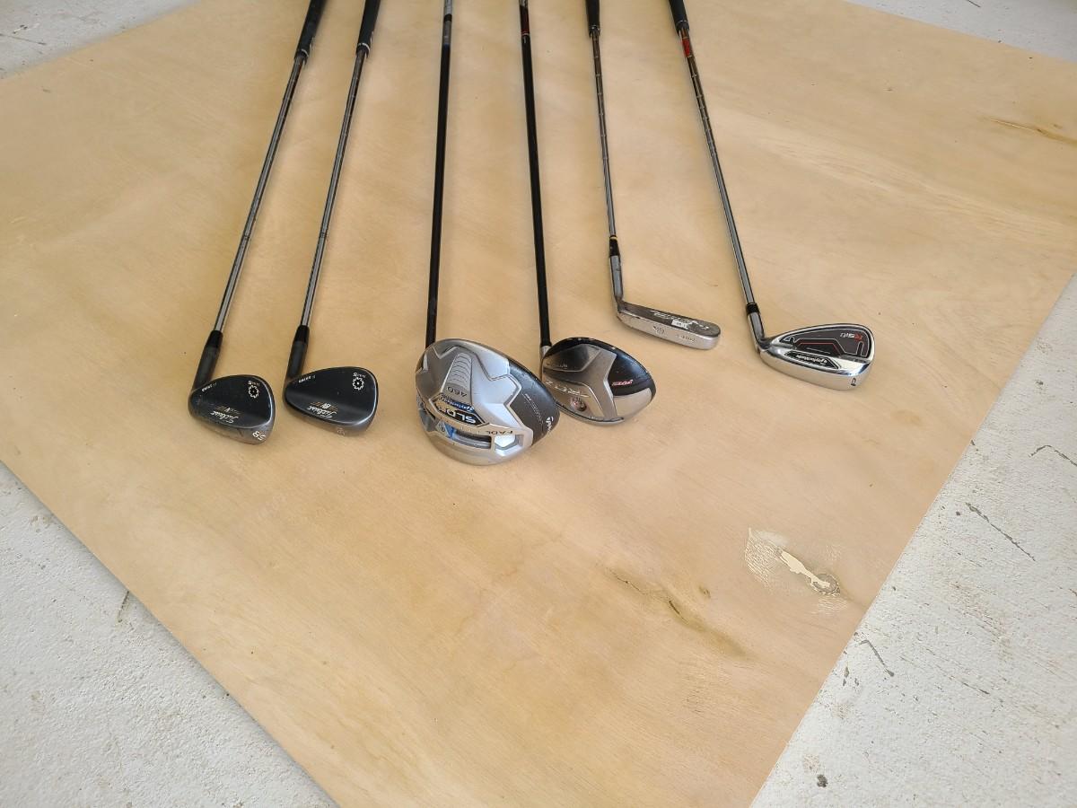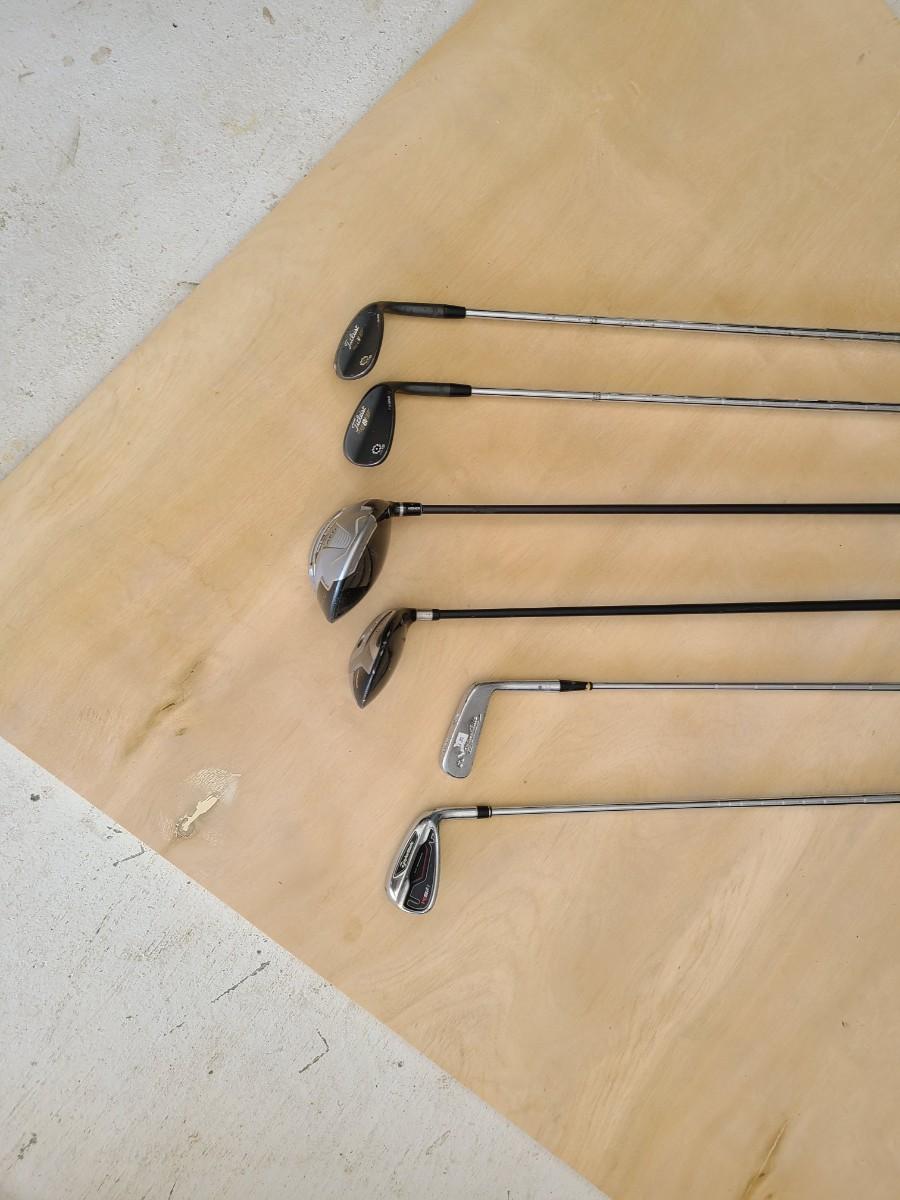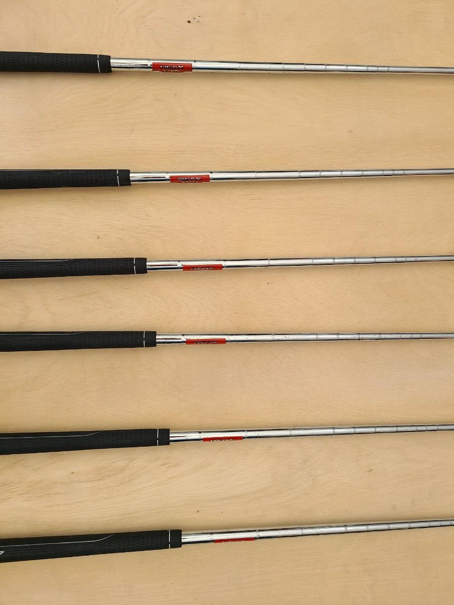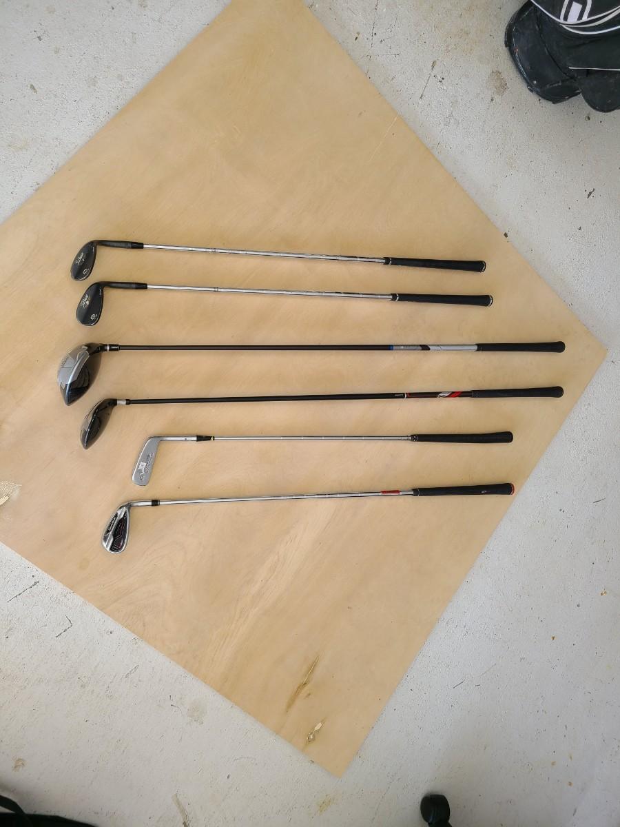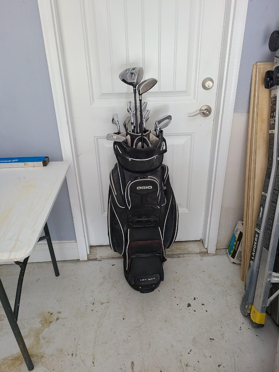 Seven RDi1 Clubs 4 thru 9 and Pitching Wedge. A little pitting on shafts (can be polished). Taylormade driver and 3 wood graphite shafts. Titleist BV SM5 M and F Grind pitching wedges. Piting on these shafts too. Ogio bag is older and worn.