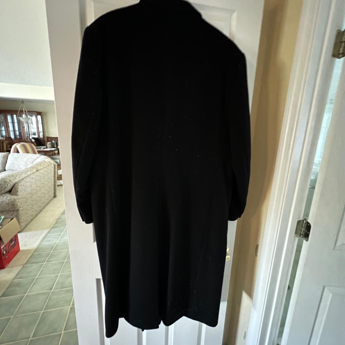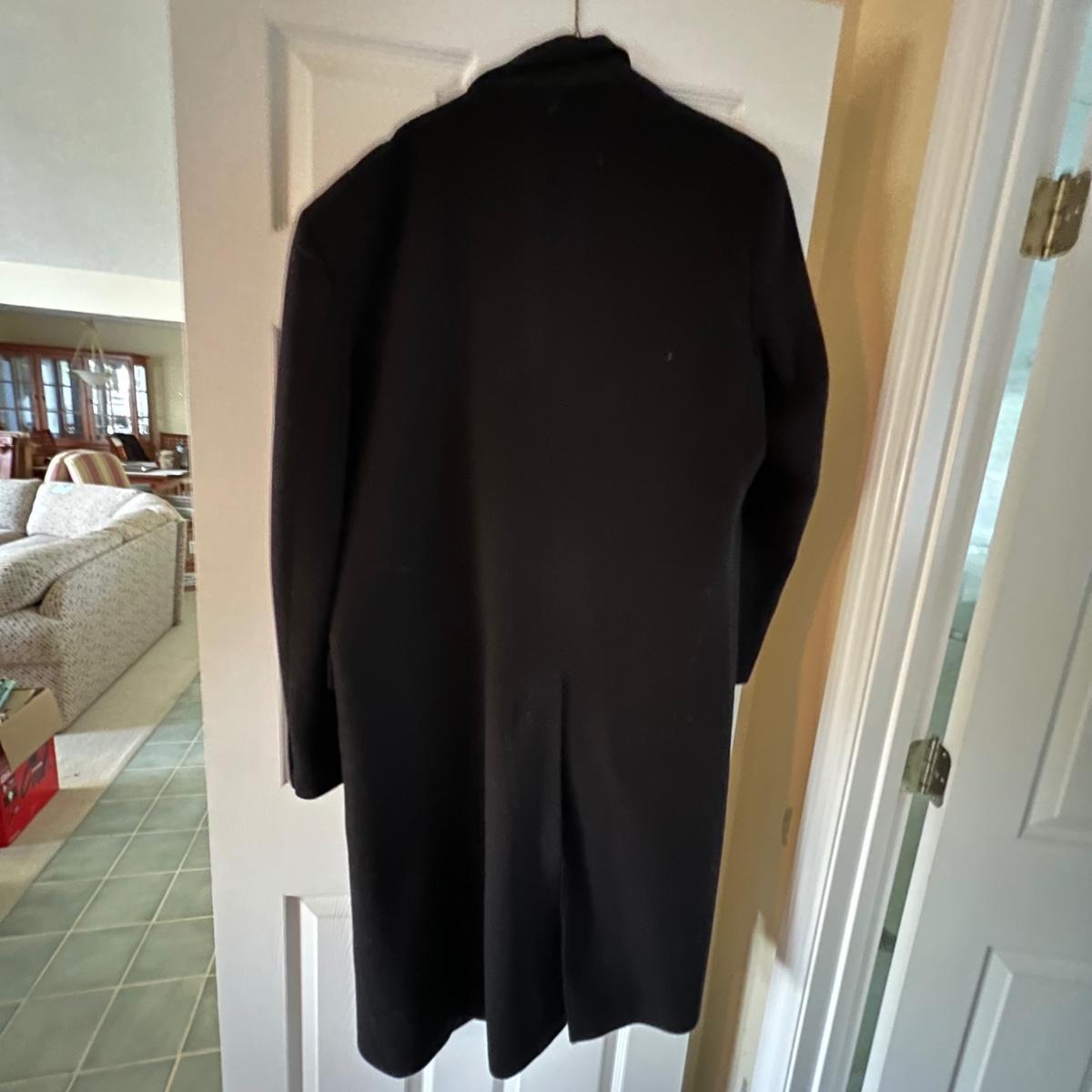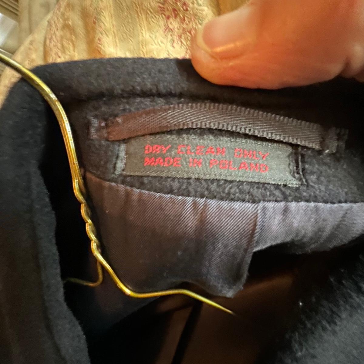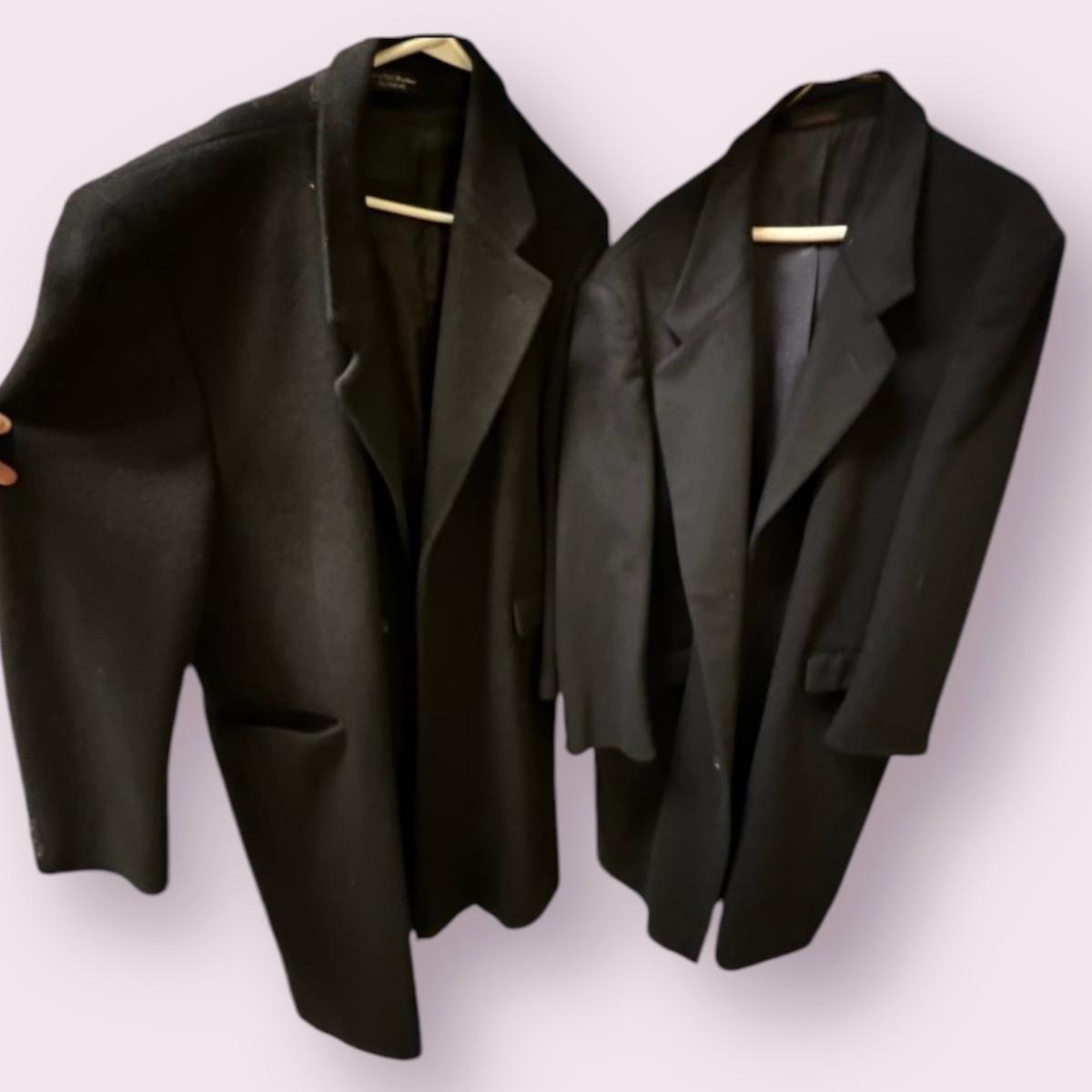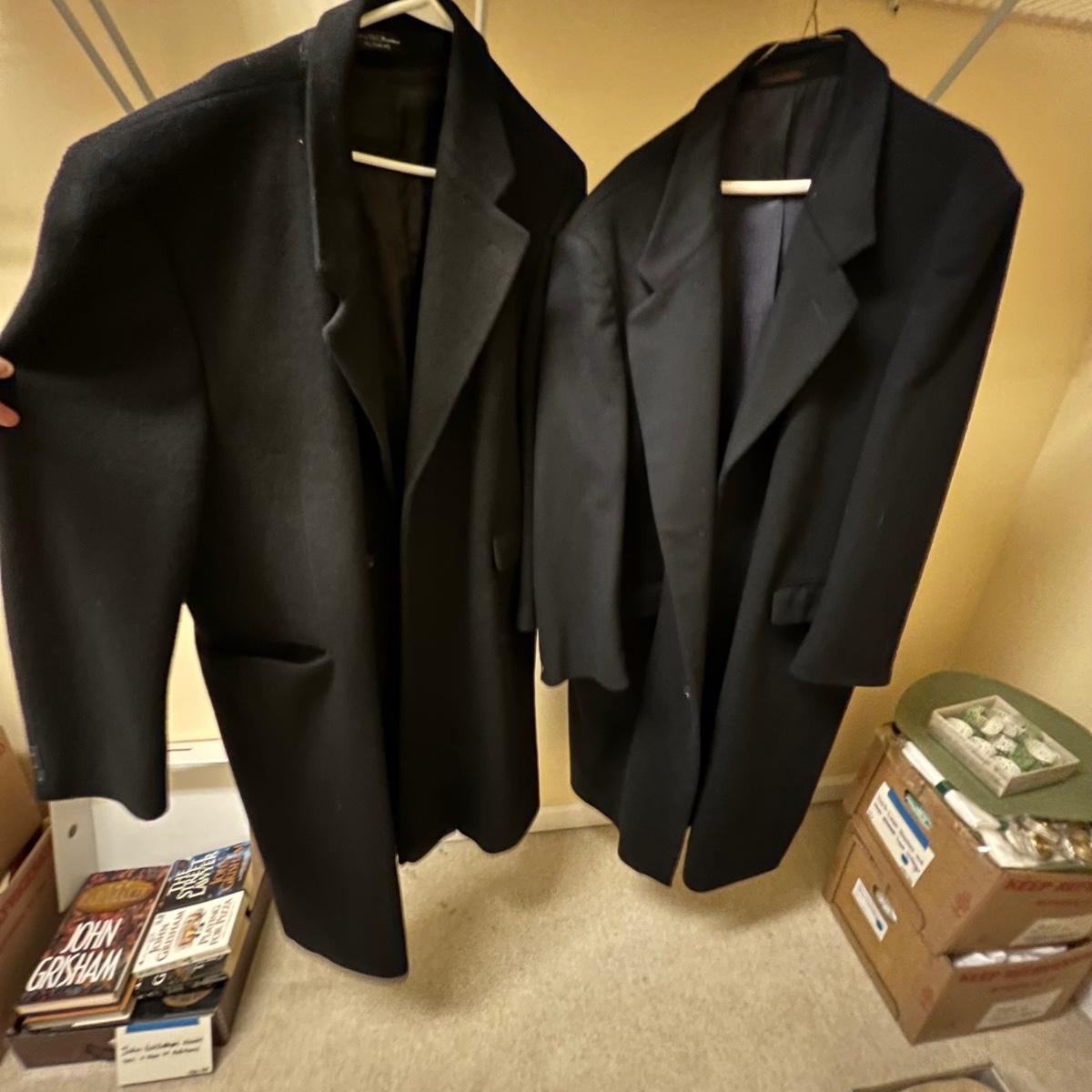 Two wool coats. The black coat is labeled Tailors Row and has another label - Kasper; it measures 24” chest x 48” long. Neither coat have size labels but the dark blue coat appears to be a similar size; only label found on this coat is Made in Poland. It appears to be wool but we cannot guarantee it. Note that in images both coats look black but the coat Made in Poland is a very dark blue.