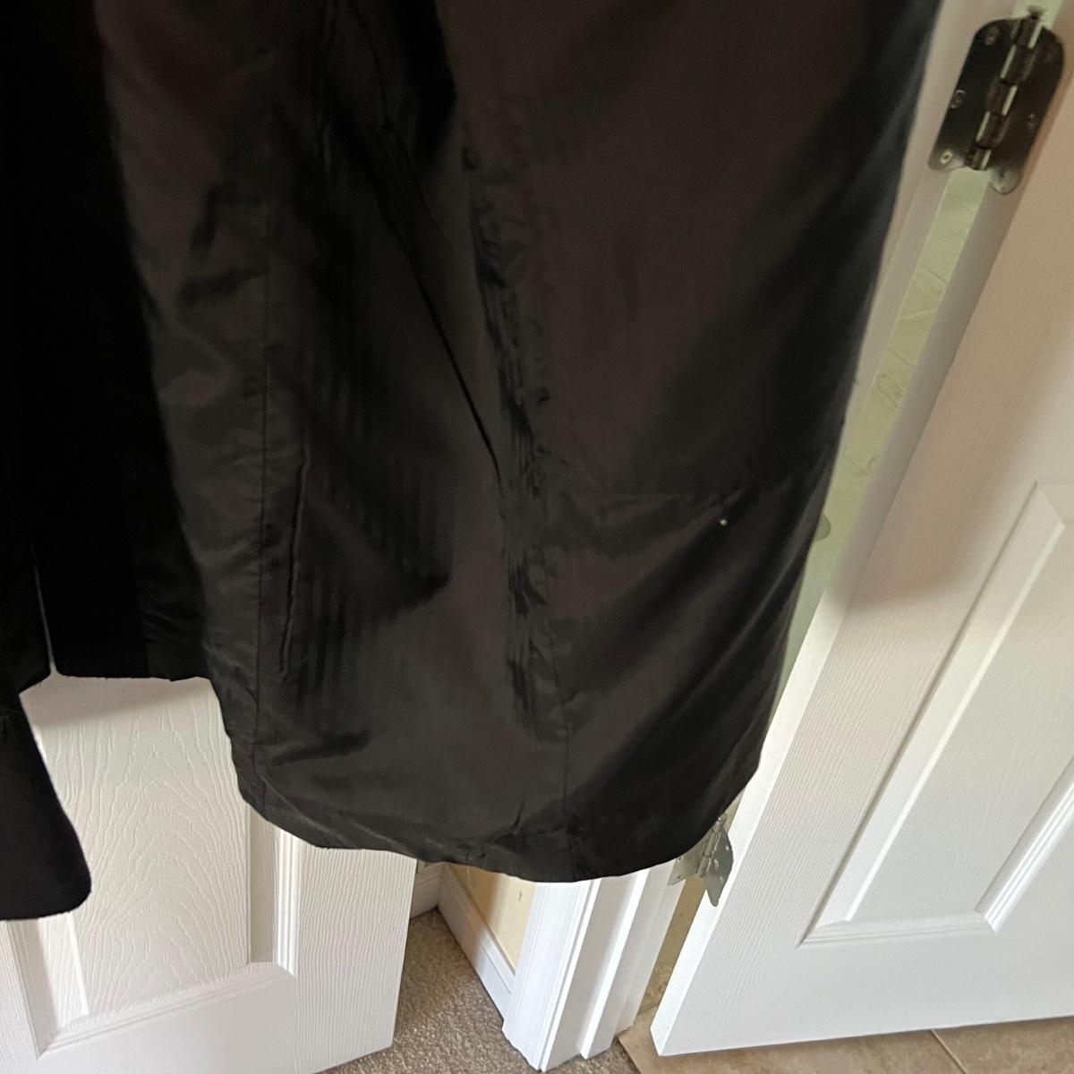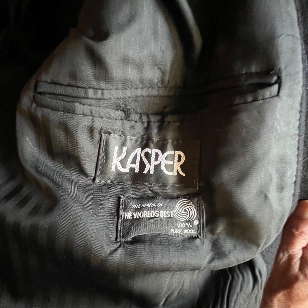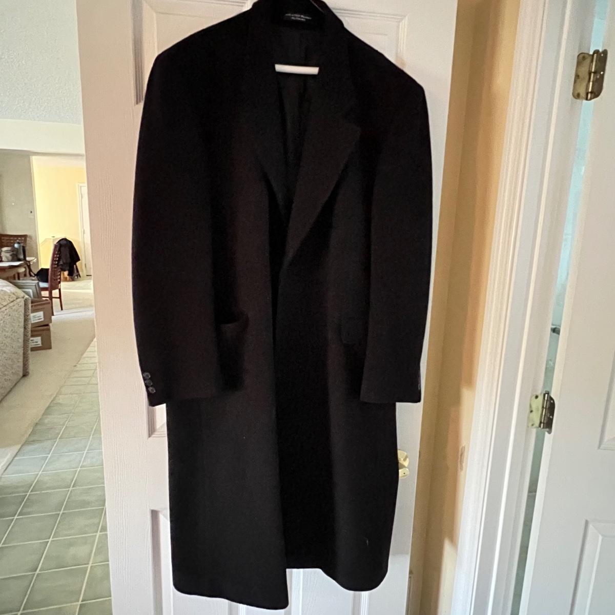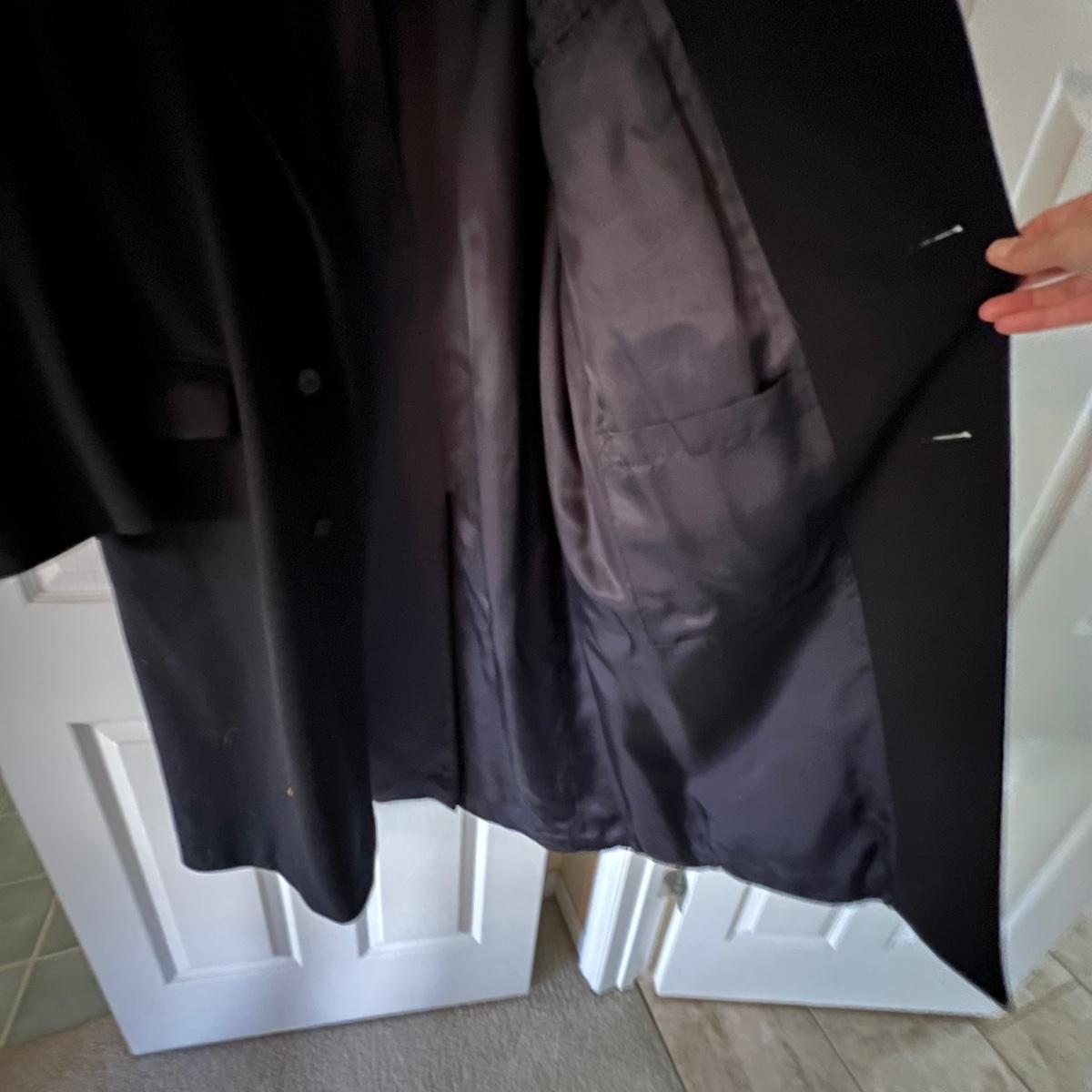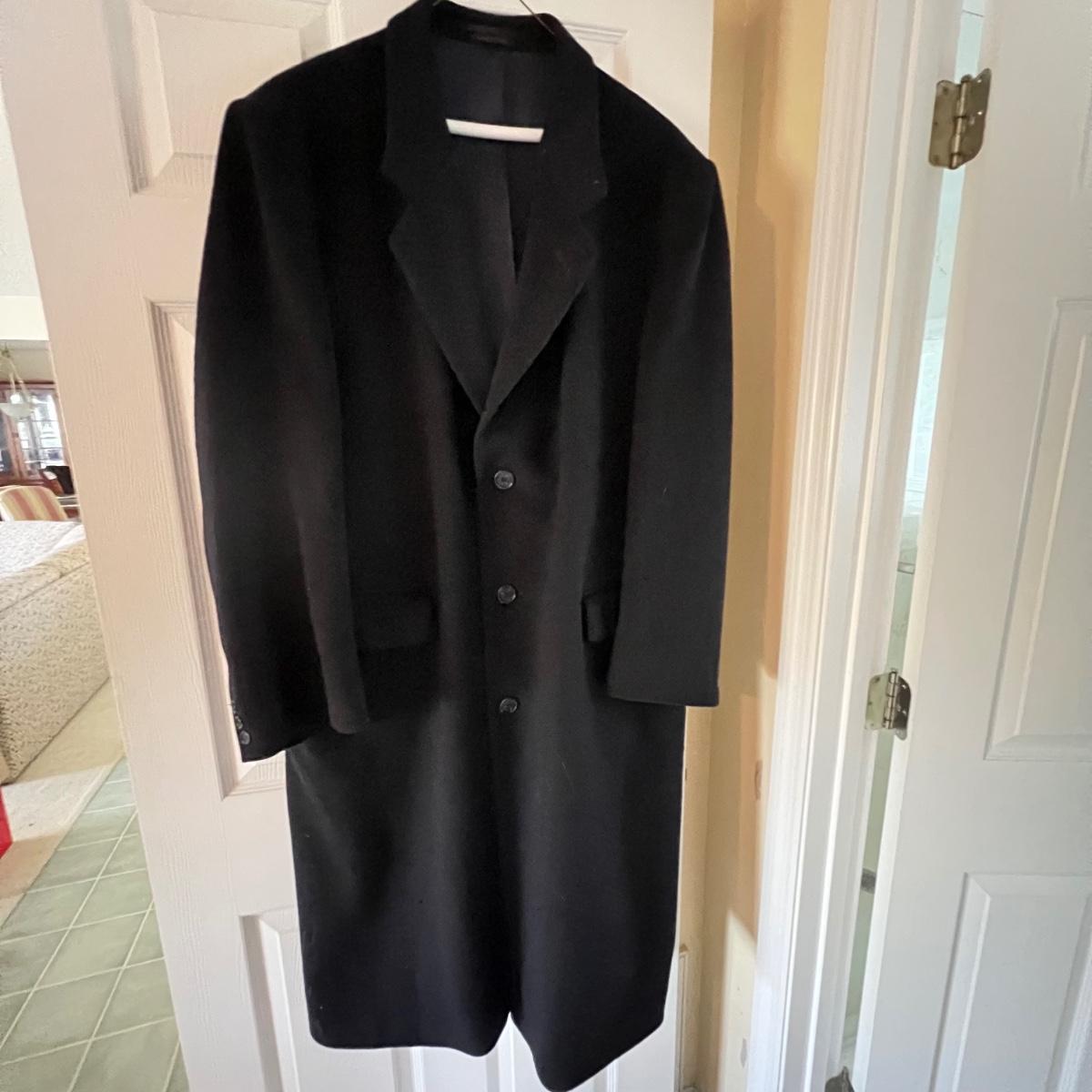 Two wool coats. The black coat is labeled Tailors Row and has another label - Kasper; it measures 24” chest x 48” long. Neither coat have size labels but the dark blue coat appears to be a similar size; only label found on this coat is Made in Poland. It appears to be wool but we cannot guarantee it. Note that in images both coats look black but the coat Made in Poland is a very dark blue.