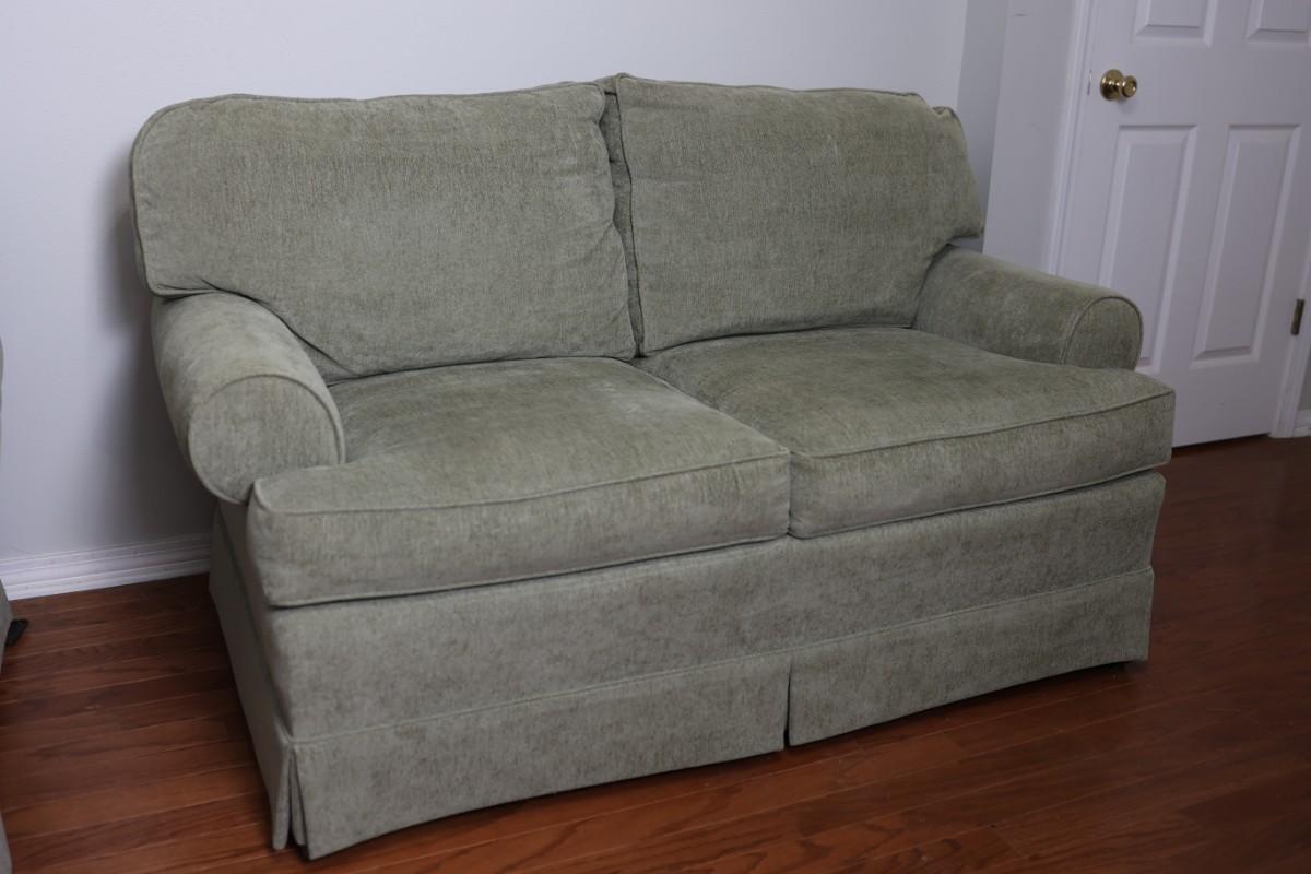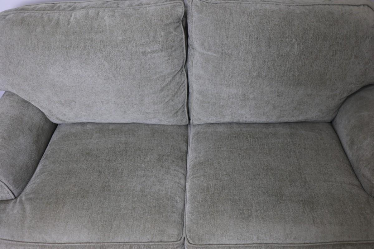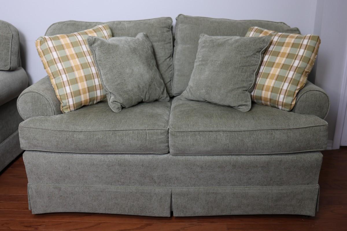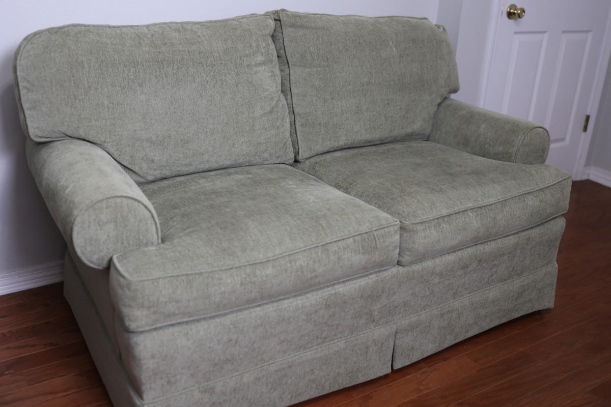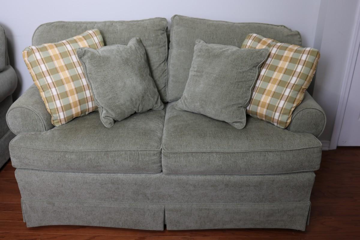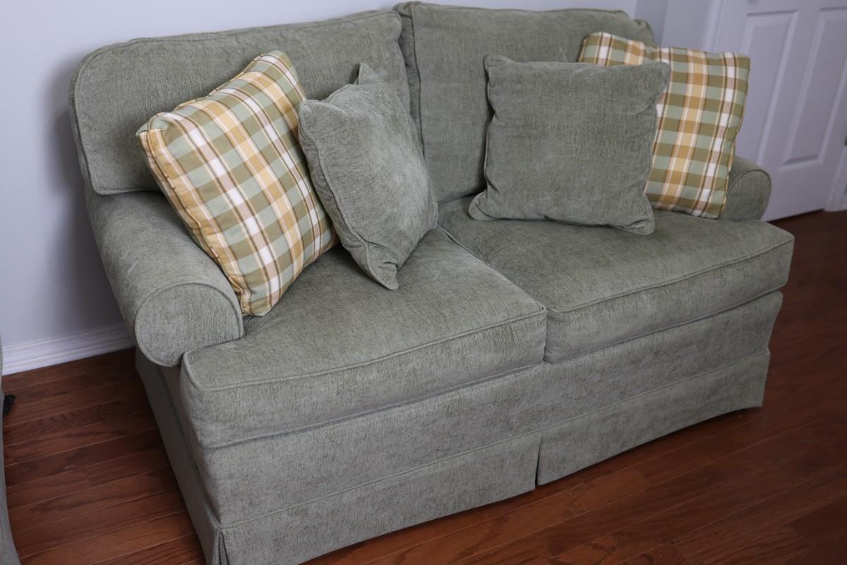 Please see discoloration behind the upper pillows. Besides that, the loveseat is in good condition.