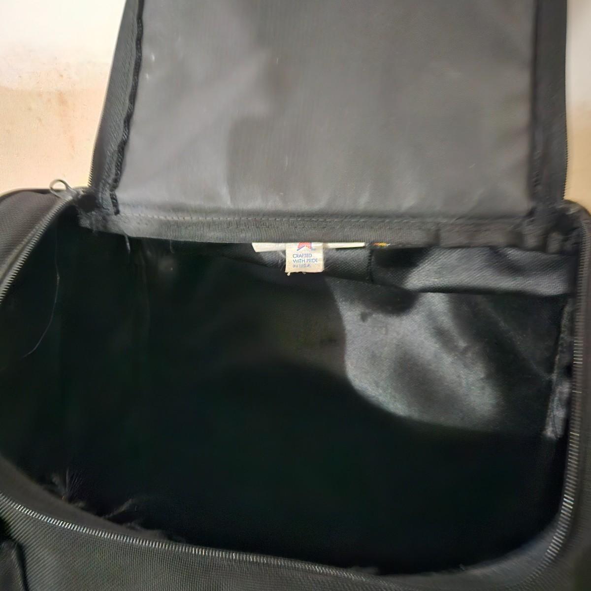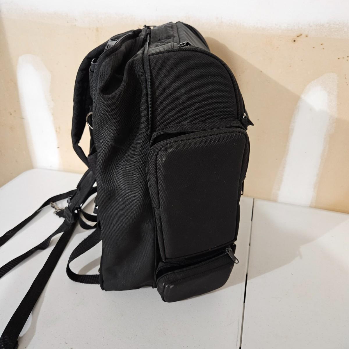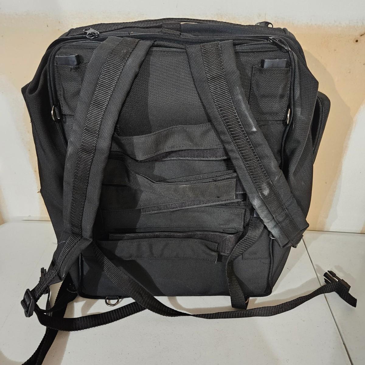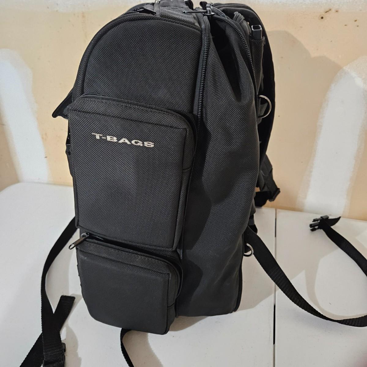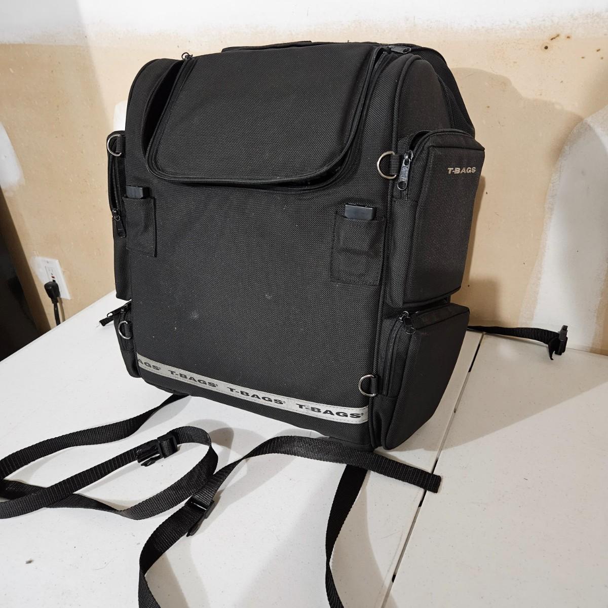 A T-Bags motorcycle tail bag that includes a rain cover. It has a multitude of pockets and storage space and also has shoulder straps to use as a backpack. It measures approximately 18" x 10" x 18"H. Shipping available