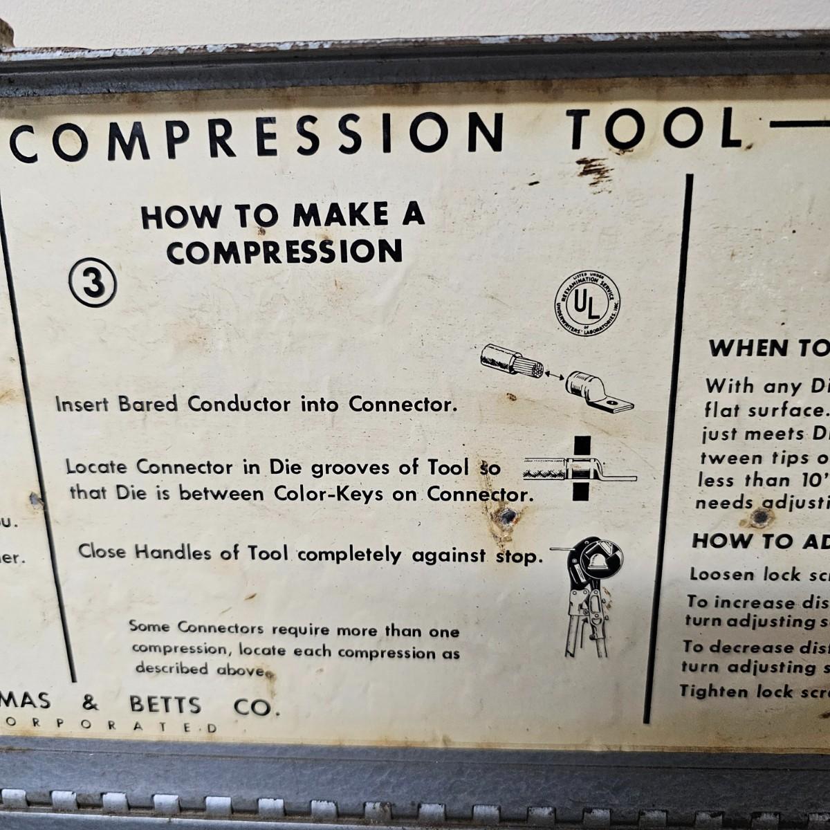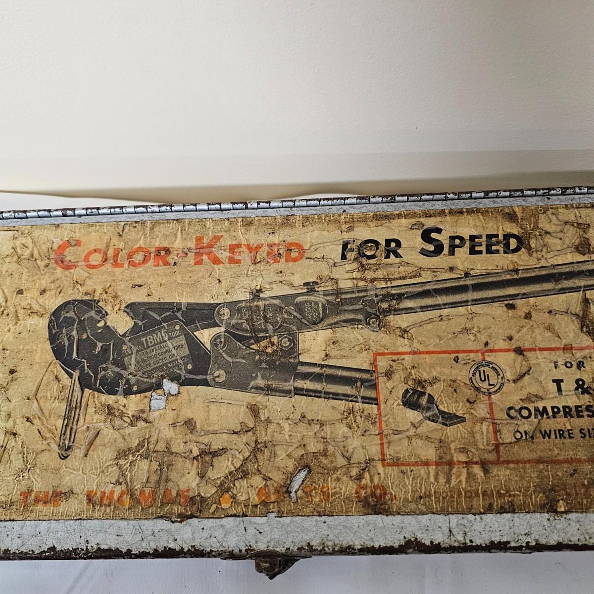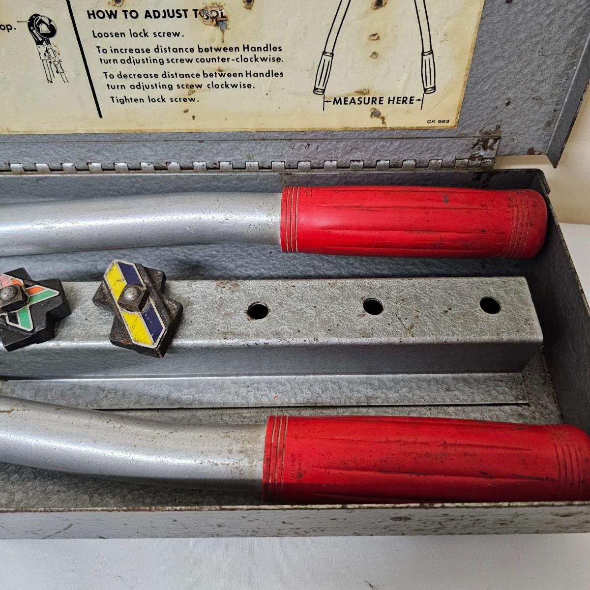 This massive crimping device is/was used to attach copper connectors to large gauge wire. In original steel case, this tool measures 25.5" x 6". Case is badly scarred and scratched from years of being tossed into vehicles but still holding together. See photos for details. Local pickup only.