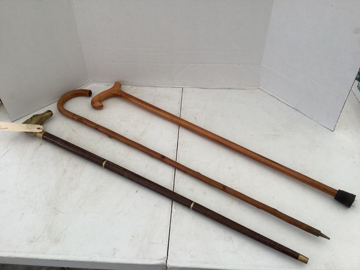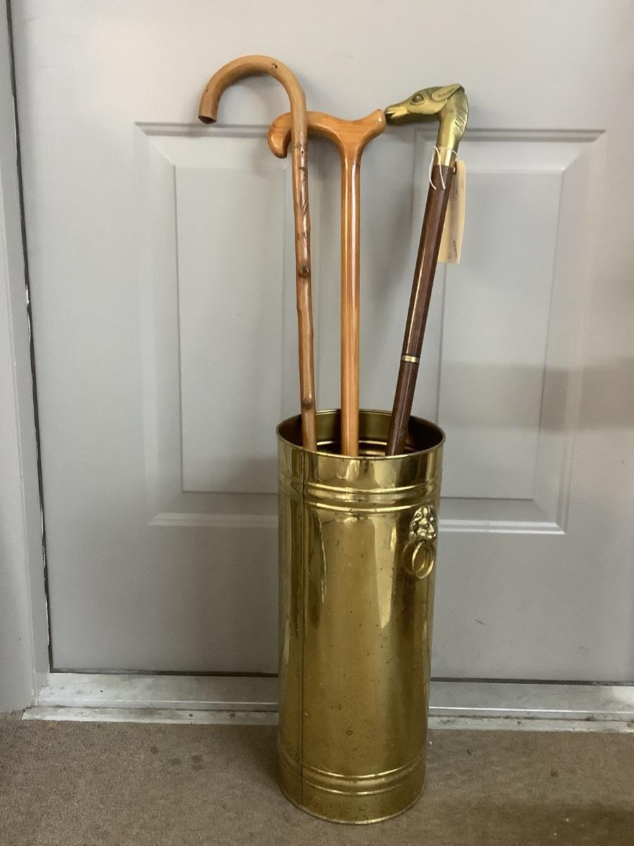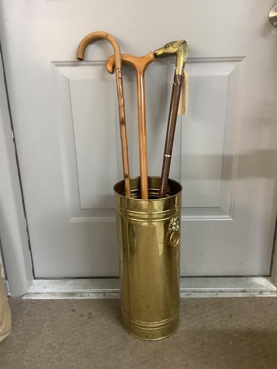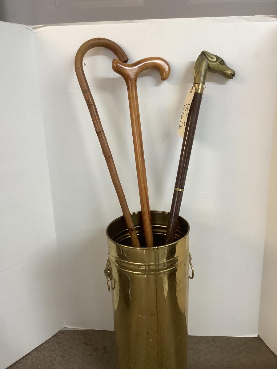 TC - 863  Three Vintage  Wooden Canes /Vintage  Brass Cane Stand