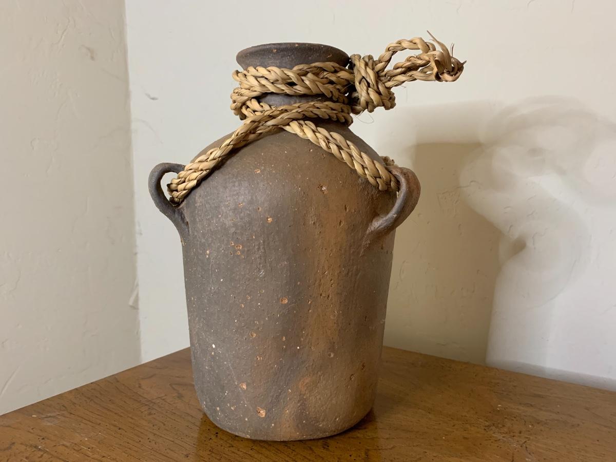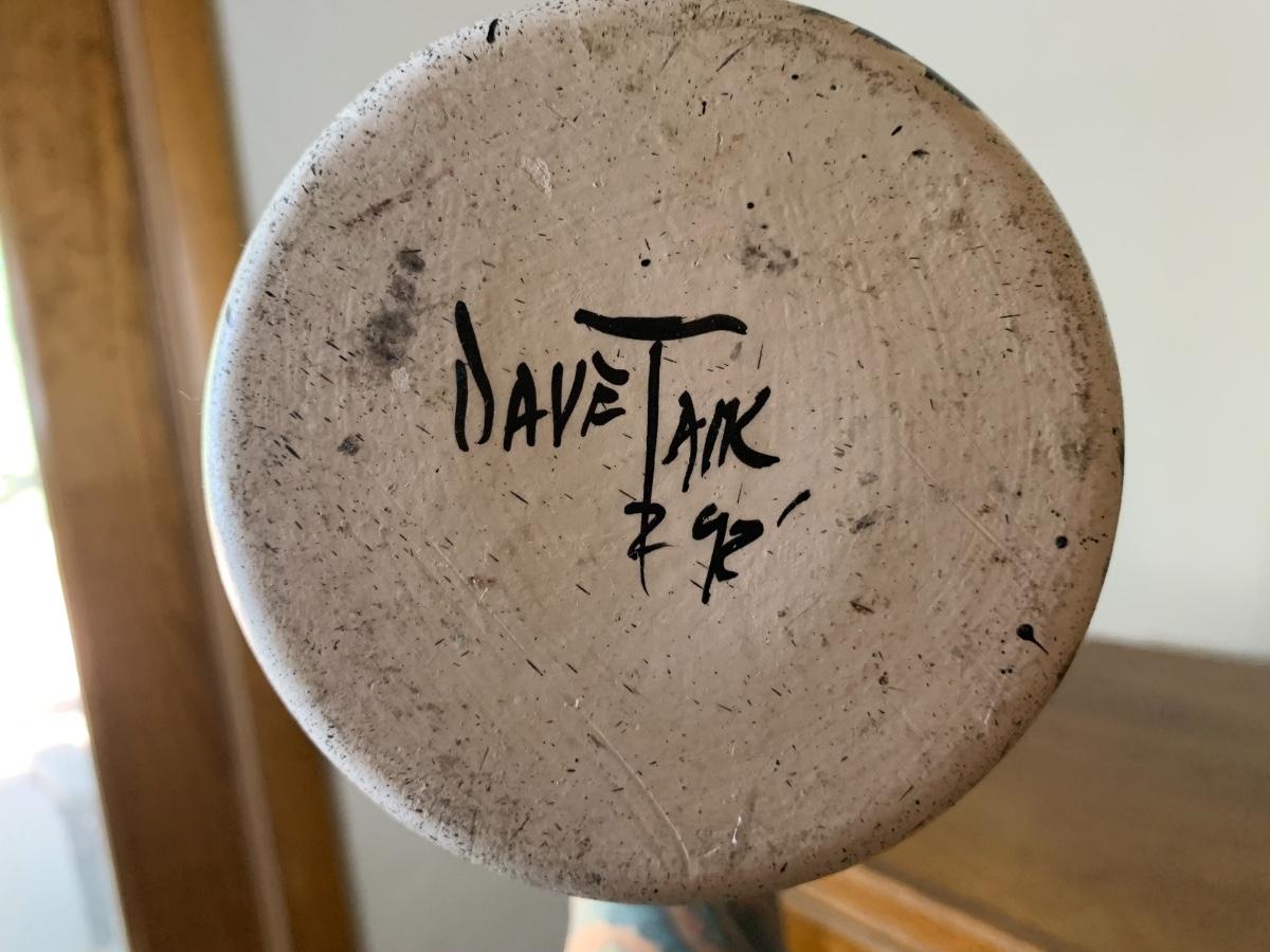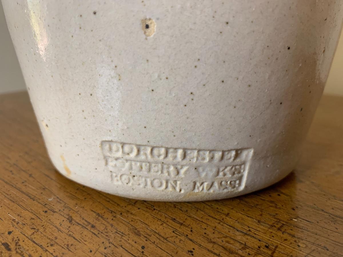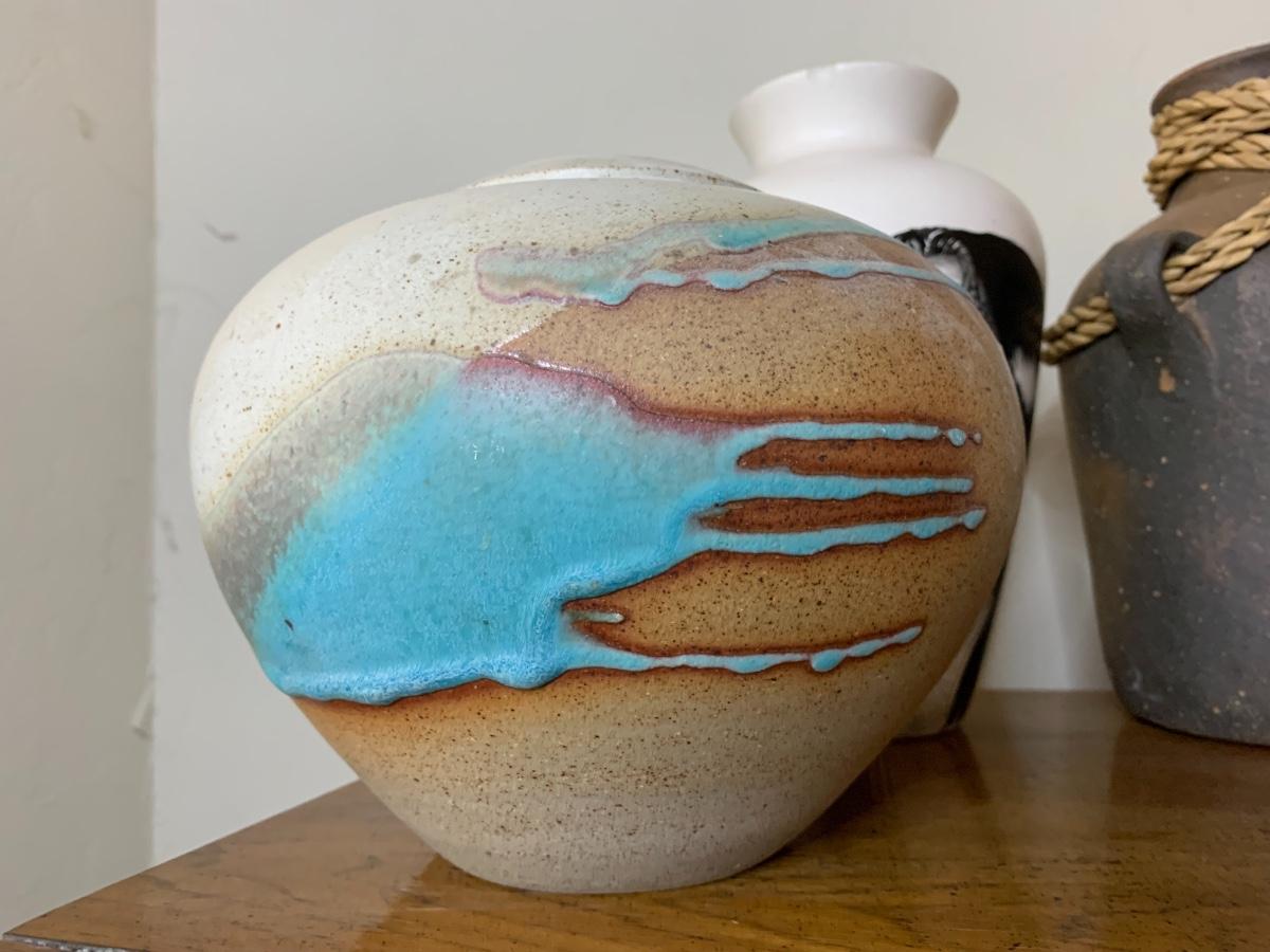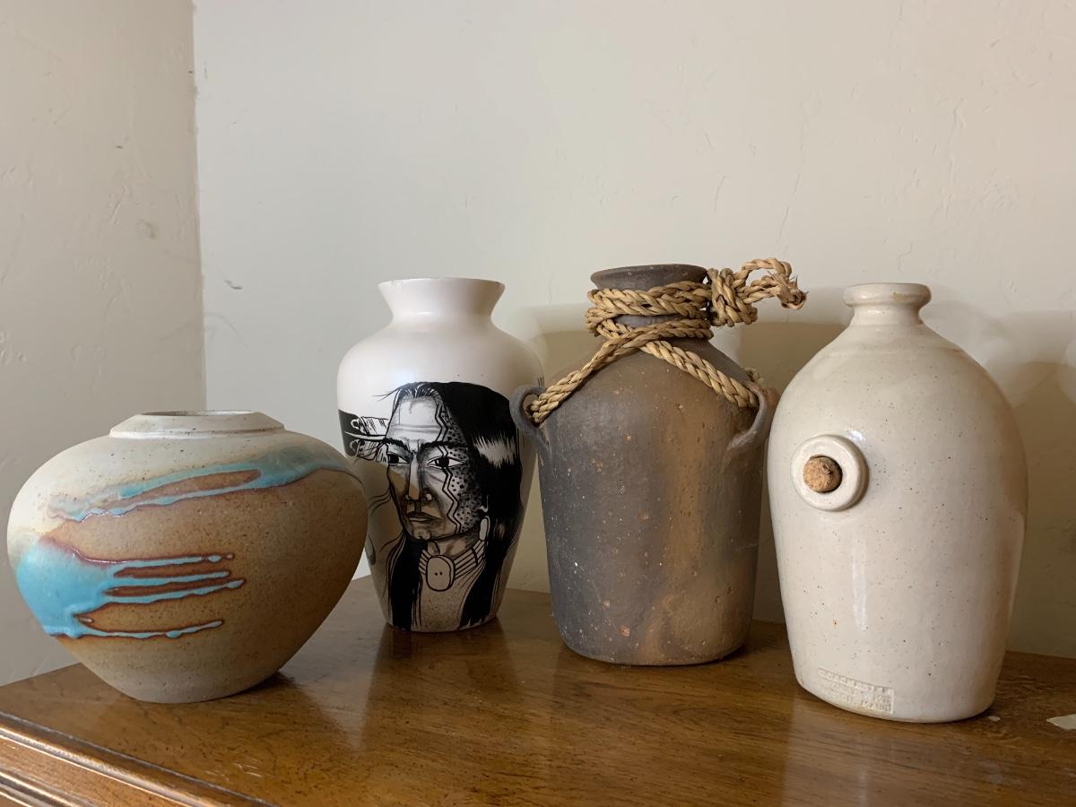 Lot includes four pieces. A studio pottery vase with swipe of turquoise glaze signed by artist. White clay vase with Native American portrait signed Dave Taik 1992 - 3 chips on the rim, a stoneware crock with crock stamped Dorghester Pottery WKS Boston Mass, and a fired clay vessel with rope.