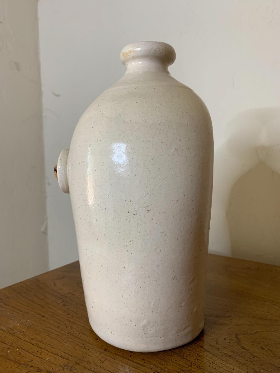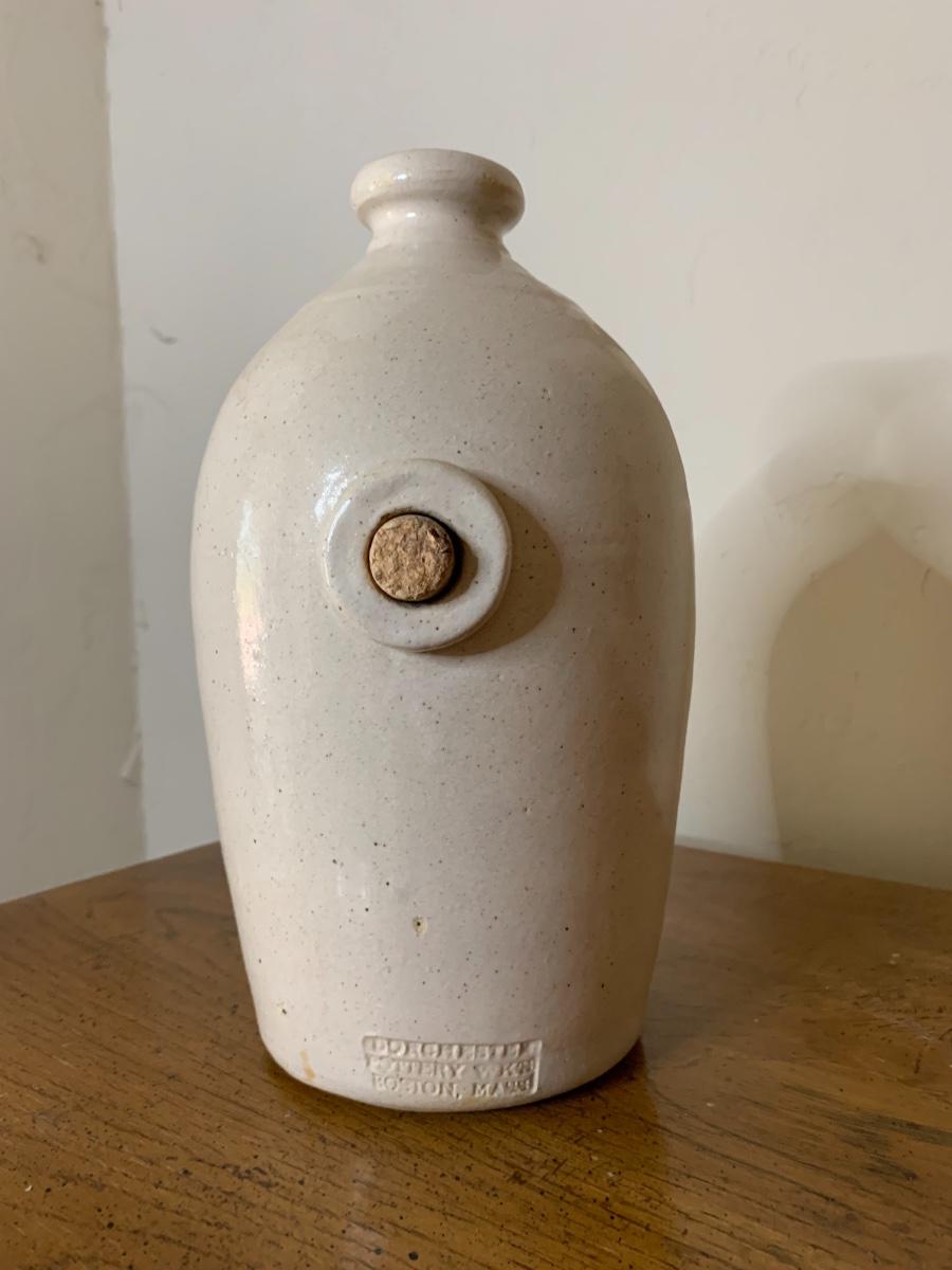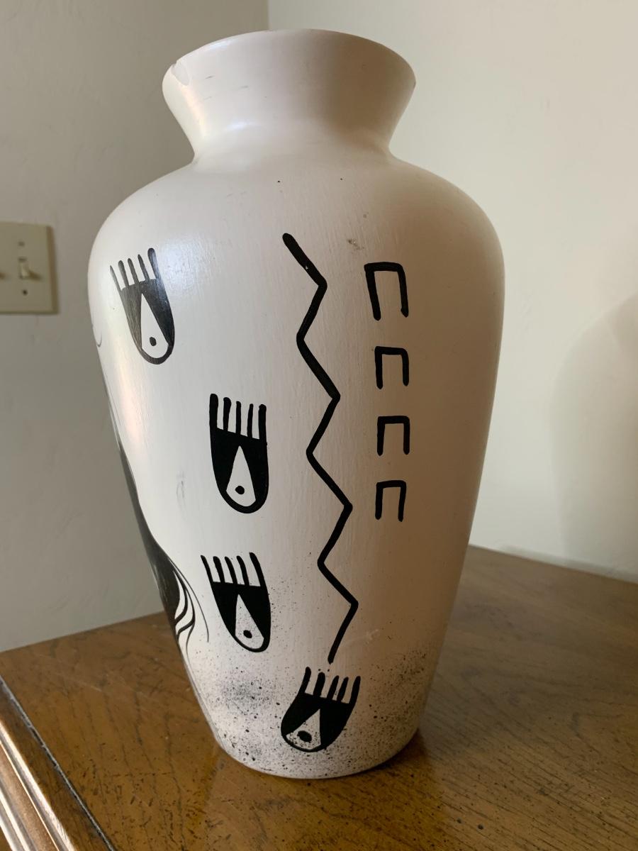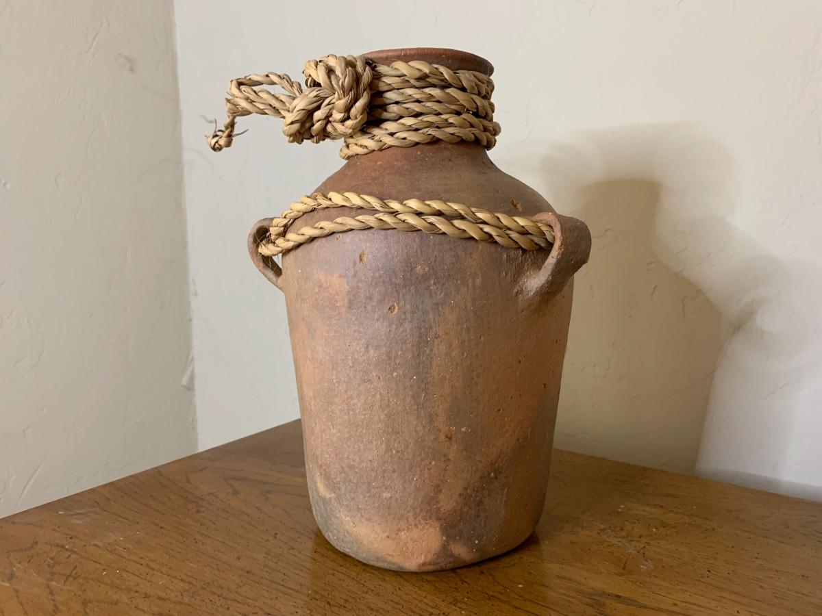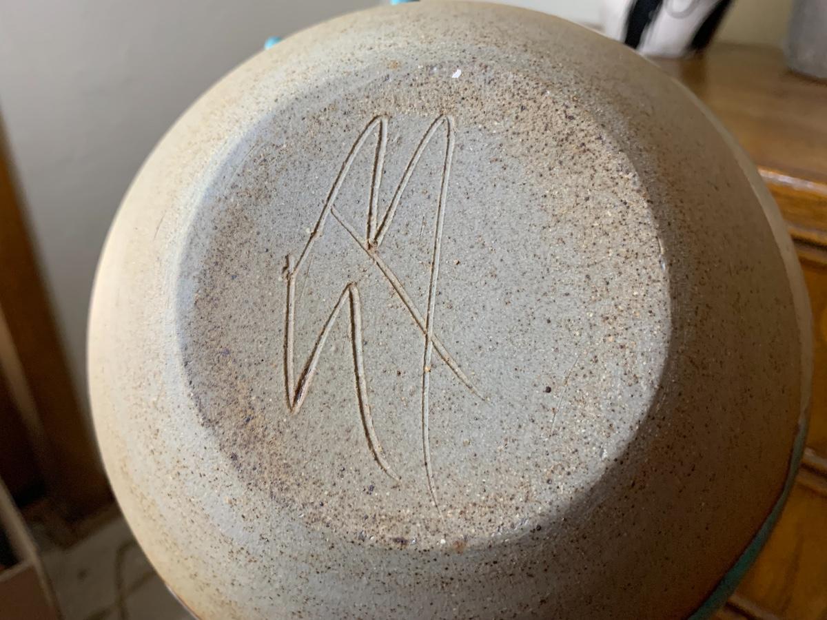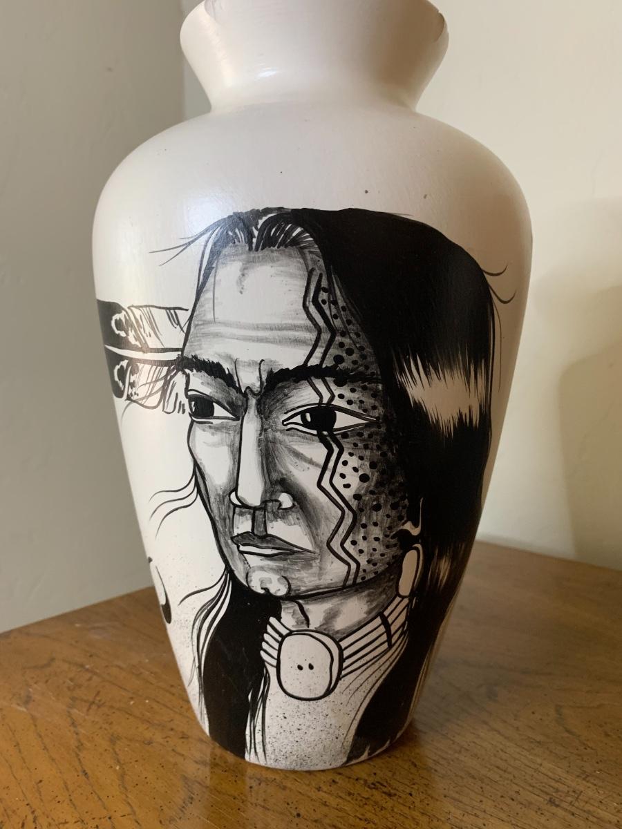 Lot includes four pieces. A studio pottery vase with swipe of turquoise glaze signed by artist. White clay vase with Native American portrait signed Dave Taik 1992 - 3 chips on the rim, a stoneware crock with crock stamped Dorghester Pottery WKS Boston Mass, and a fired clay vessel with rope.