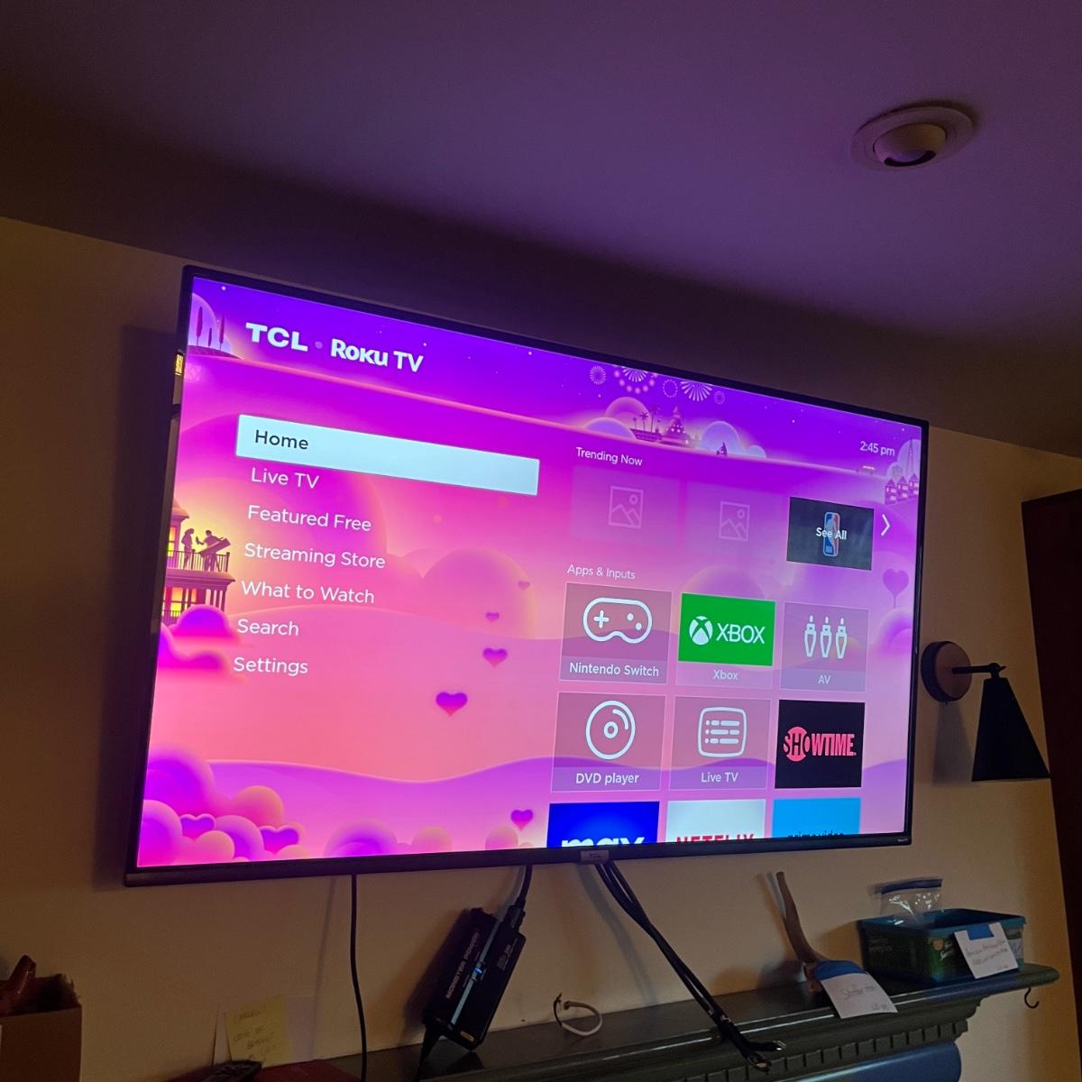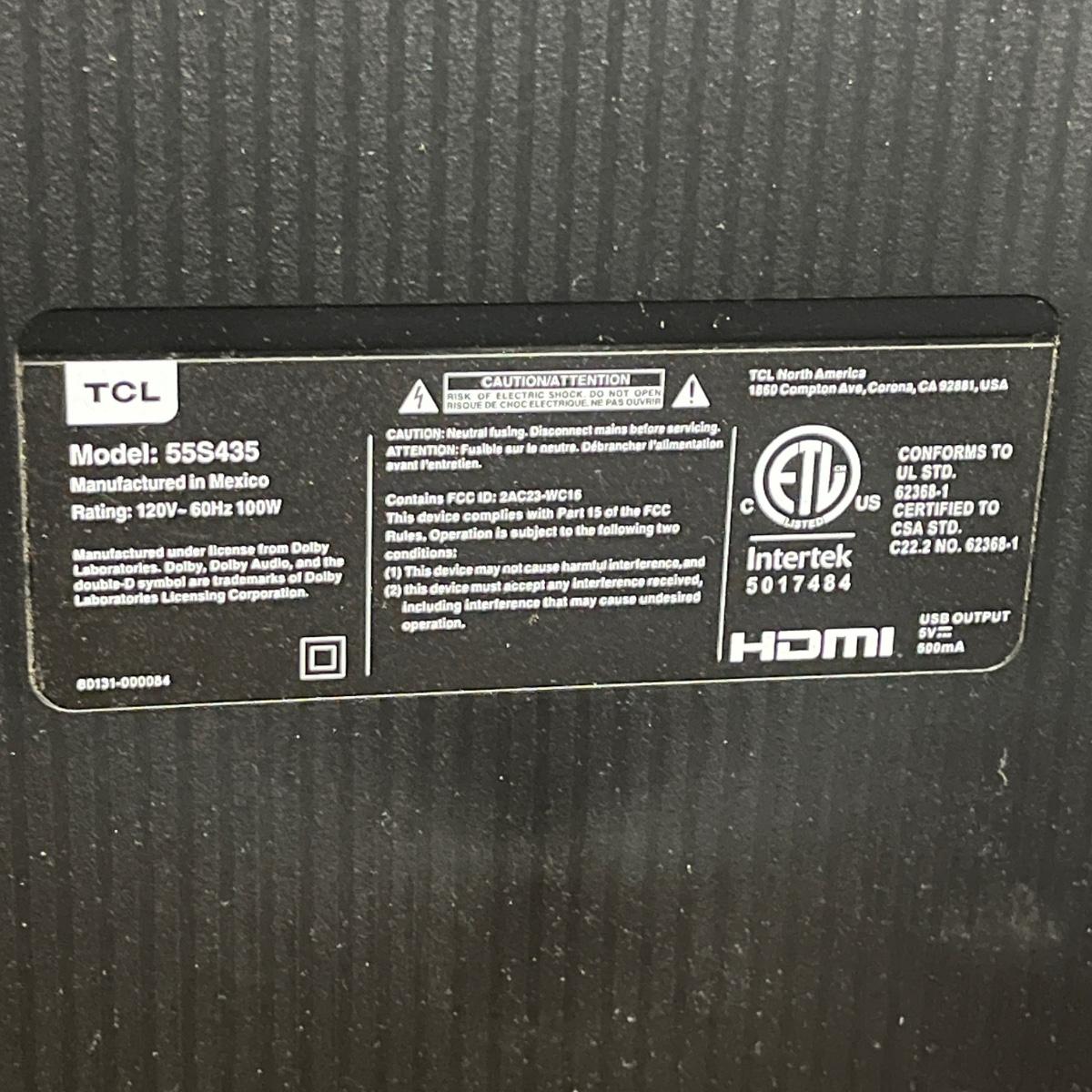 Lot includes a 55” TCL Roku TV with a Monster cable surge suppressor. Also includes remote. TV is wall mounted and does not have feet. Winning bidder will have to take down wall mount and will need a ratchet set.