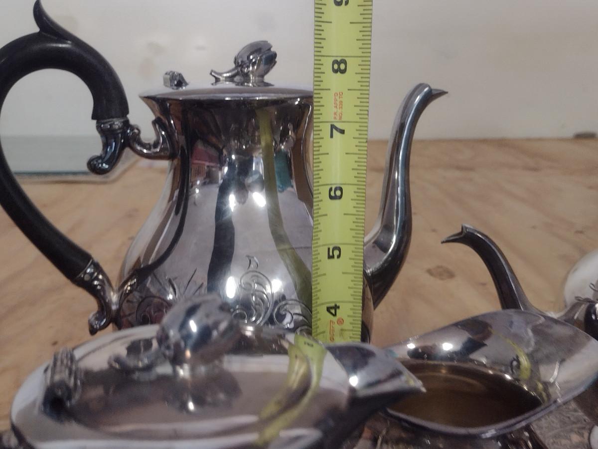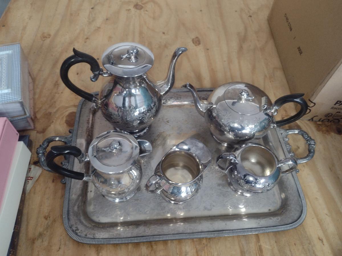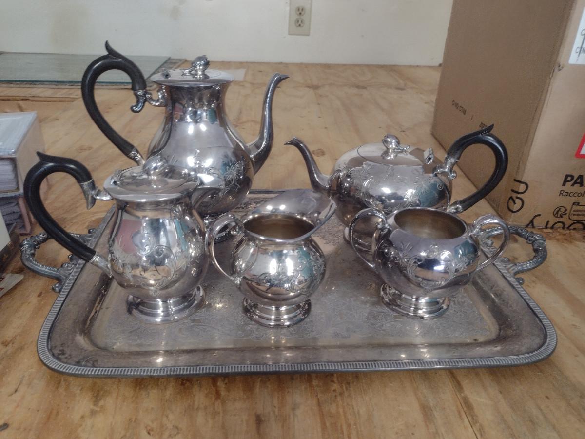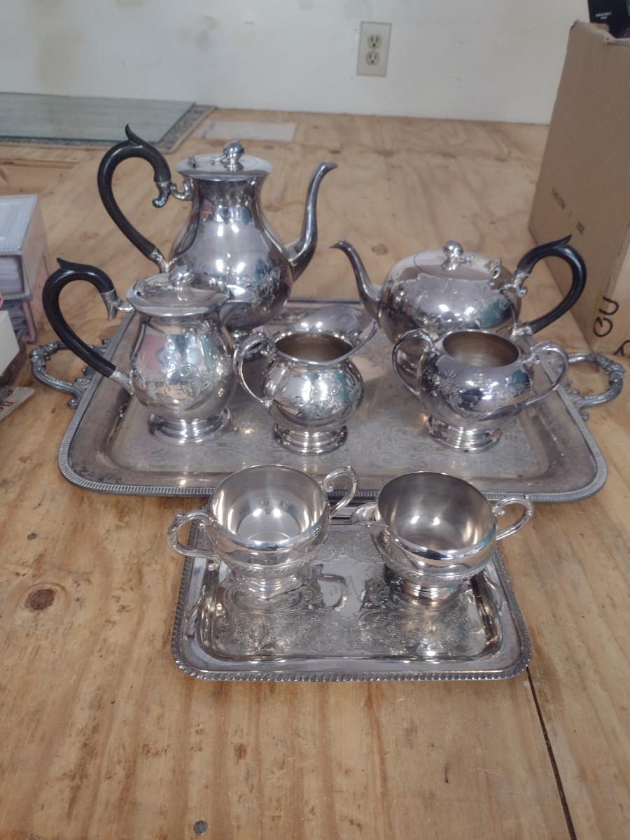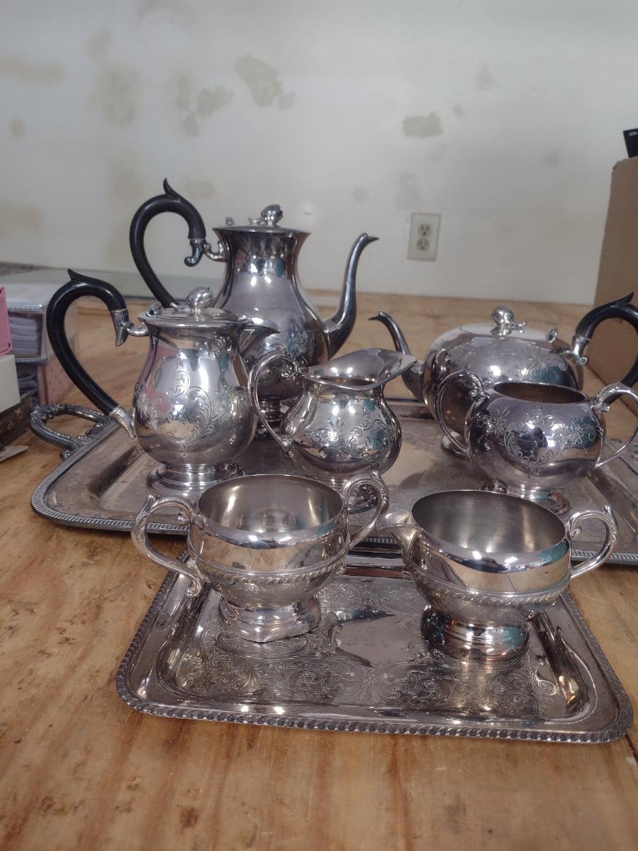 Tea and Coffee Set with Serving Trays. Some pieces are monogrammed. At least one piece has some damage- please see all pictures.