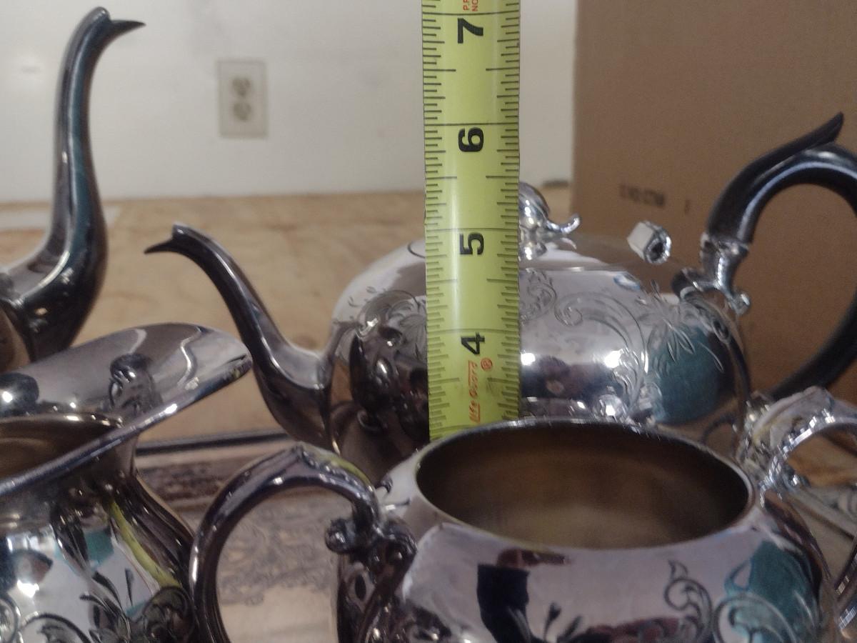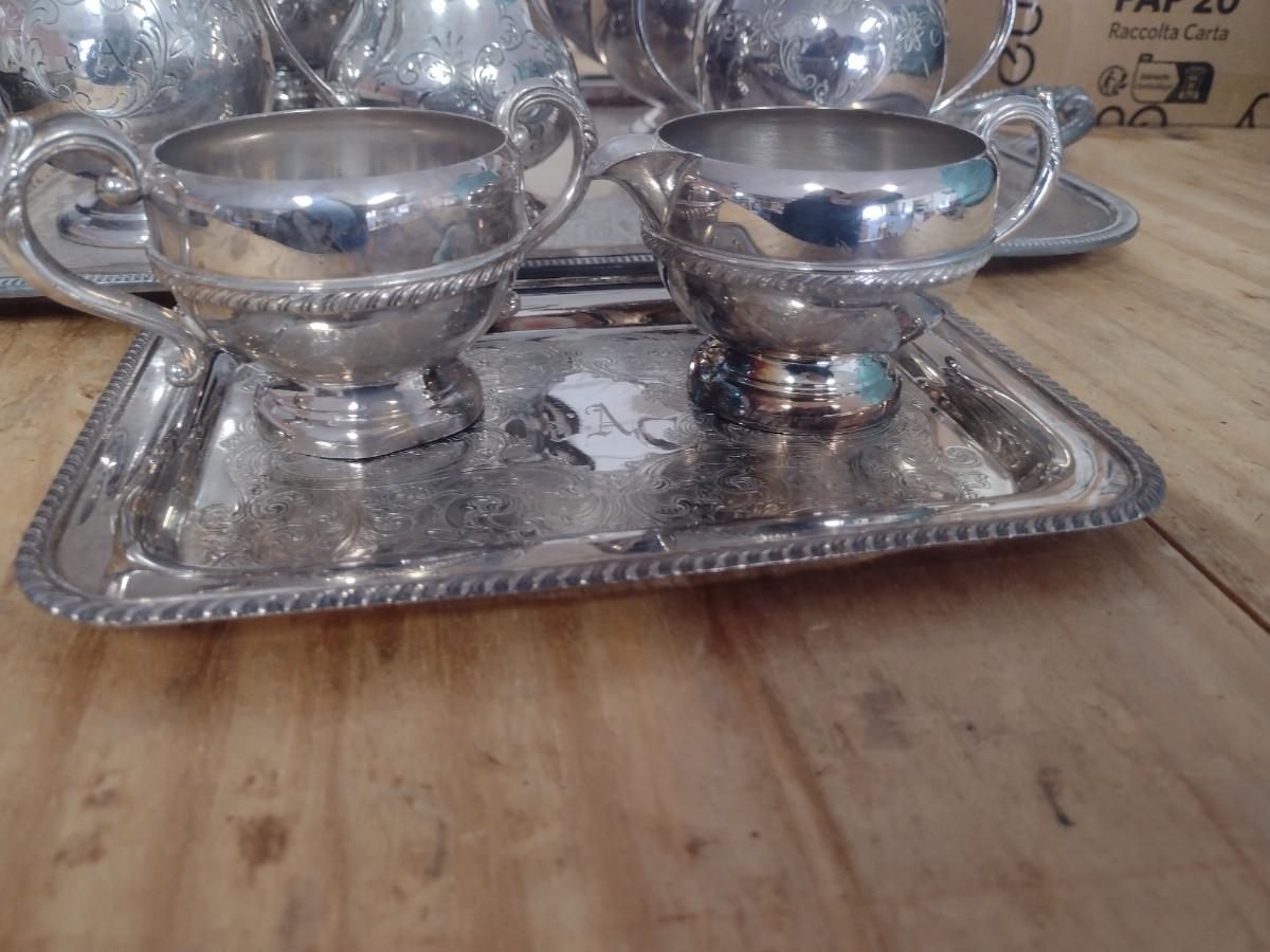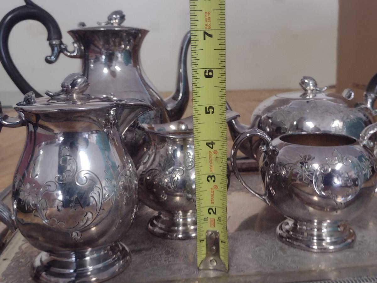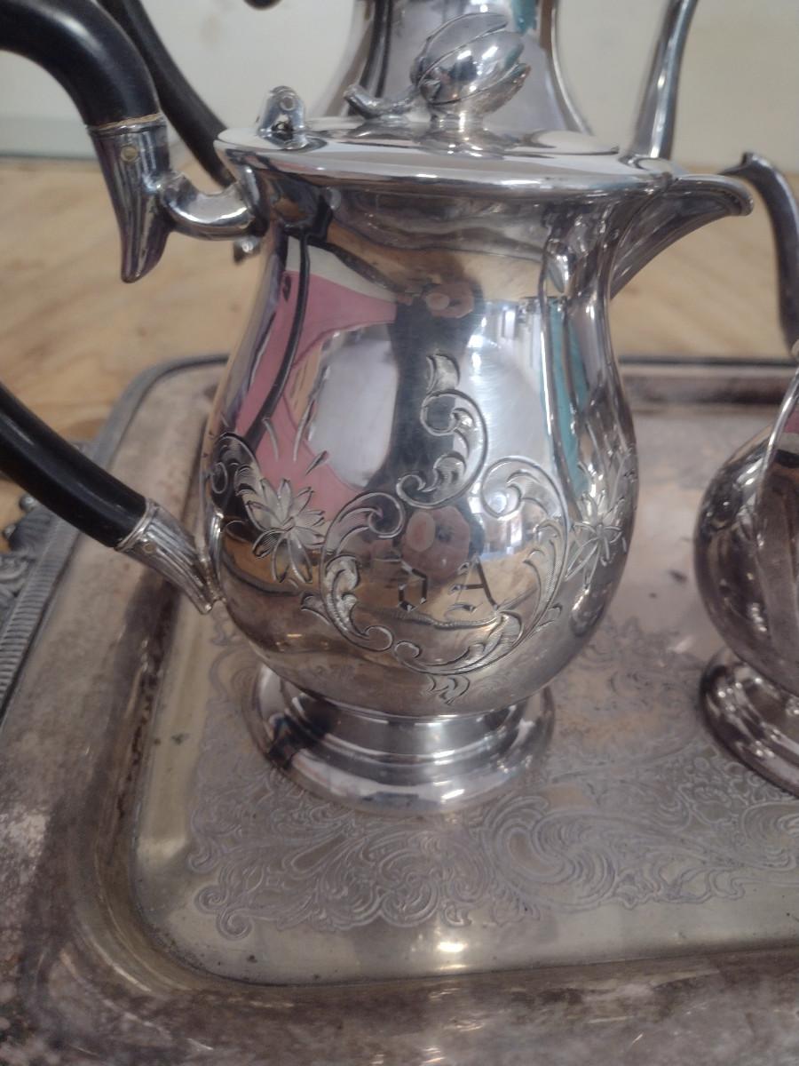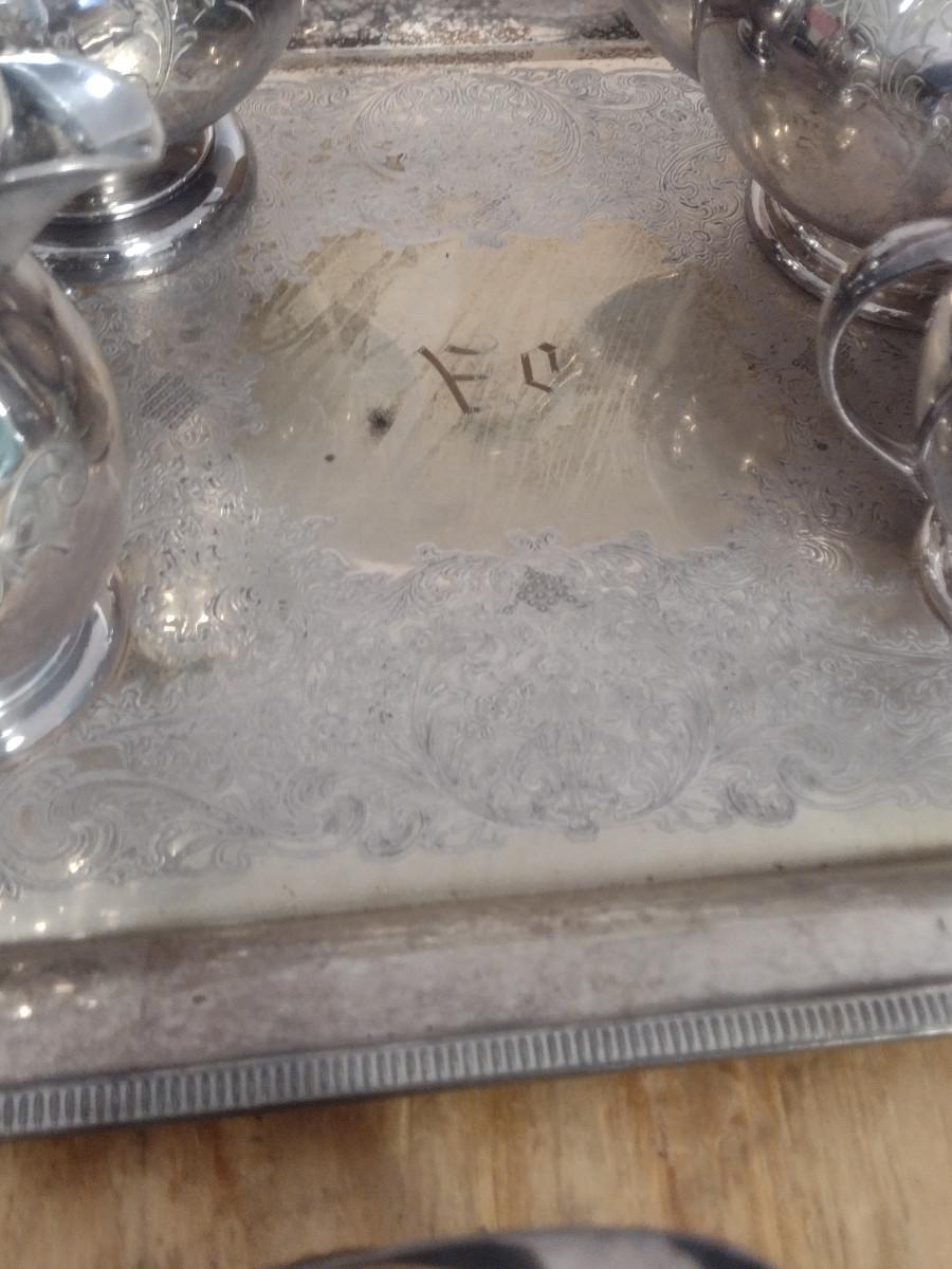 Tea and Coffee Set with Serving Trays. Some pieces are monogrammed. At least one piece has some damage- please see all pictures.