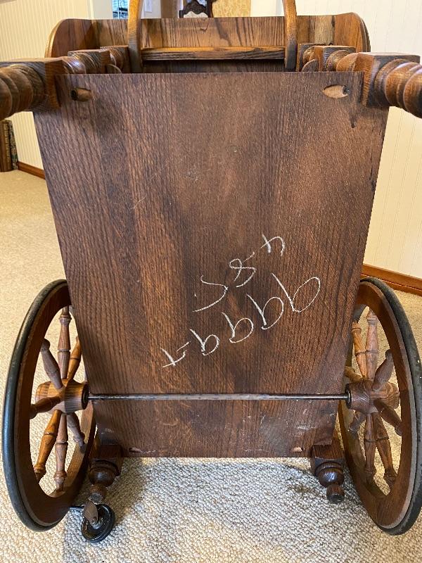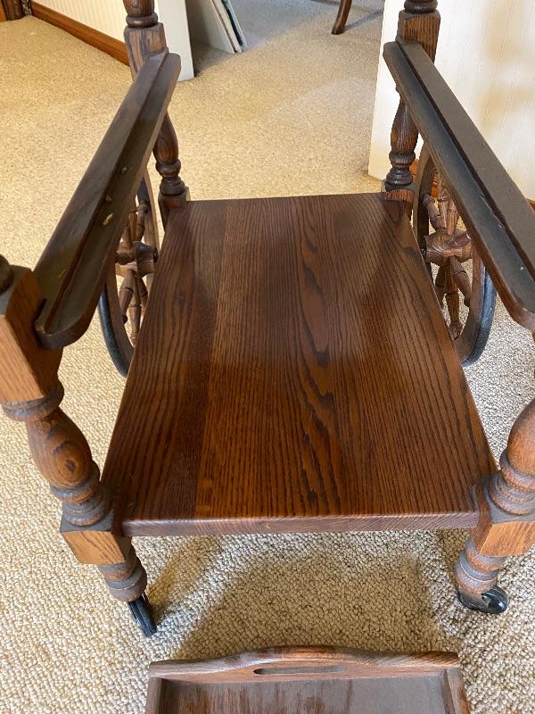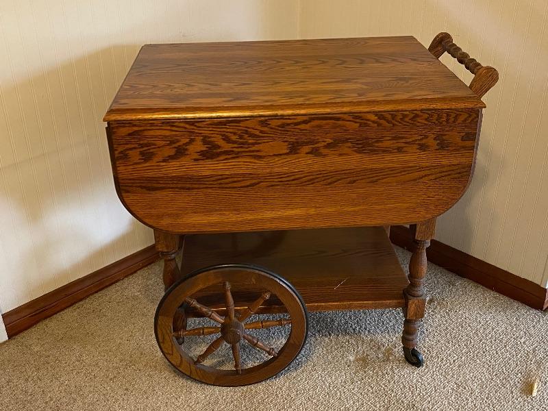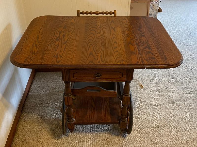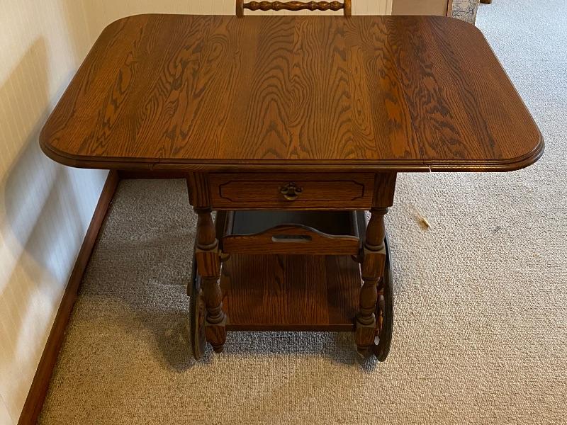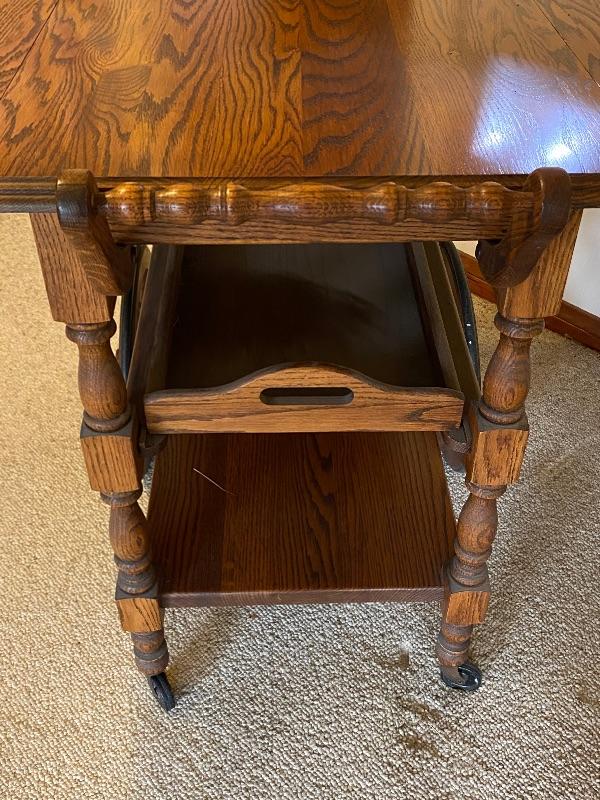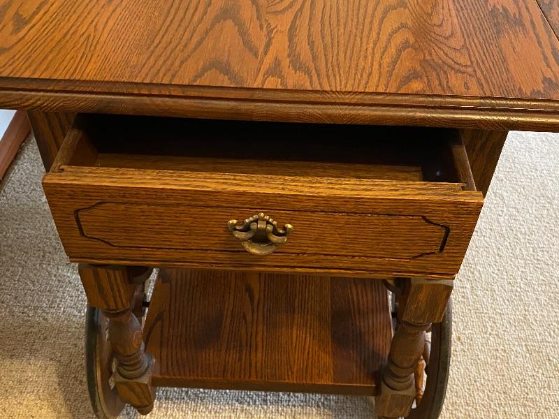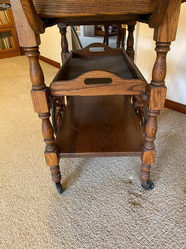 Beautiful oak hostess cart. Tea service cart has drop leaf sides and removeable serving tray. Stands at 28” tall and is 21”wide. The drop leaf sides are 10”. From front to back it measures 29”. Rolls good.