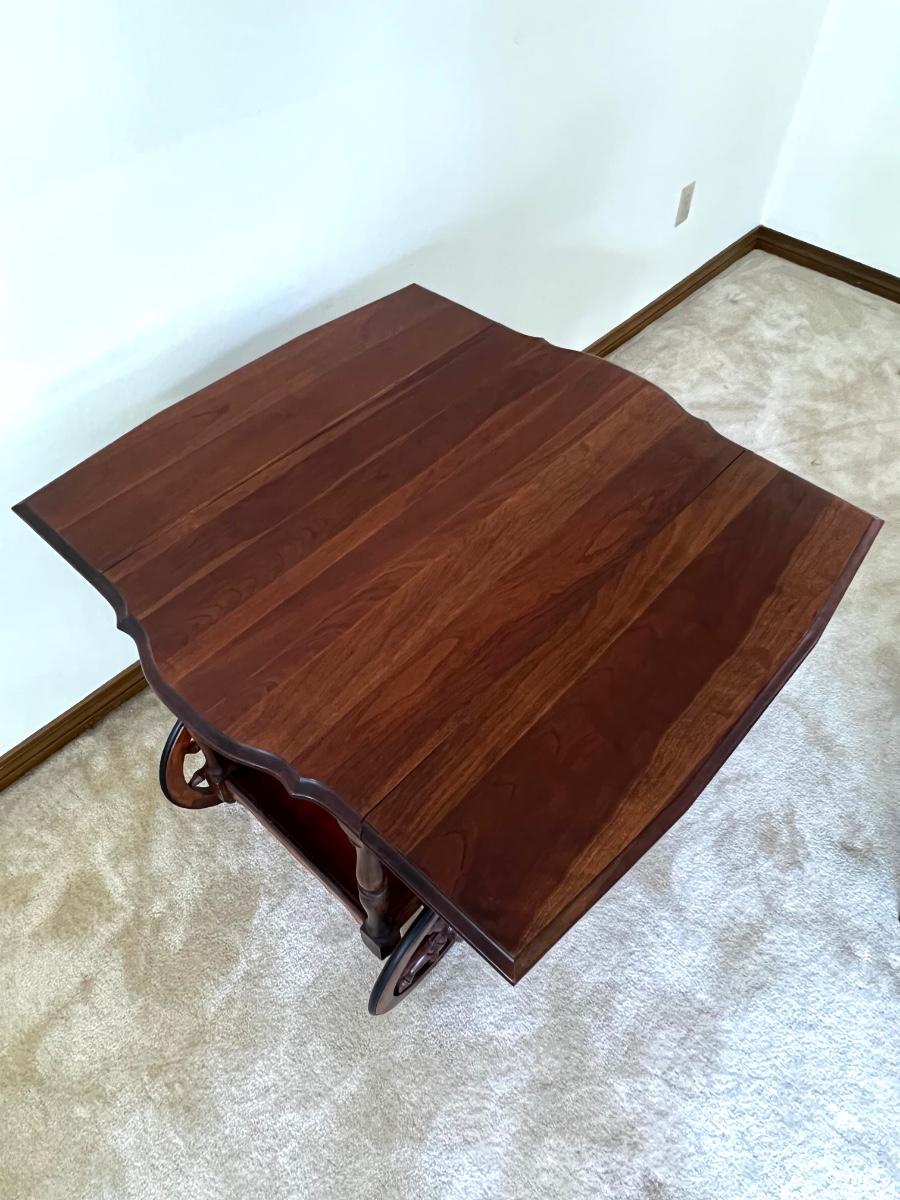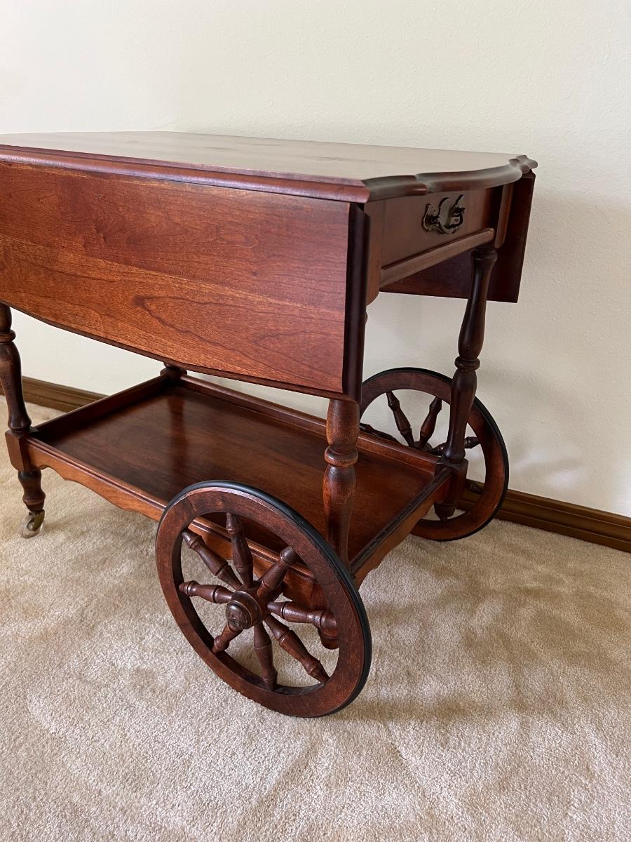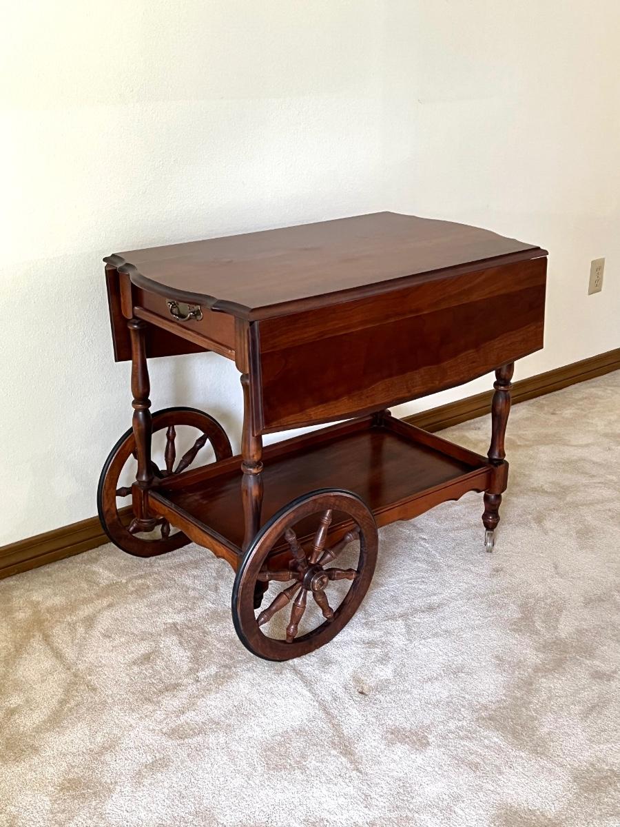 Drop leaves folded down = 28” H x 34” W x 19.5” D ~ 1 drop leaf up = 27” D ~ Both drop leaves up = 36” D