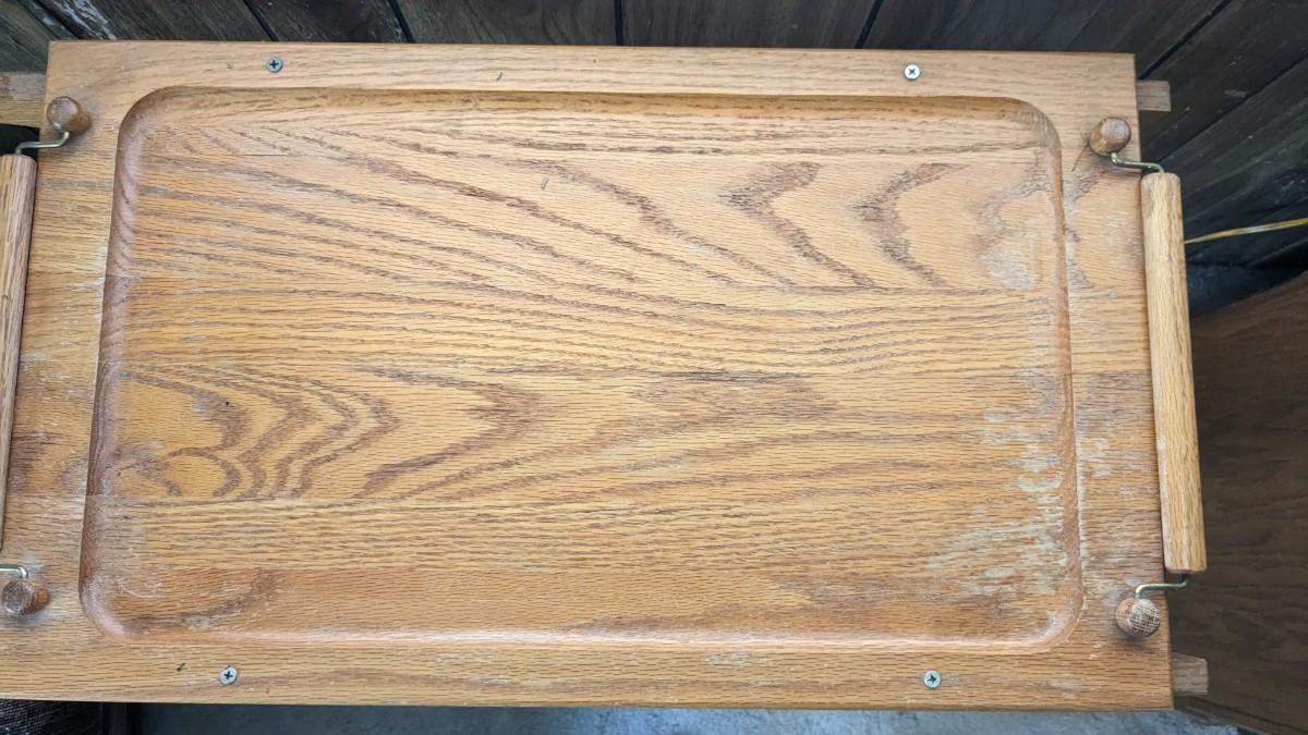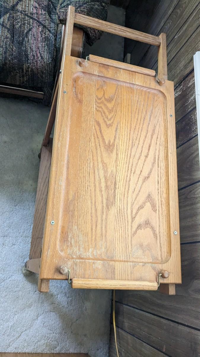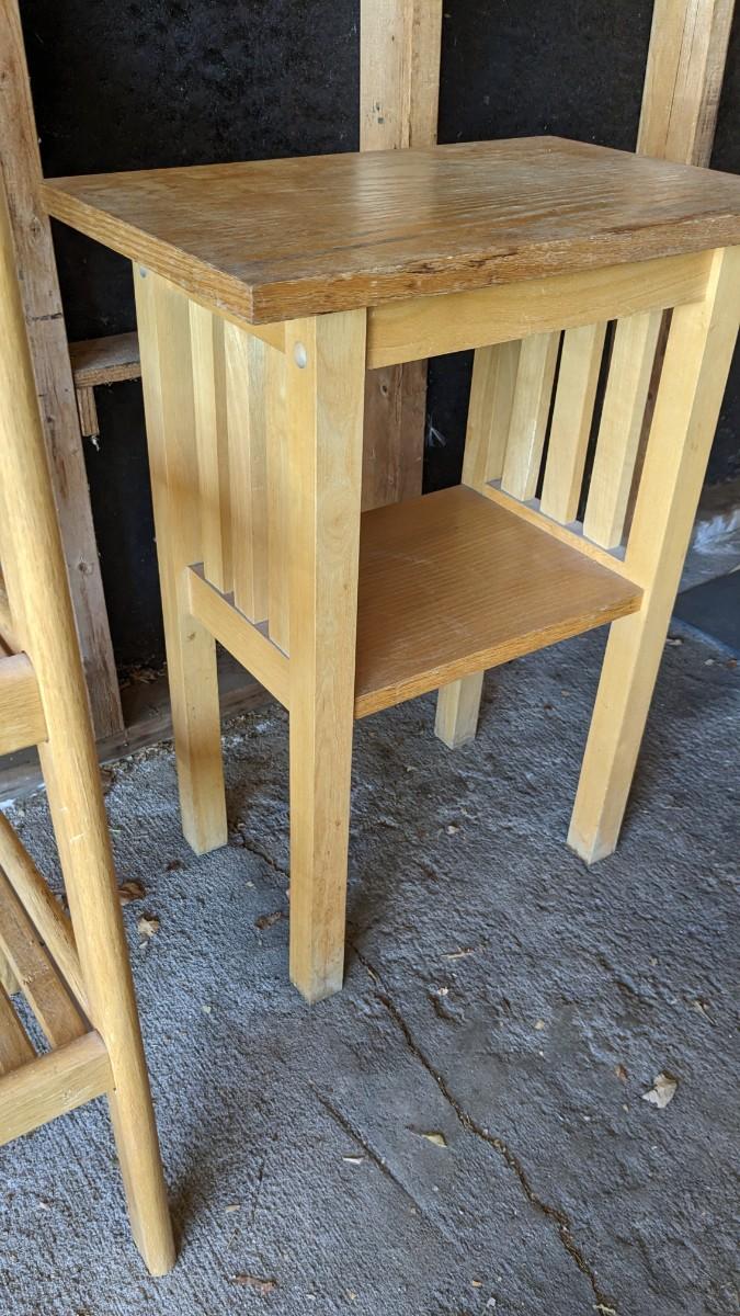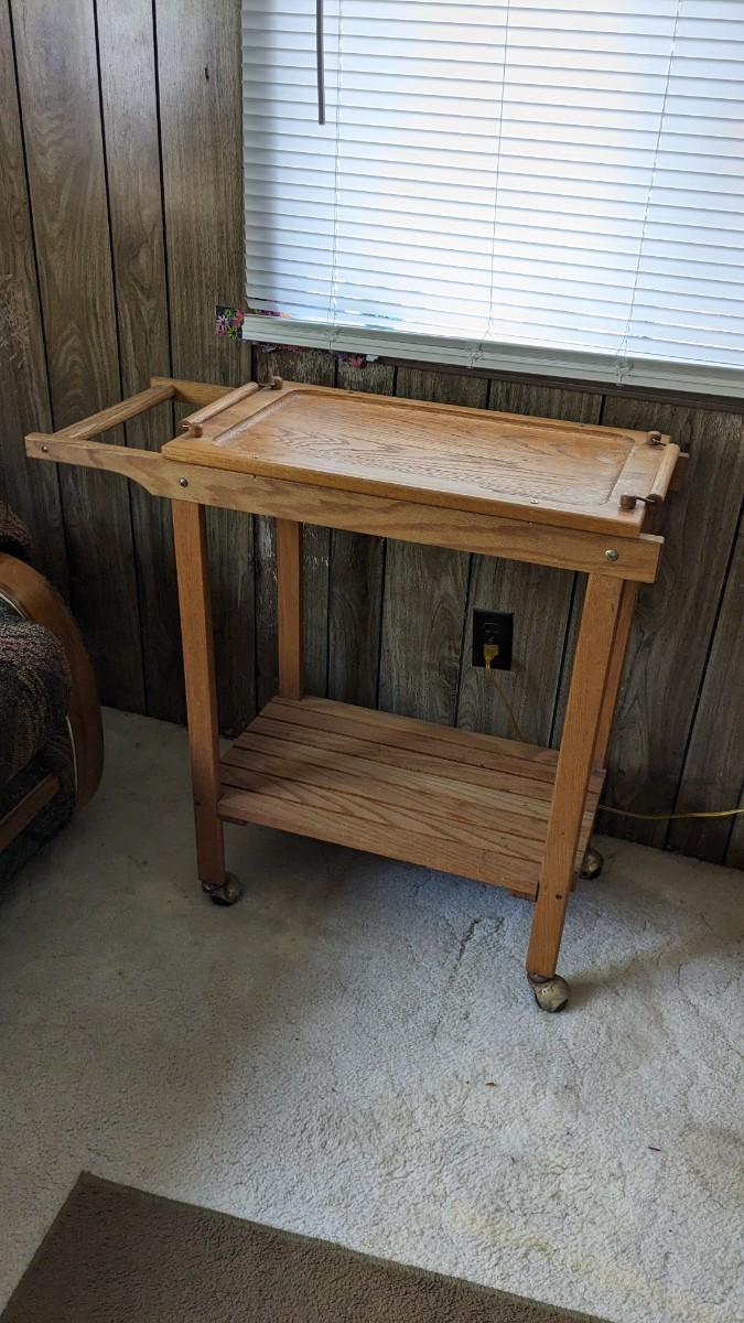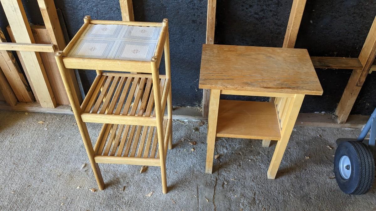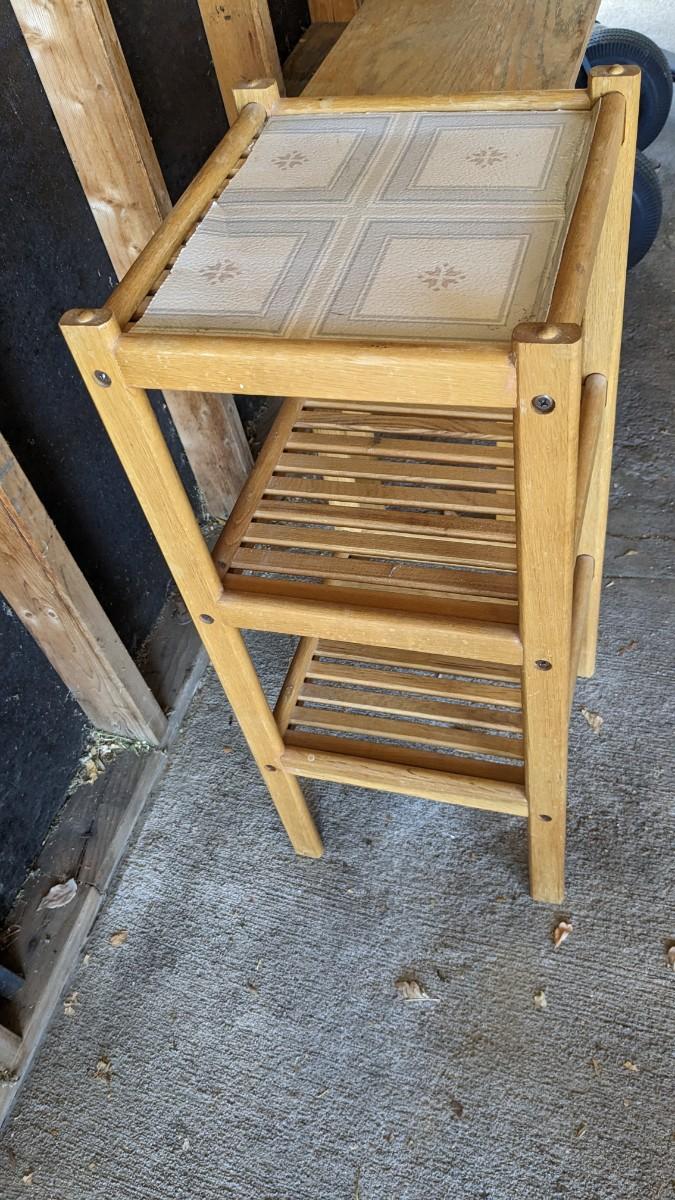 3 pieces, includes 33.25"x14"x30.5" tea cart-tray has been screwed down. 18.25"x12"x24.25" blonde table, and 13.25"x12.75"x30.5" plant stand/shelf. some wear noted to all pieces, in good shape overall.