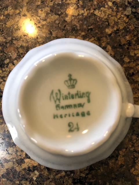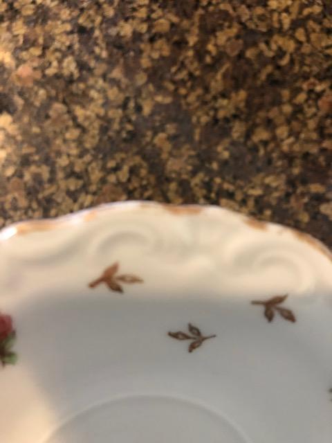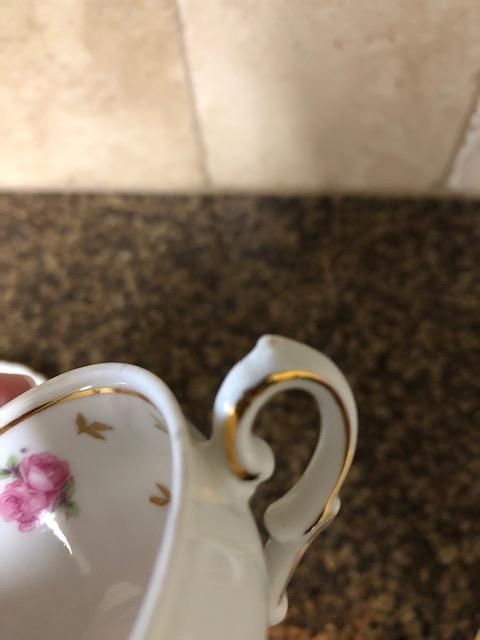 6 Tea cups measuring 1 1/2” tall and 2 5/8” in diameter. One cup has a hairline crack and one has a rough spot on the handle as shown in pic. 7 saucers. No chips. One has a bit of gold trim missing from use. $30 for all 13 pieces.
