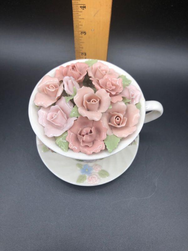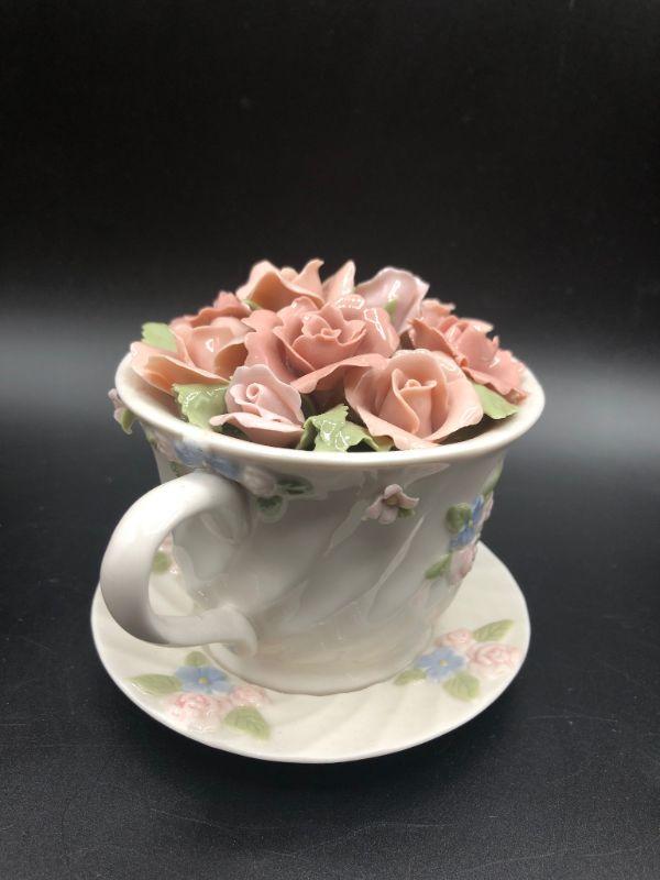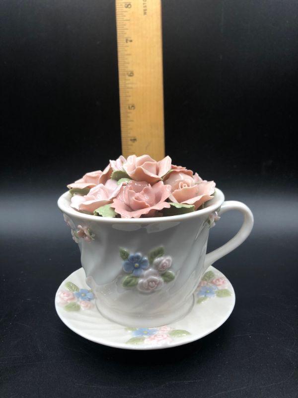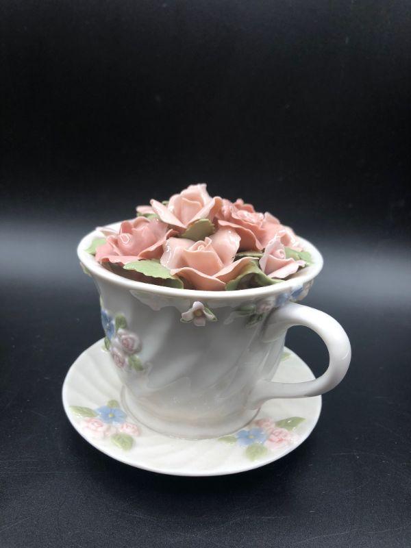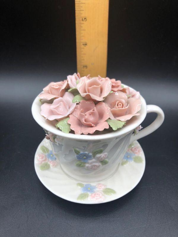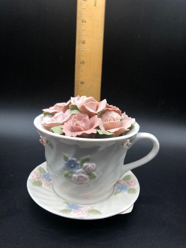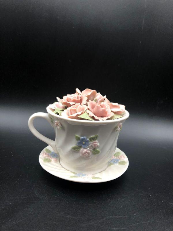 San Francisco Music Box Co. & The Anna Rosa Collection Tea Cup of Roses Music Box. Plays "You've Got A Friend". Good Condition. About 3.5" tall.