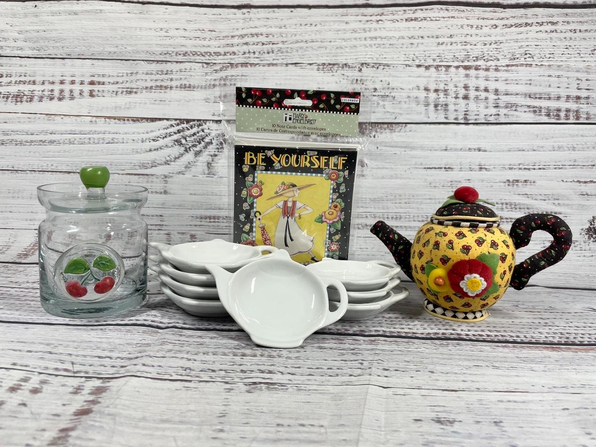Tea Bag Plates & Sewing Pin Holder, Glass Jar, and Note Card Set