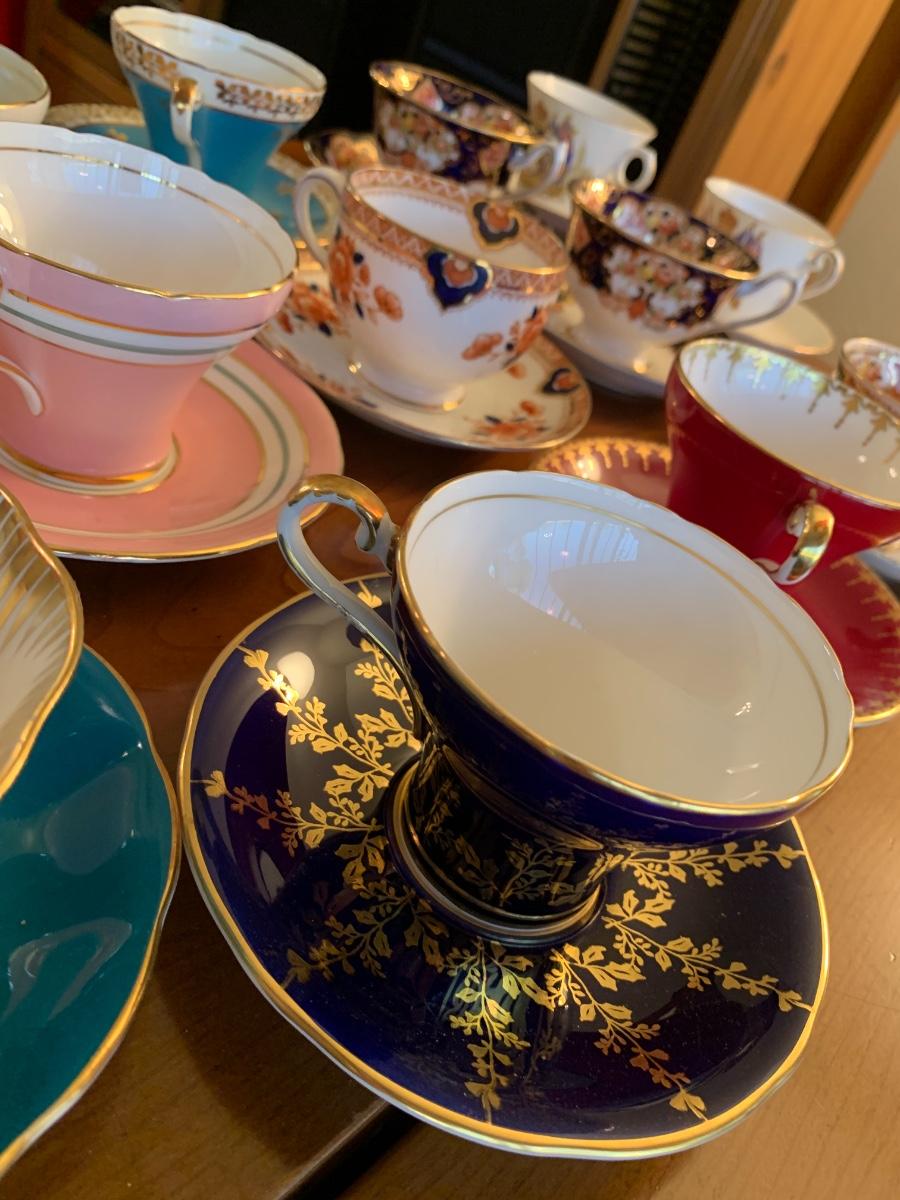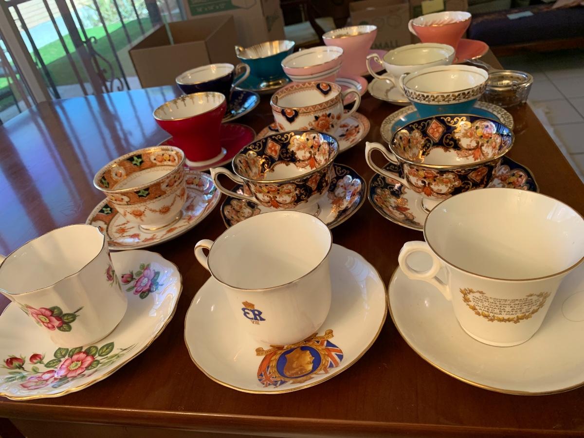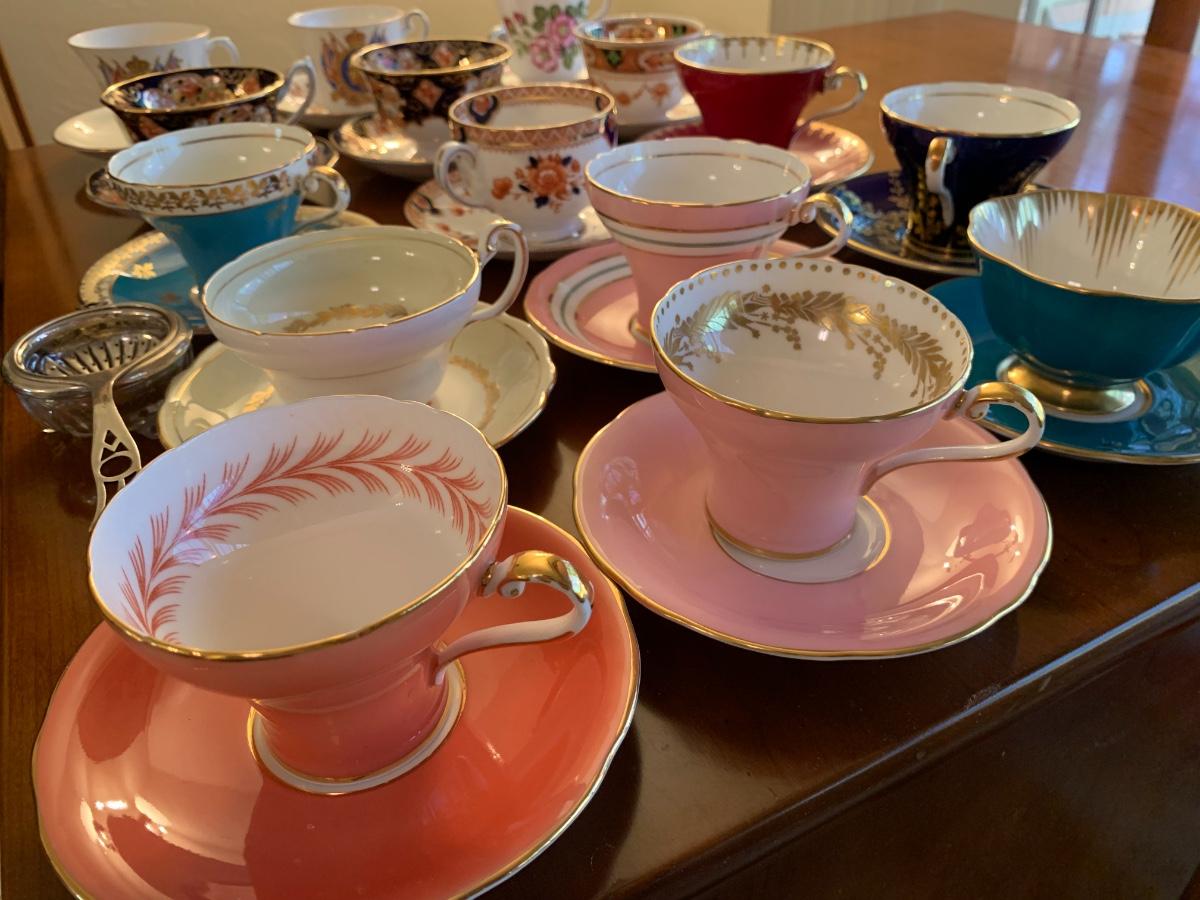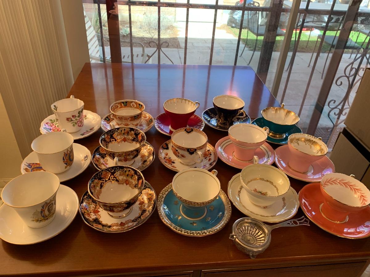 Collection of 15 tea cups with saucers and bonus tea strainer with glass rest