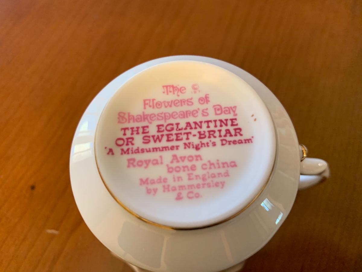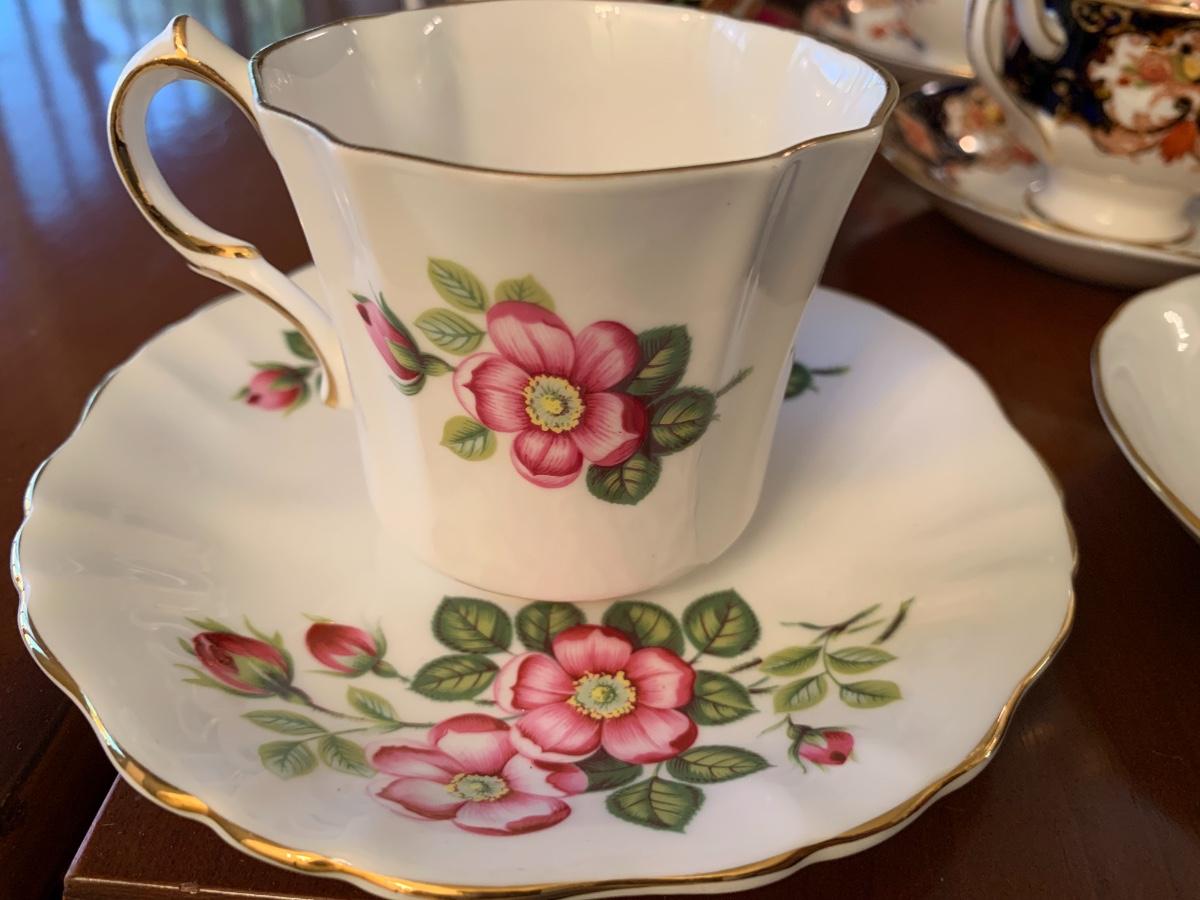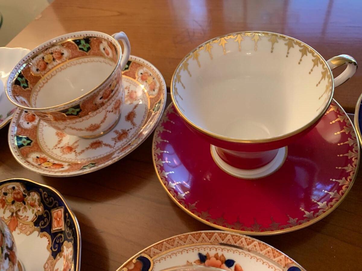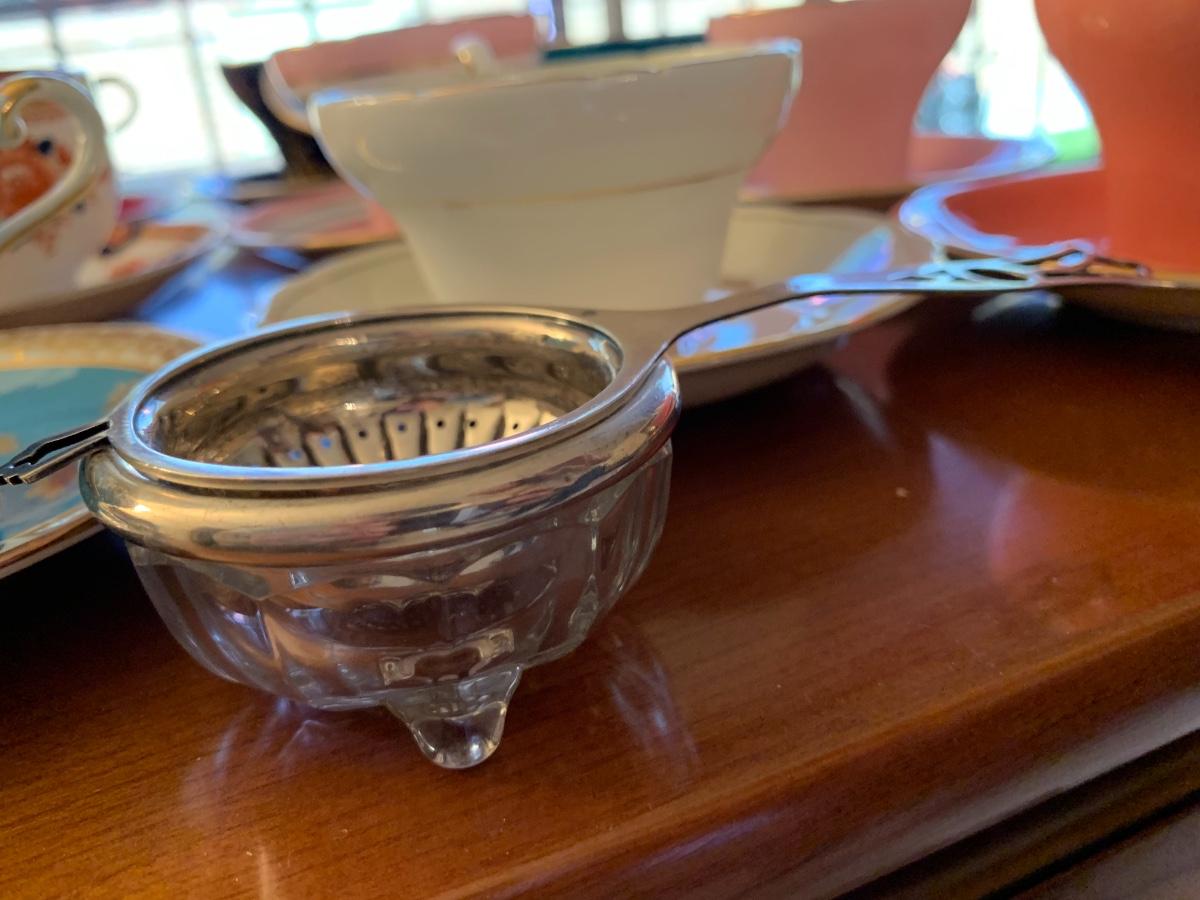 Collection of 15 tea cups with saucers and bonus tea strainer with glass rest