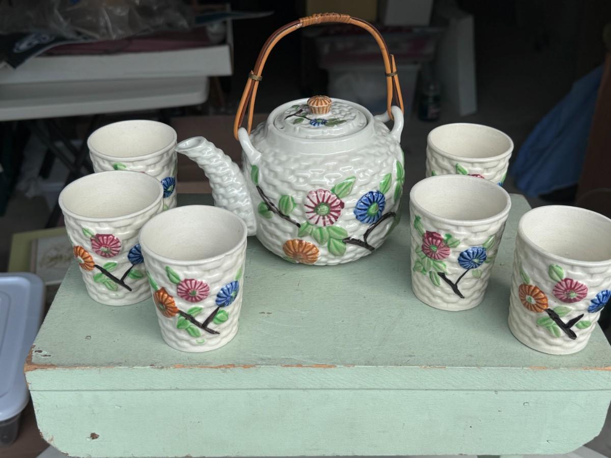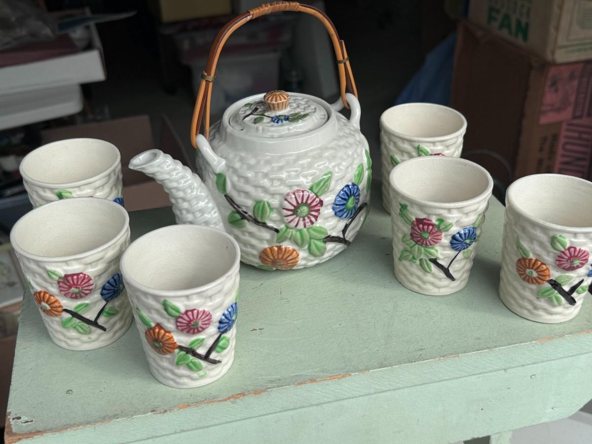 Tea Pot w/ 6 Cups- Basketweave Floral Motif with Bamboo Handle
