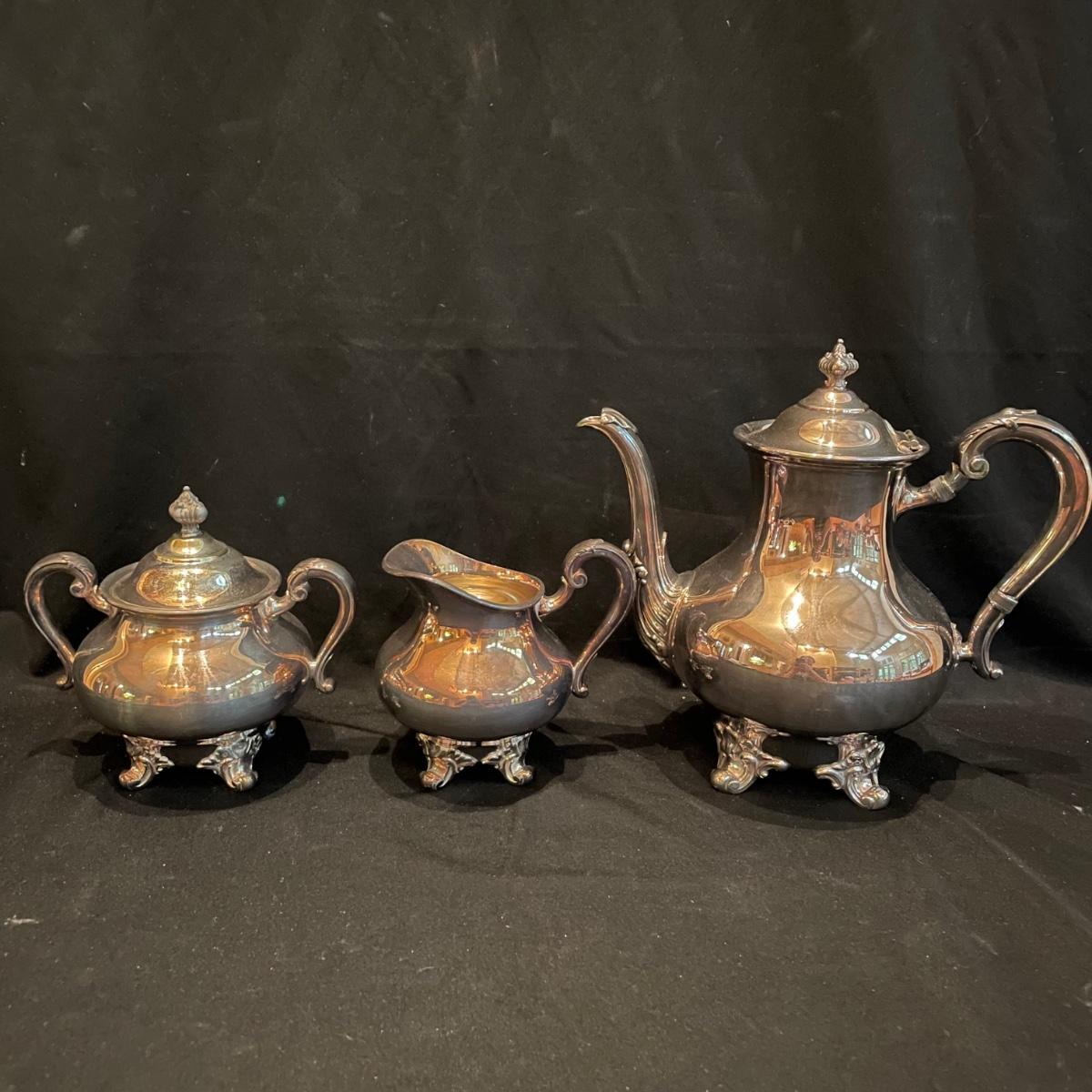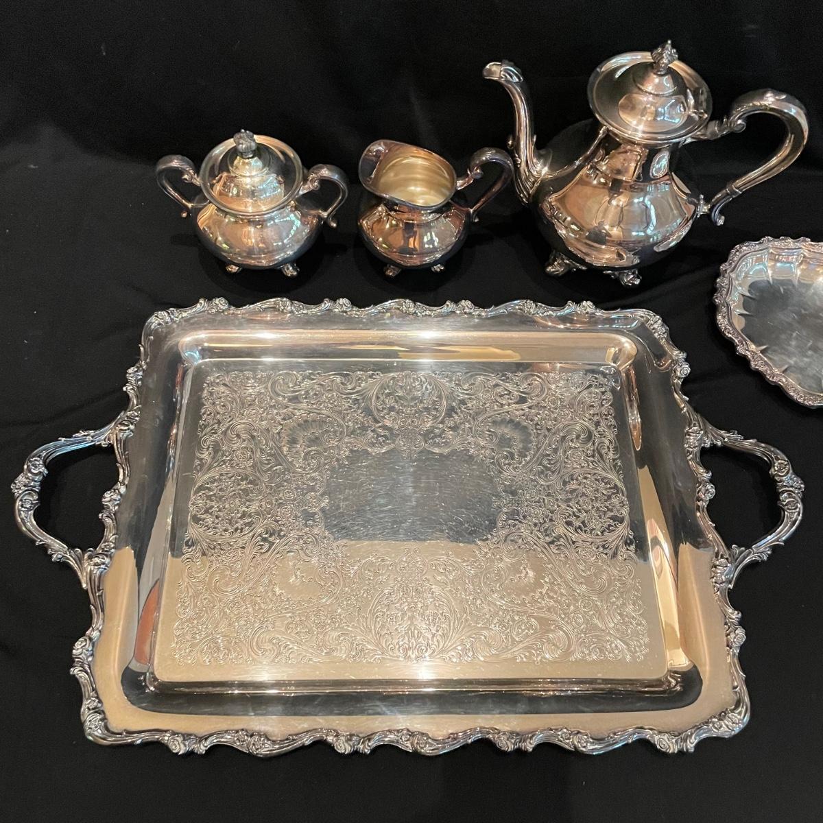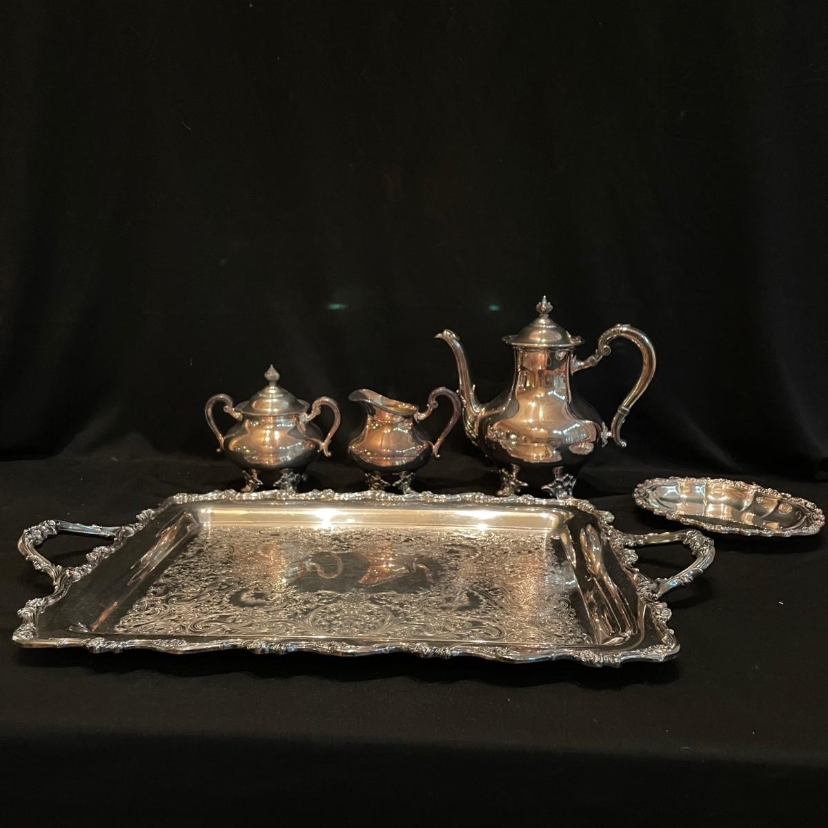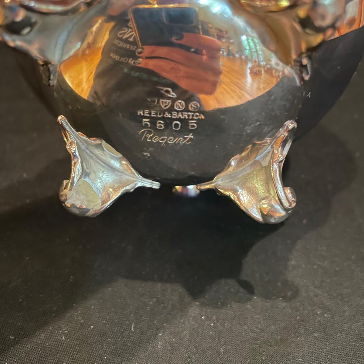 Timeless tea set by Reed & Barton includes teapot, cream pitcher and sugar now with lid. We’ve paired the tea set with a heavy 18” x 14” tray (measurements do not include handles) and a 8” x 6.5” dish named “Contess”. See images. Shipping available.