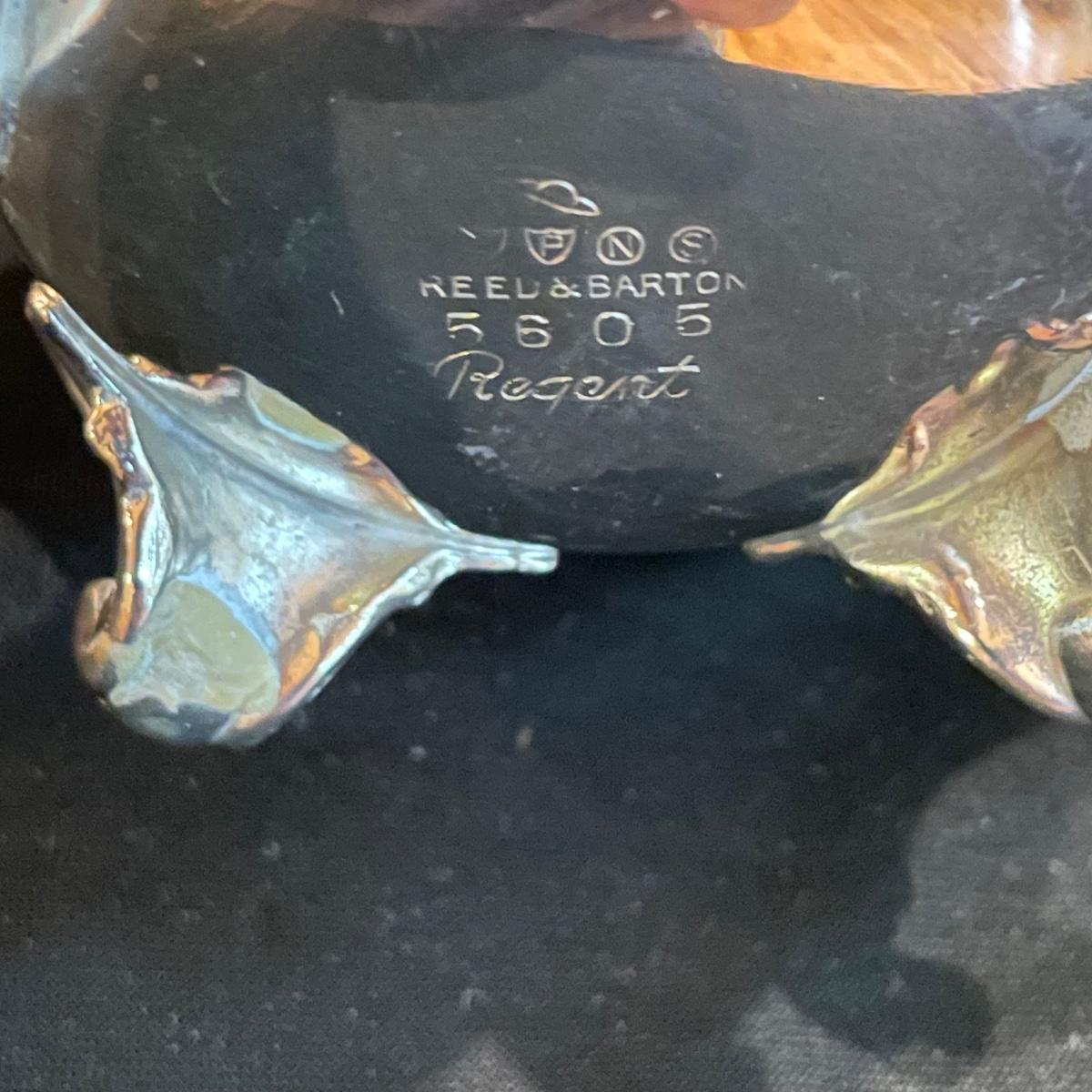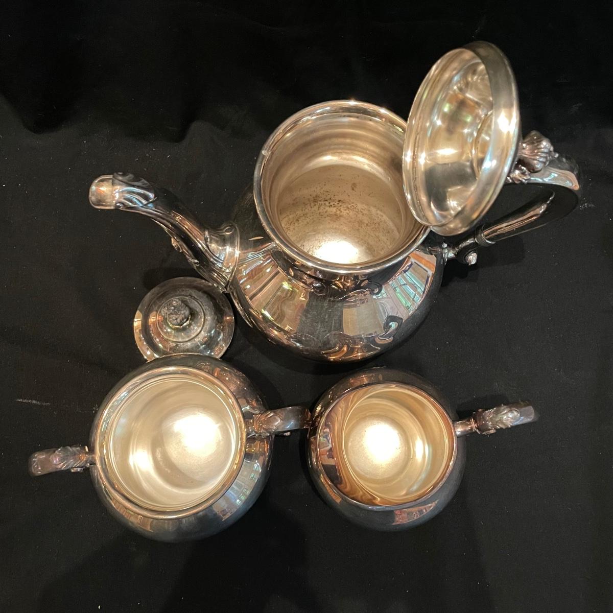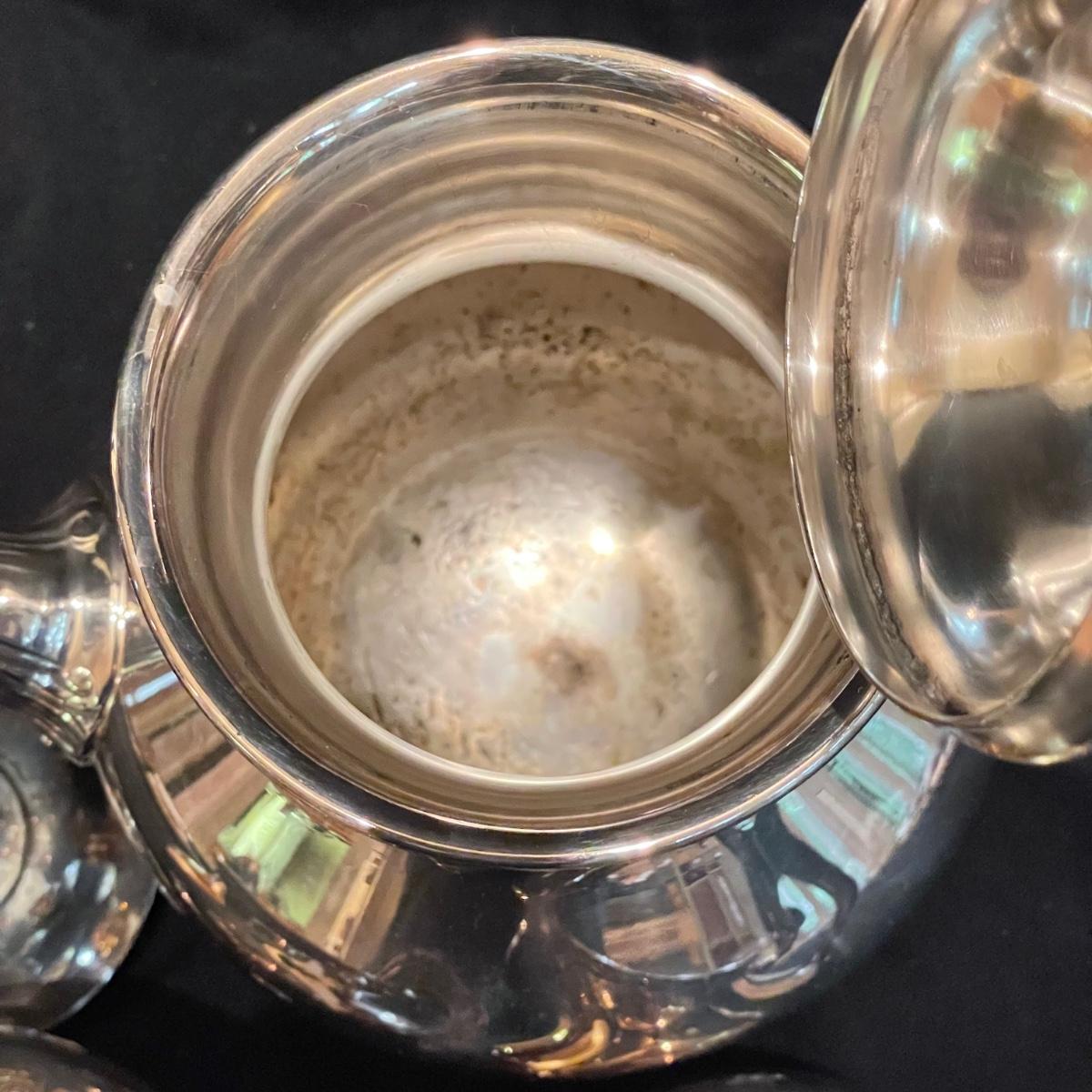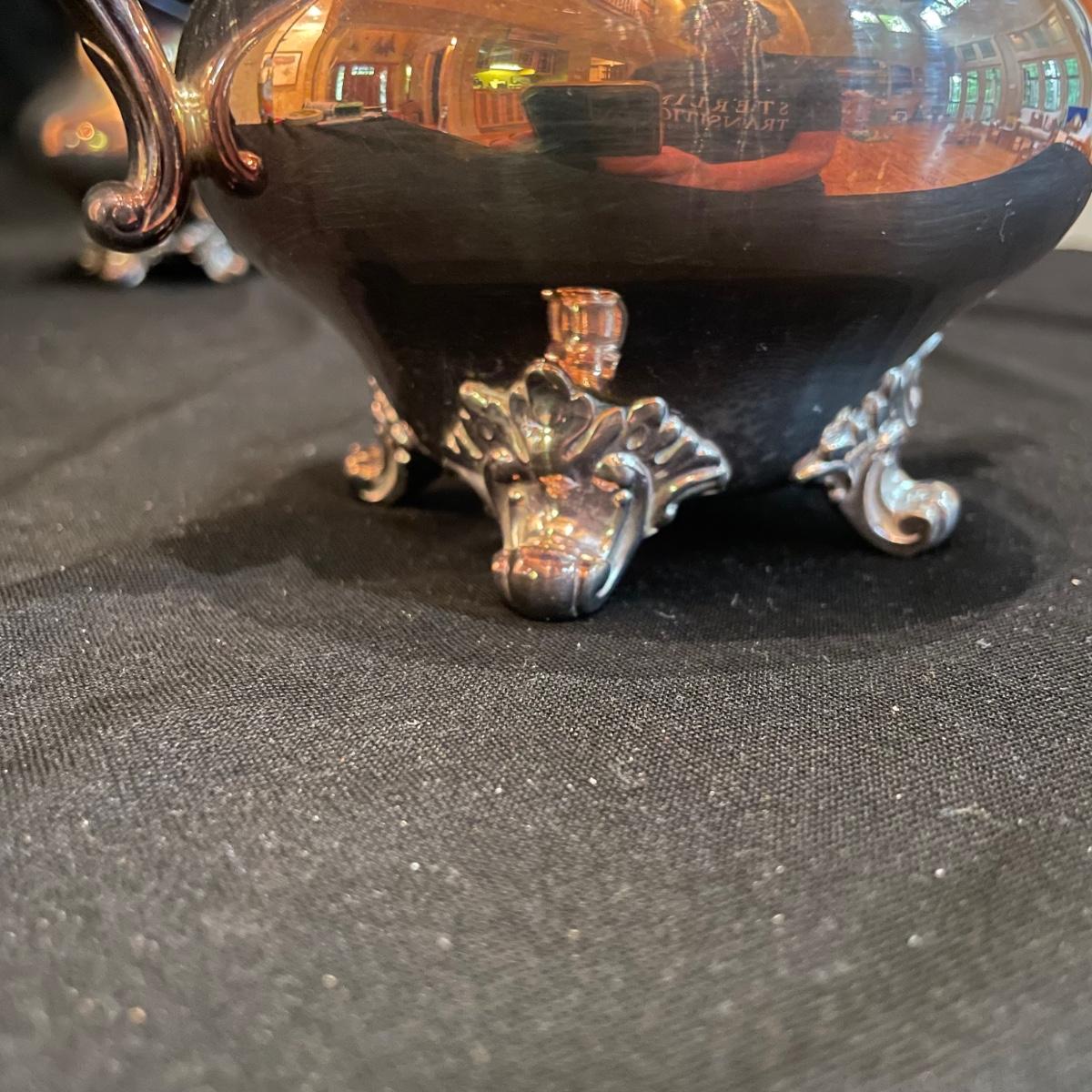 Timeless tea set by Reed & Barton includes teapot, cream pitcher and sugar now with lid. We’ve paired the tea set with a heavy 18” x 14” tray (measurements do not include handles) and a 8” x 6.5” dish named “Contess”. See images. Shipping available.
