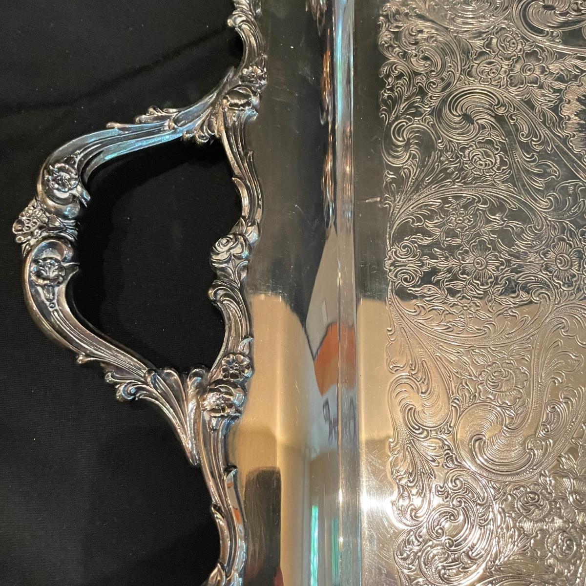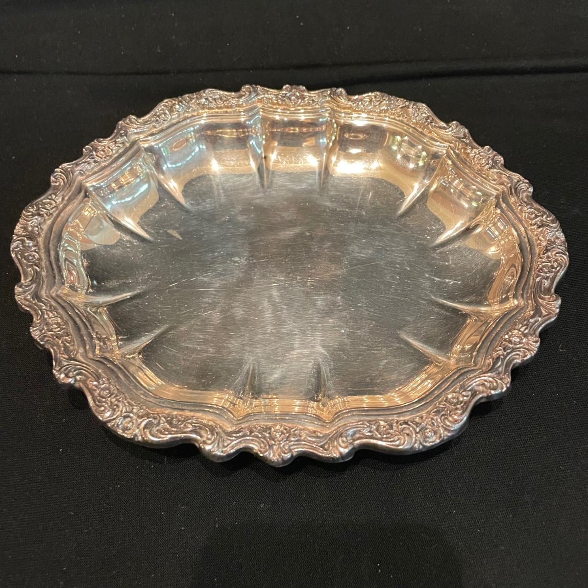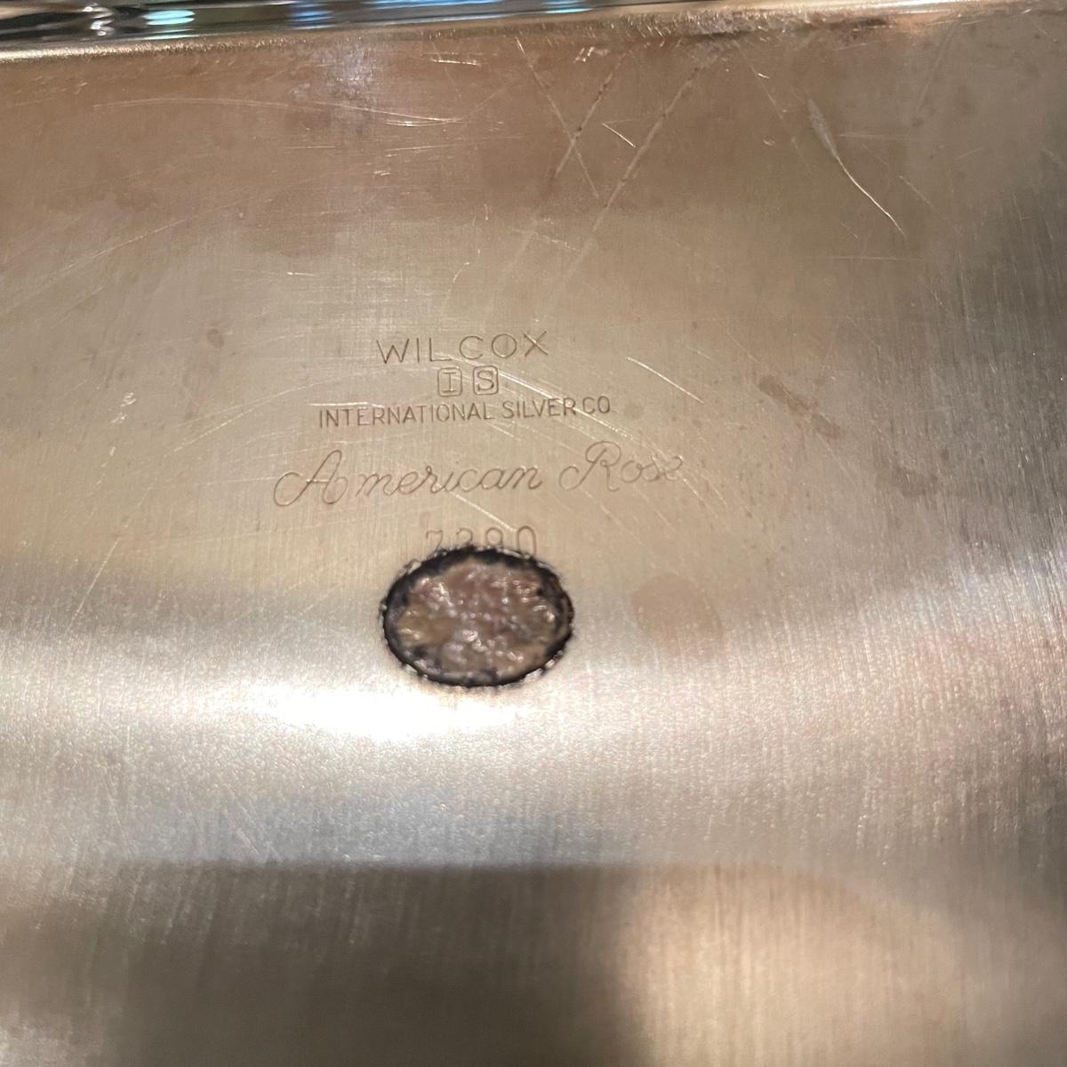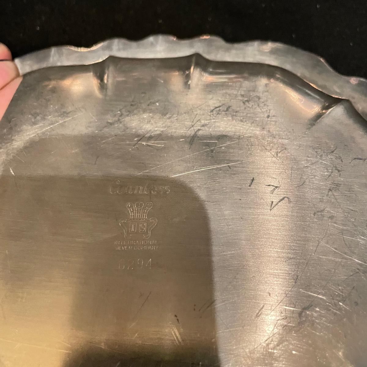 Timeless tea set by Reed & Barton includes teapot, cream pitcher and sugar now with lid. We’ve paired the tea set with a heavy 18” x 14” tray (measurements do not include handles) and a 8” x 6.5” dish named “Contess”. See images. Shipping available.