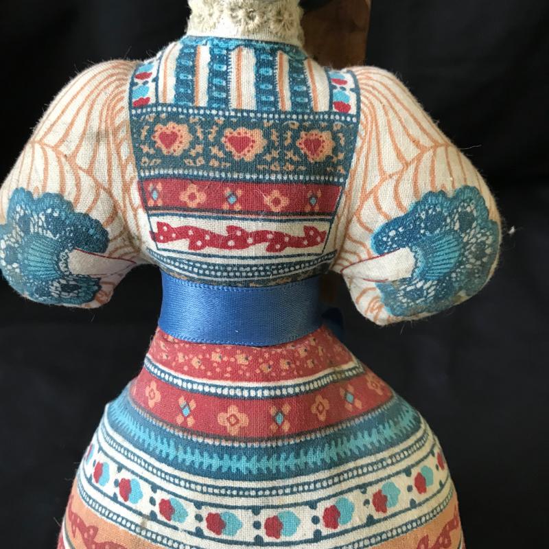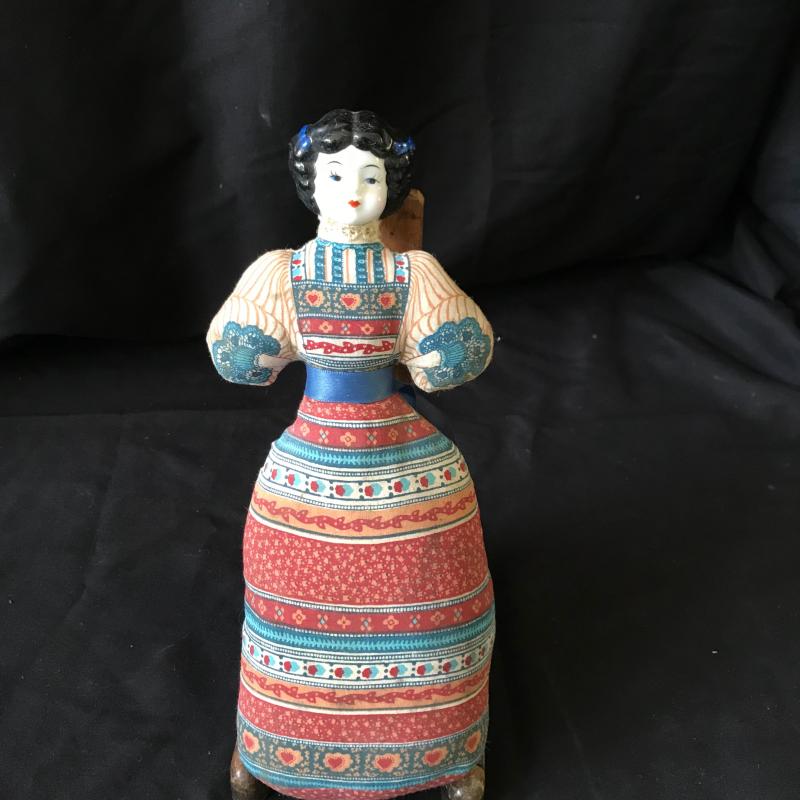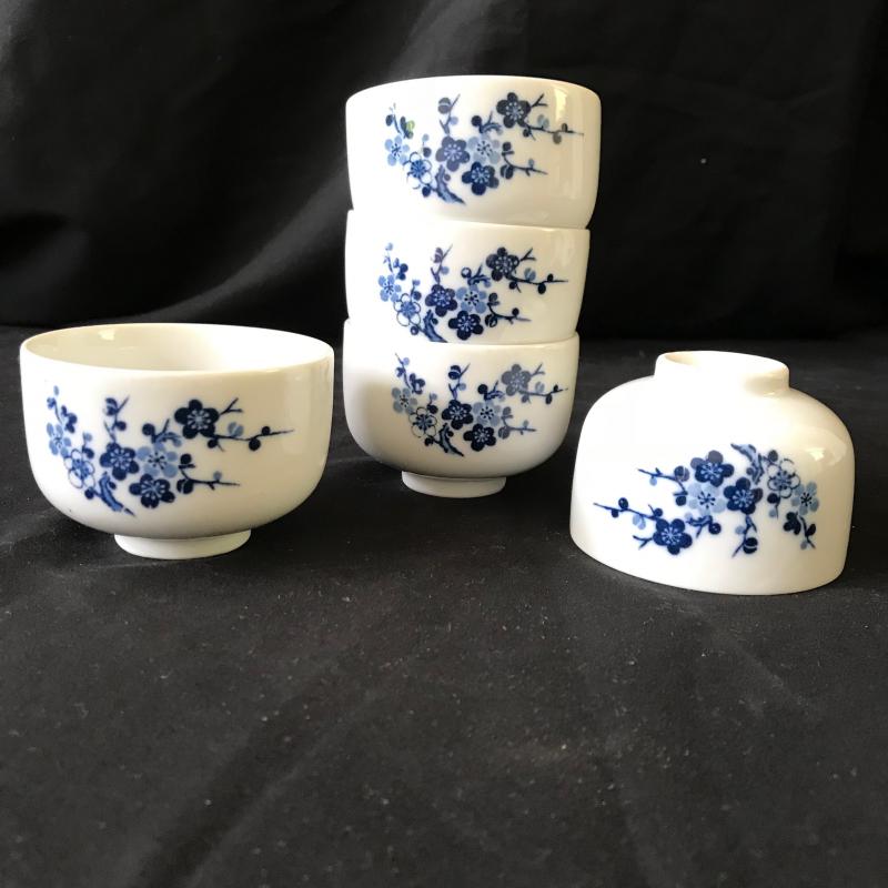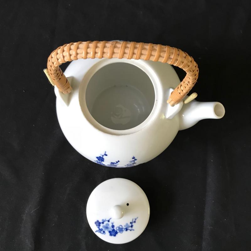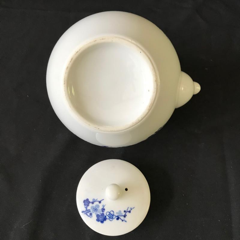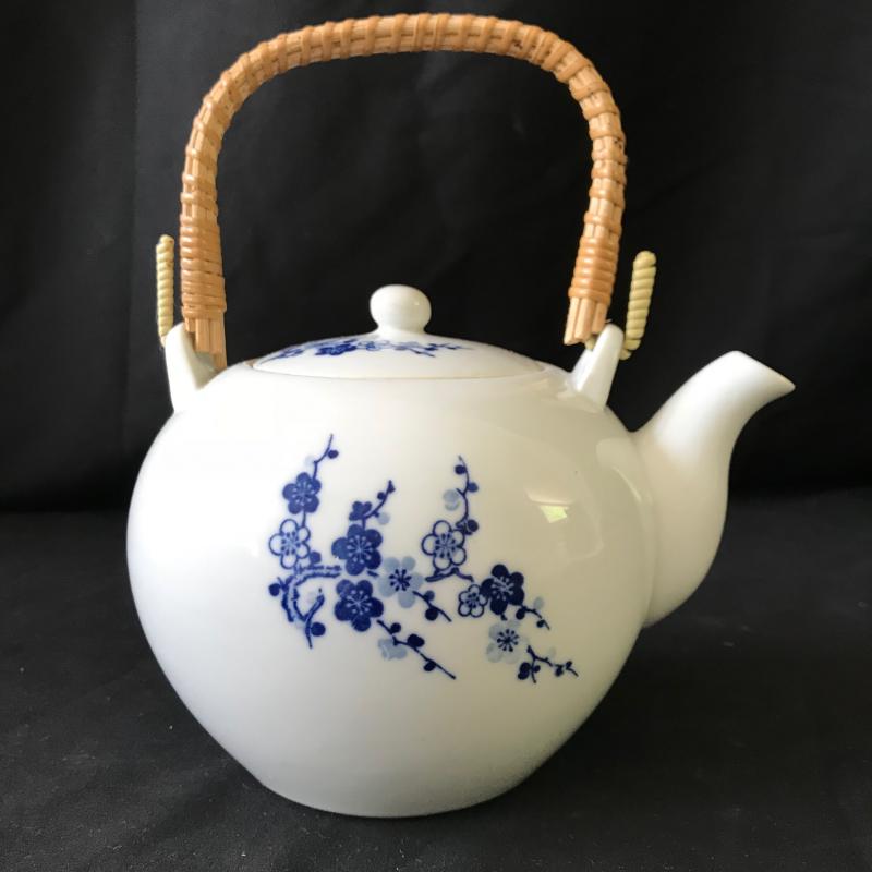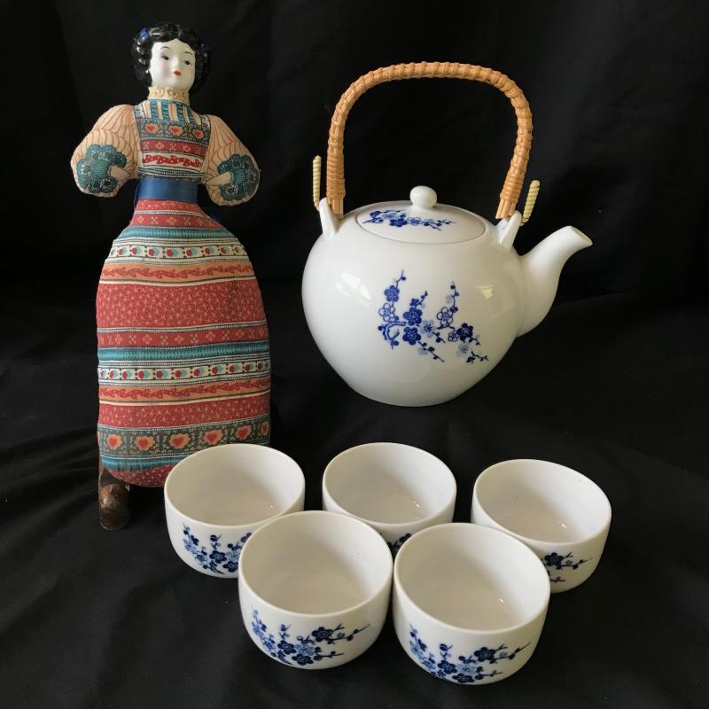 This sweet, floral blue and white china tea set contains five tea cups and one tea kettle. No markings evident. Lot also includes asian doll with porcelain head and plush fabric body (approx. 11” tall). Shipping or Local pickup in Hendersonville, NC.