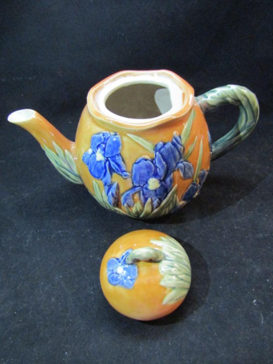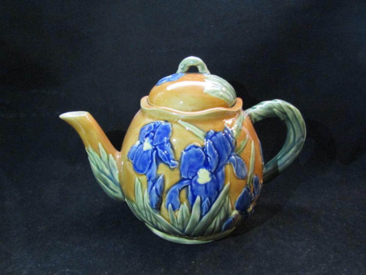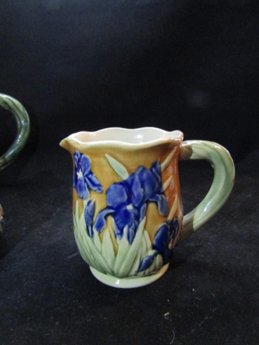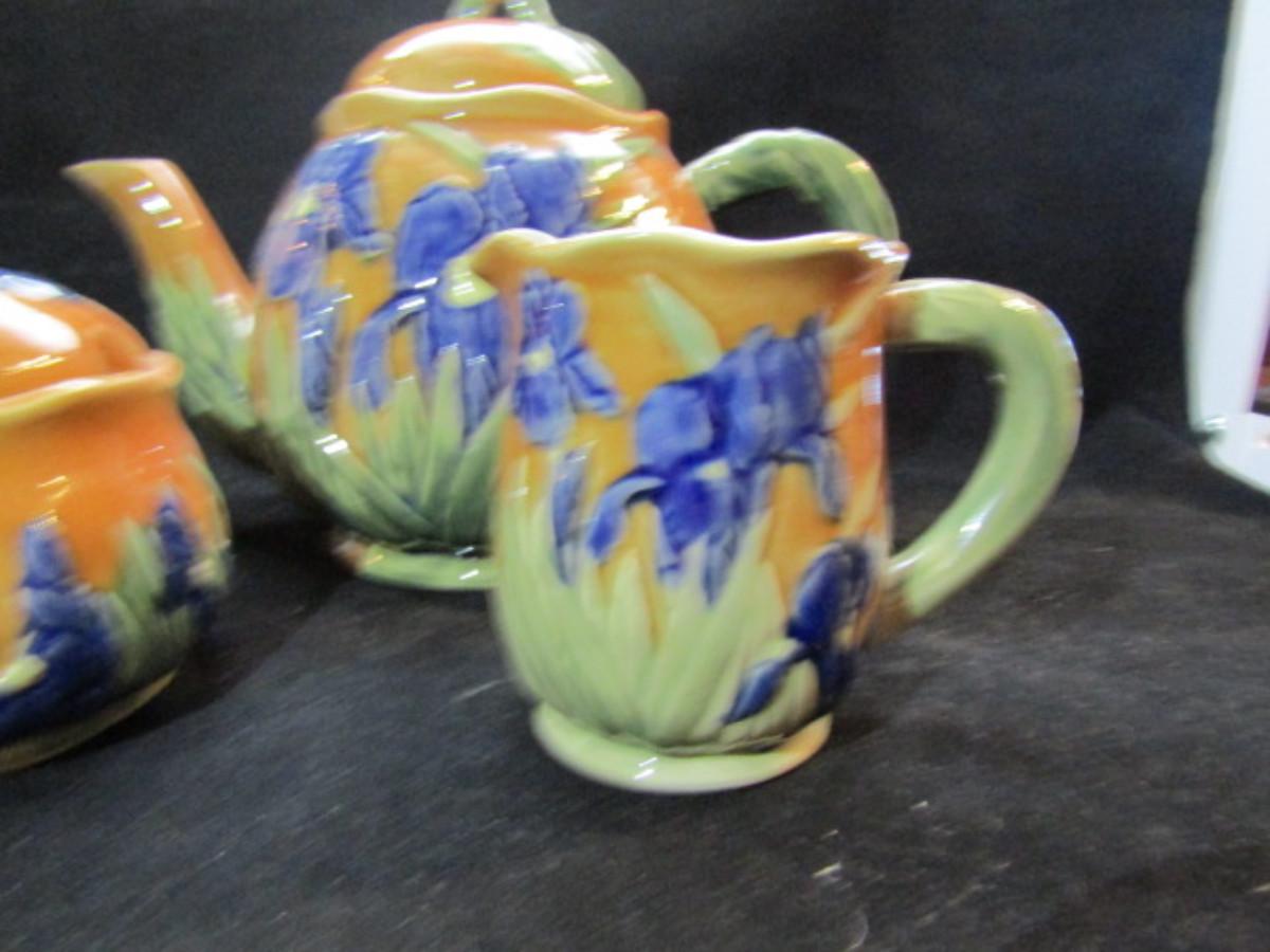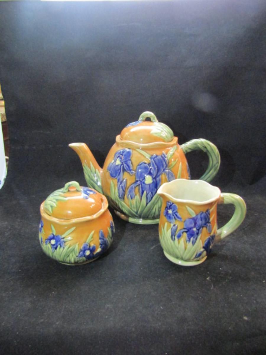 Tea Set- Blue Iris Design (#45). Teapot, creamer, and covered sugar bowl.