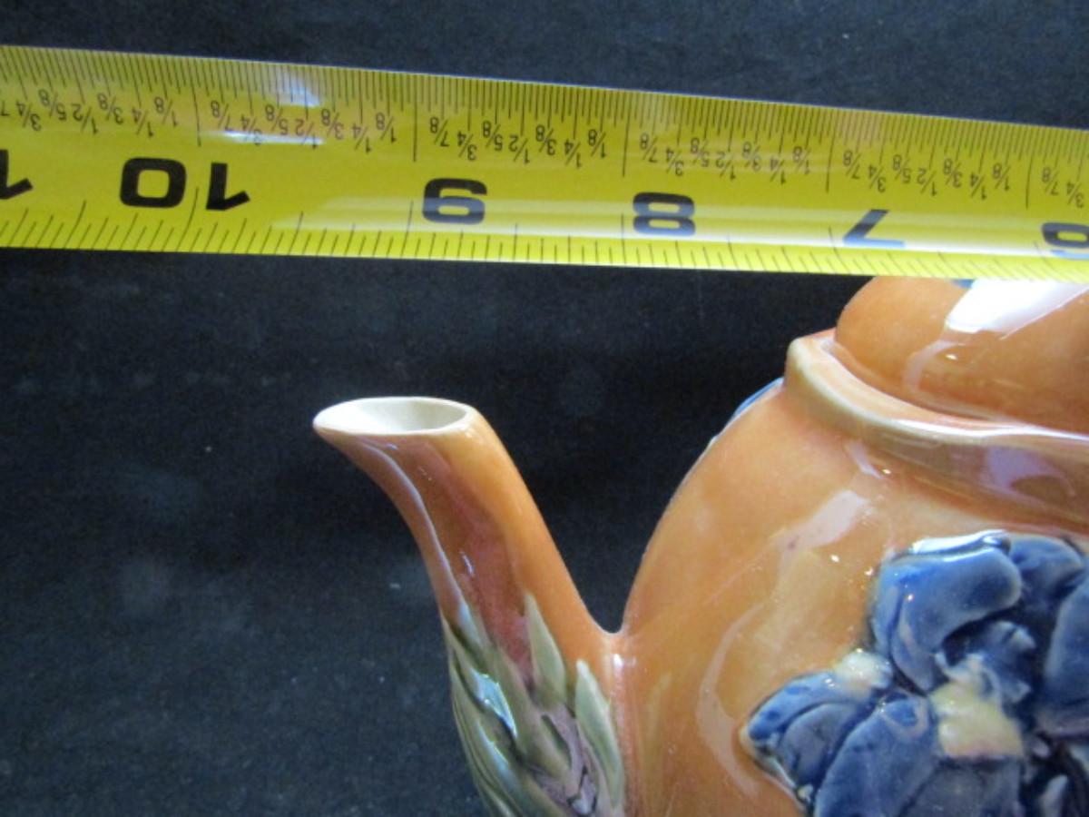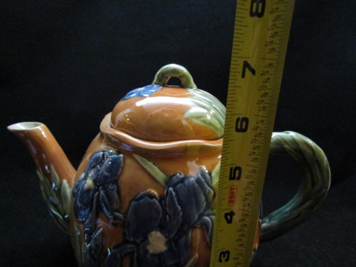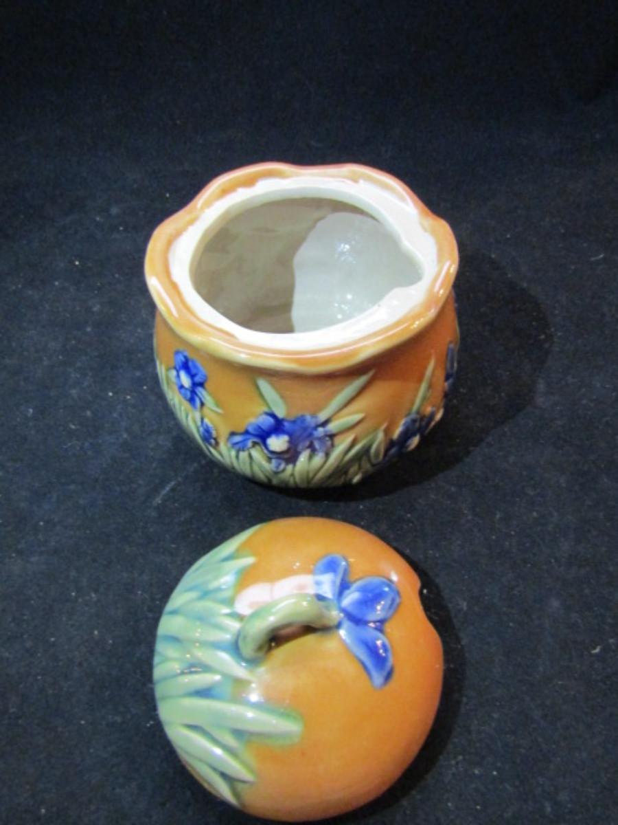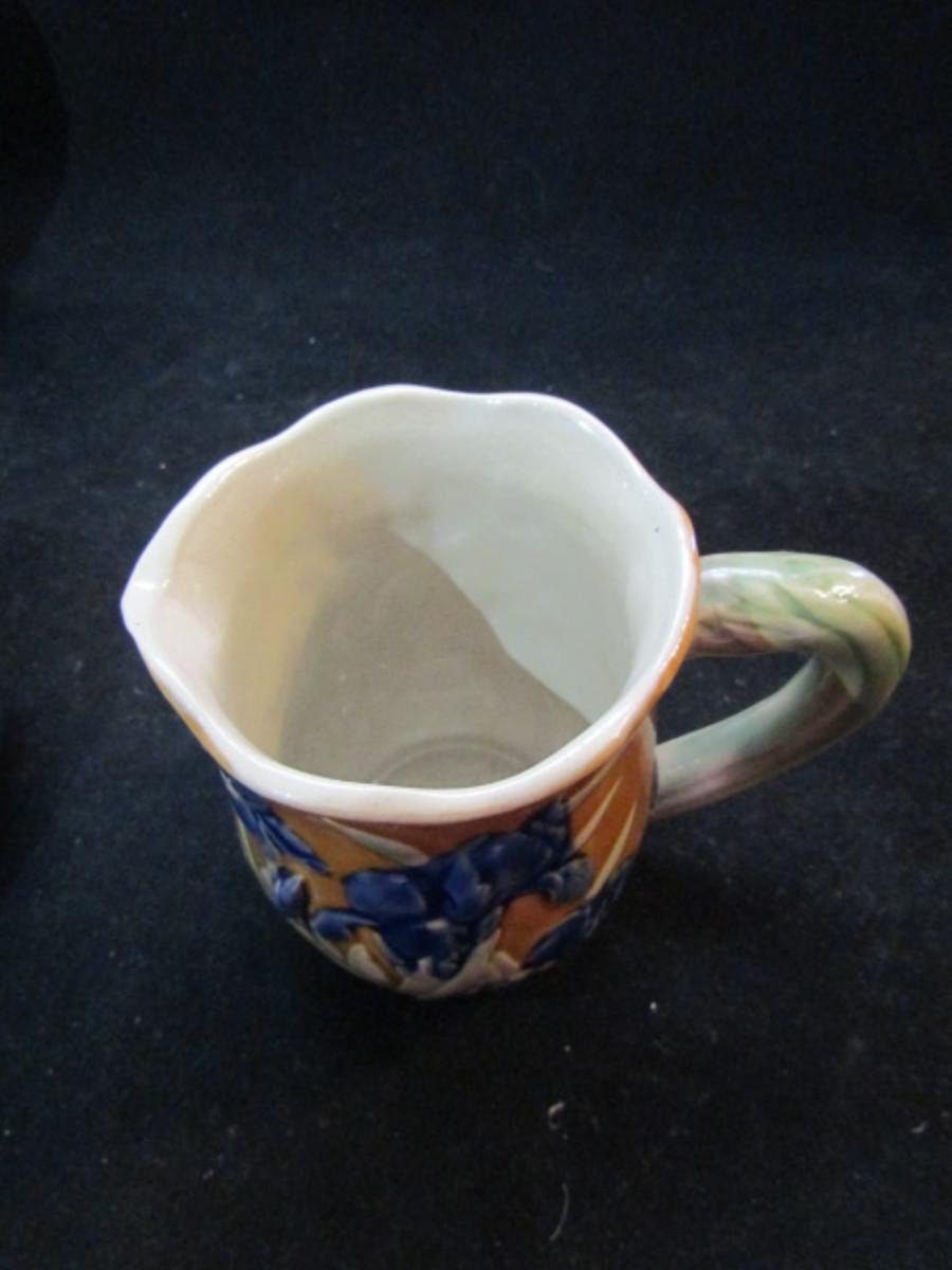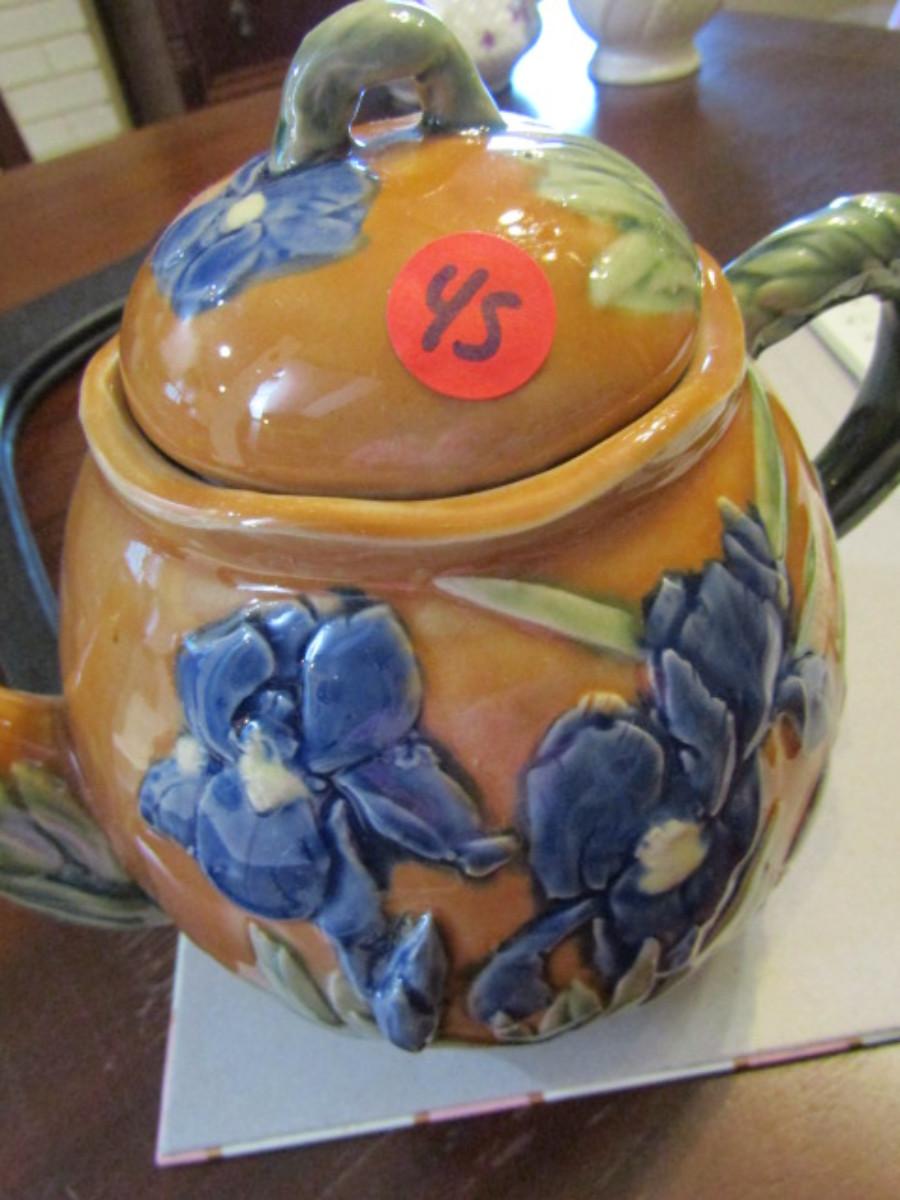 Tea Set- Blue Iris Design (#45). Teapot, creamer, and covered sugar bowl.
