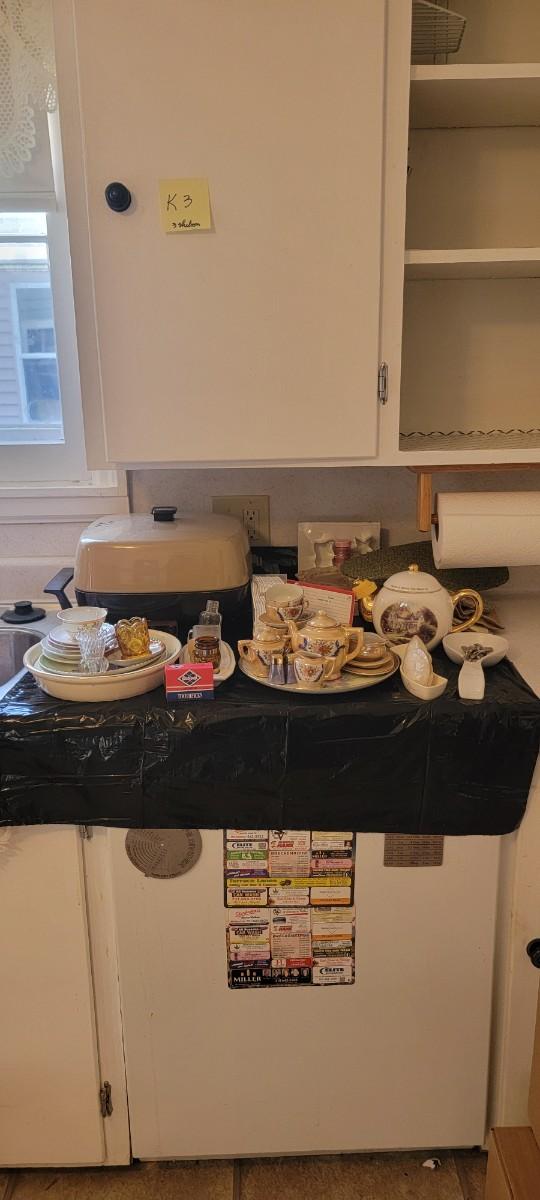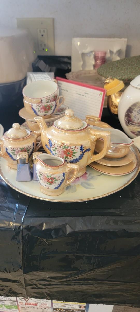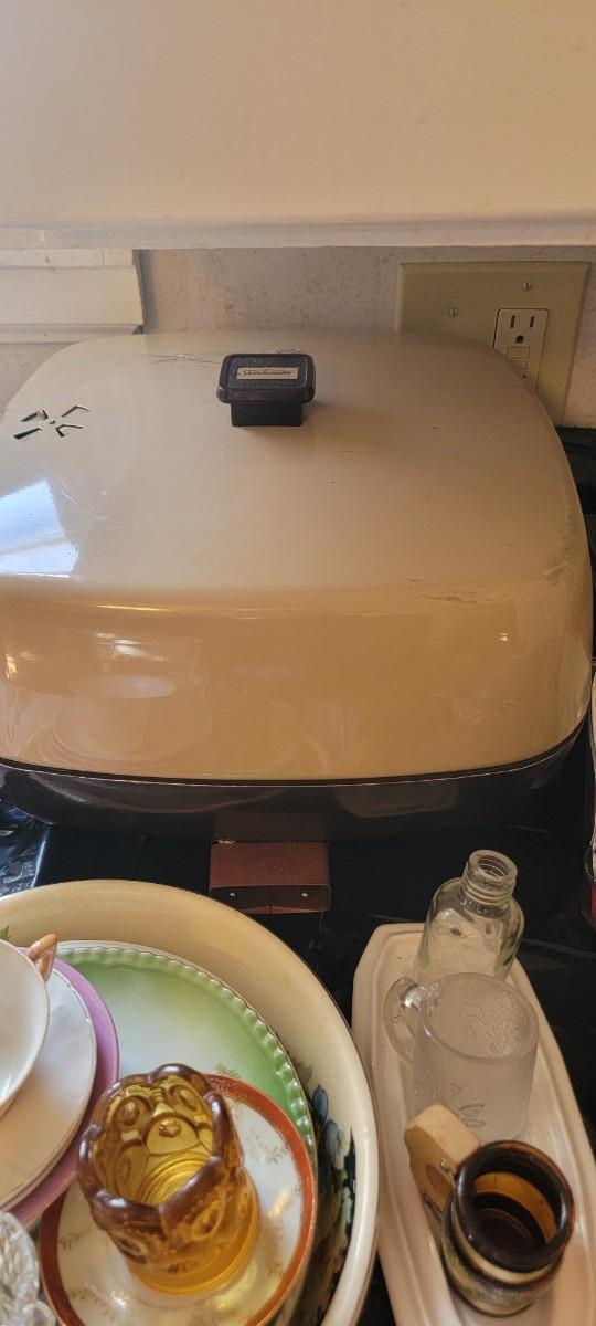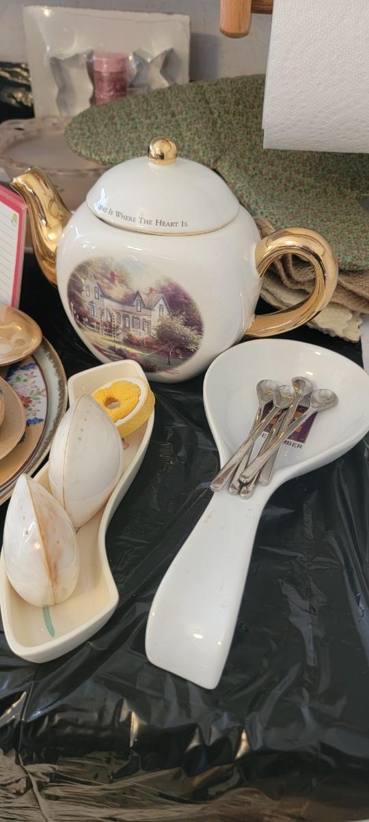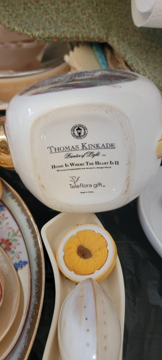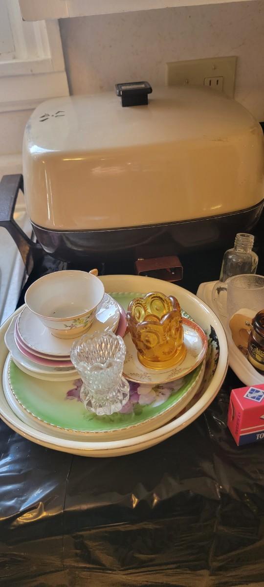 Sunbeam electric fry pan. Adorable pieces of mini Japan rea set. Thomas Kinkade Teleflora tea pot, plus