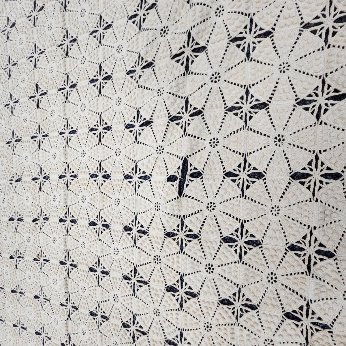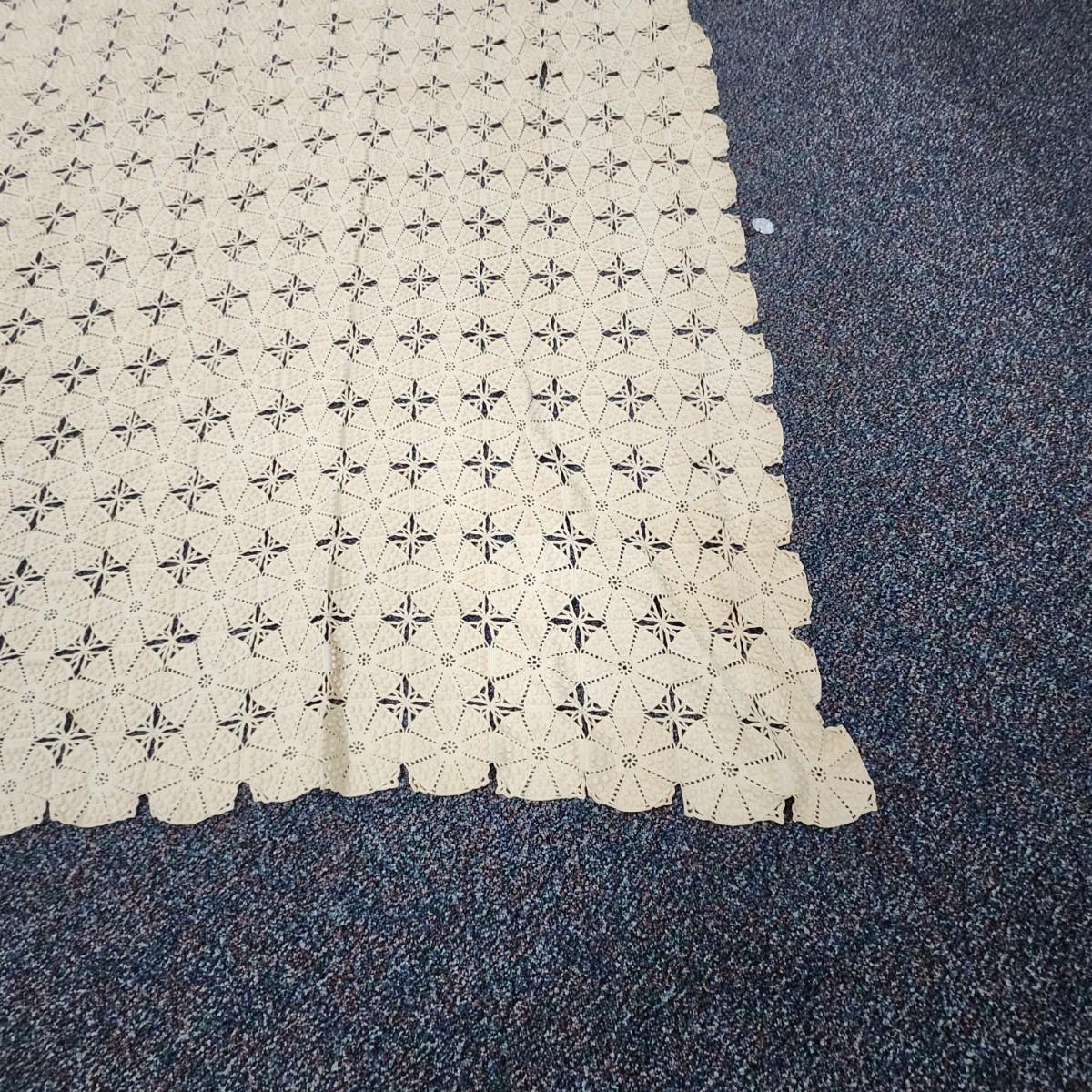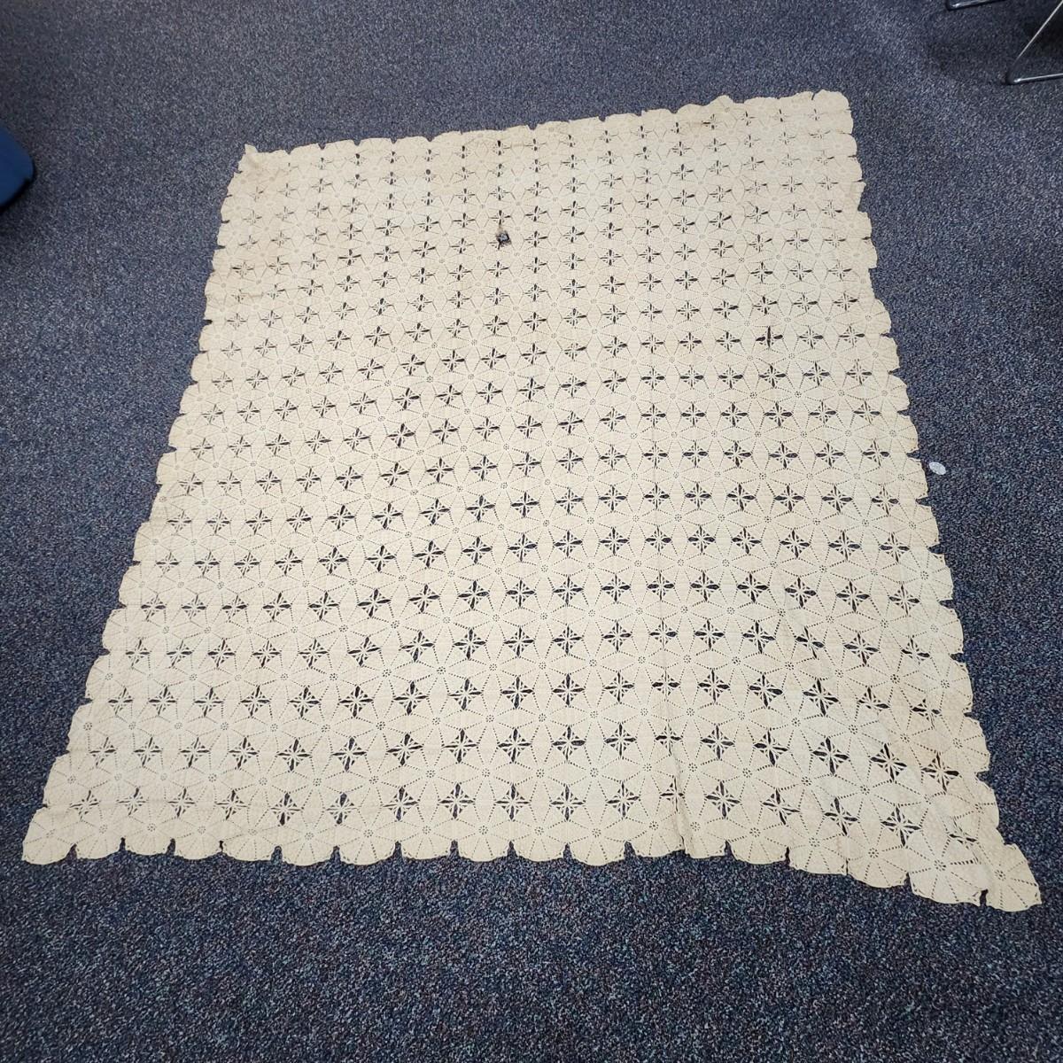 This beautiful, crocheted bedspread and or tablecloth is over 100 years old. It has one are that could be repaired with a few hand stiches. Star and popcorn pattern. It would look wonderful on your holiday table or across the foot of a bed as an accent. Very good condition. 81 inches by 87 inches.