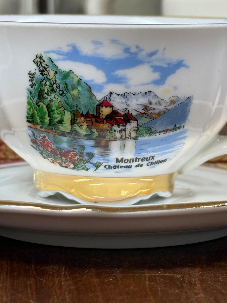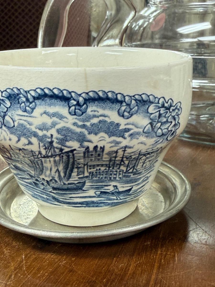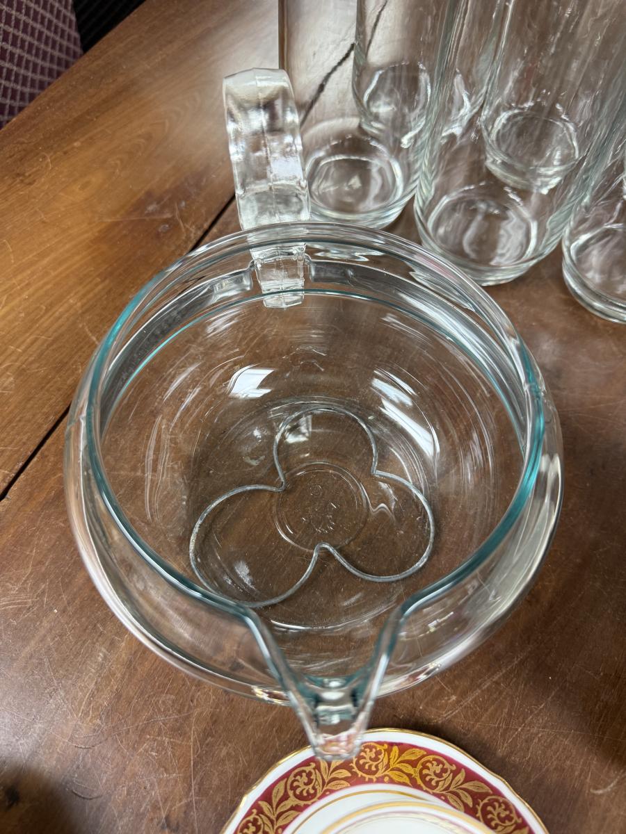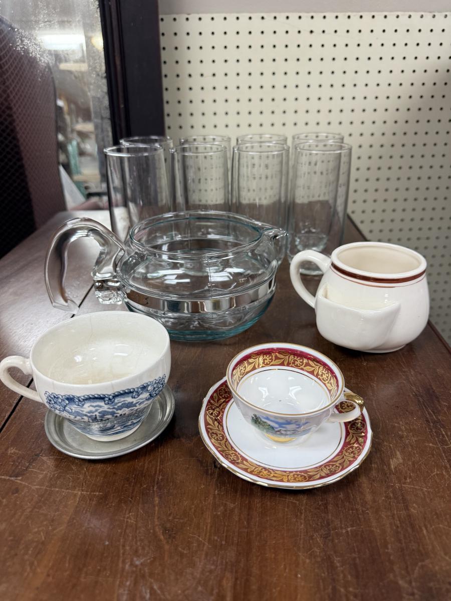 8 tea glasses, Pyrex glass tea pot, mini Bavaria China cup, transfer-ware mug, tea mug with holder for tea bag, pewter coaster
