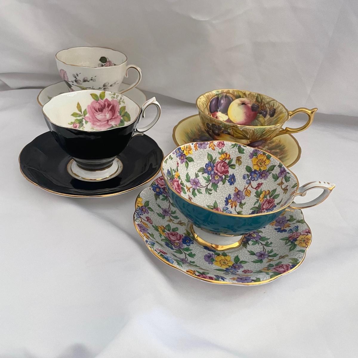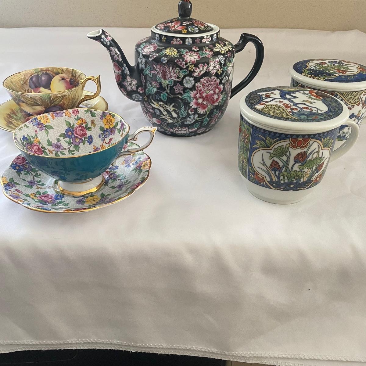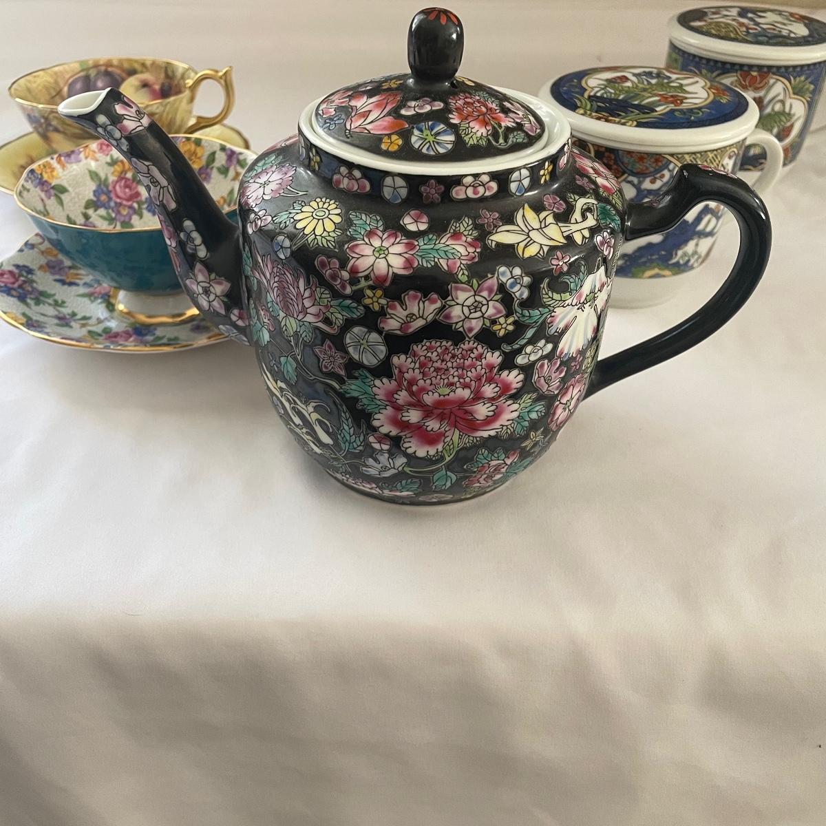 We have paired this pretty black floral China tea pot with four fine bone China cups and saucers that includes Royal Albert, Aynsley and more. Items are all of average weight for their size.