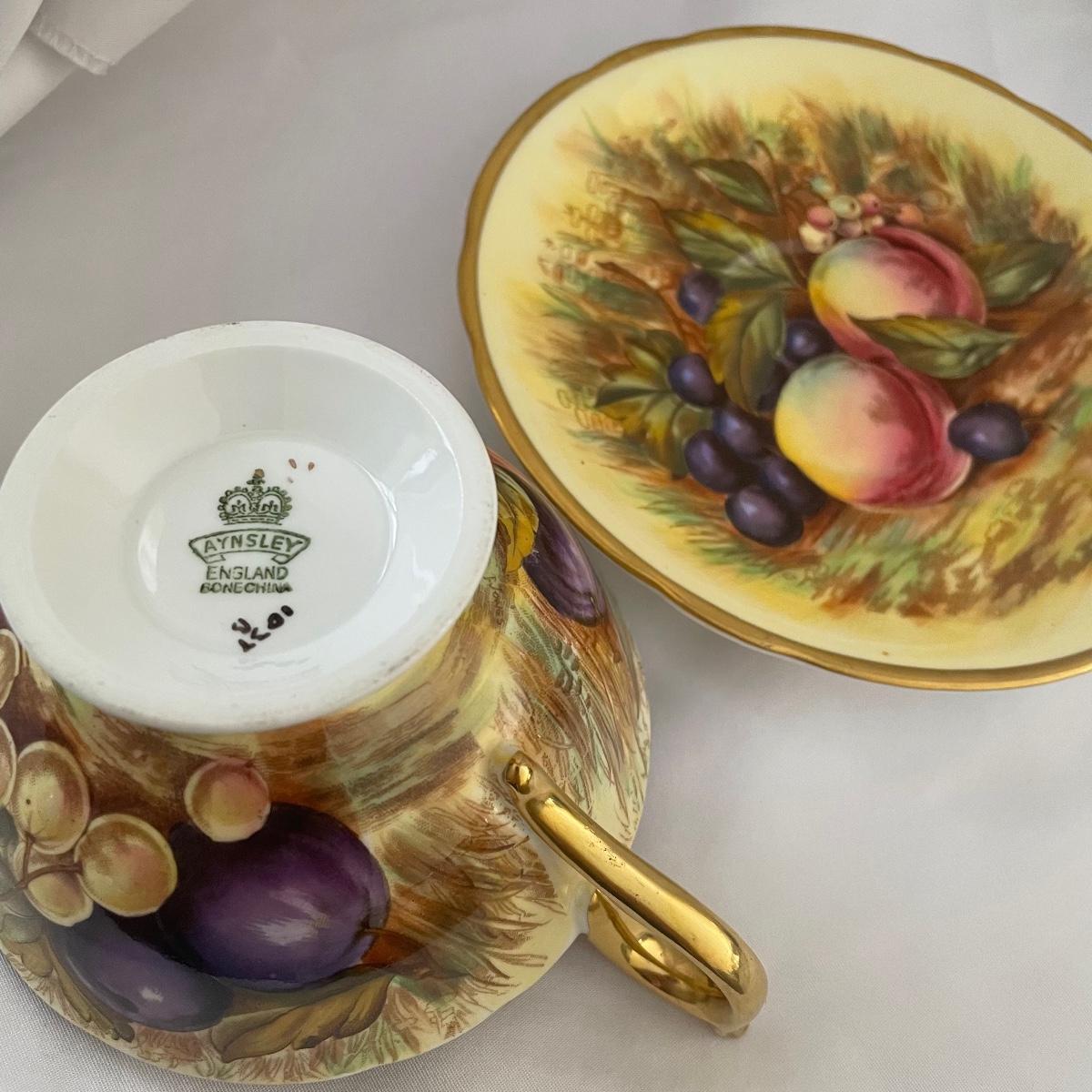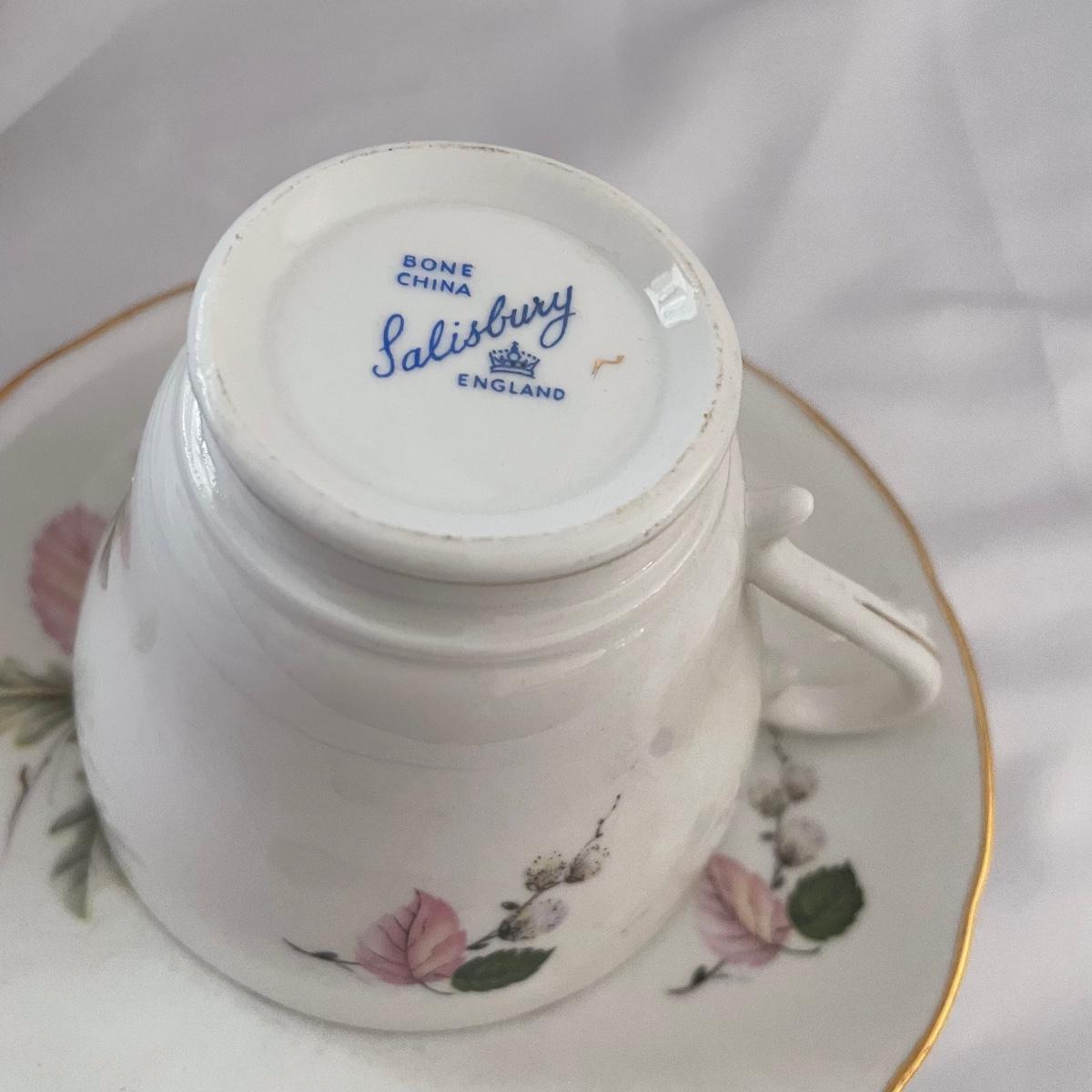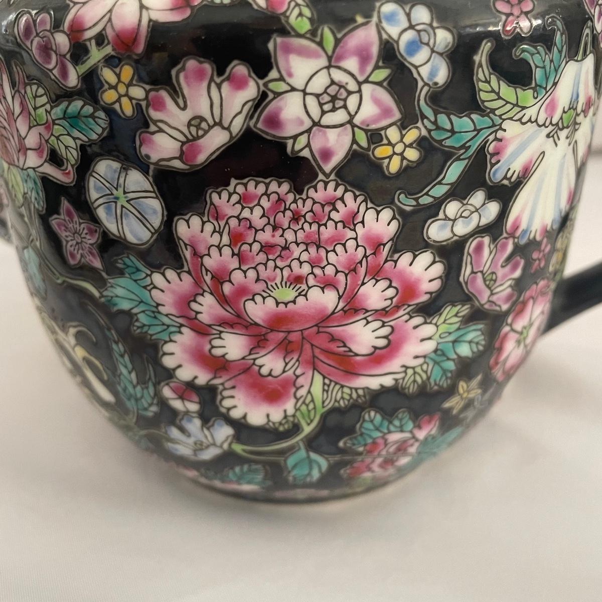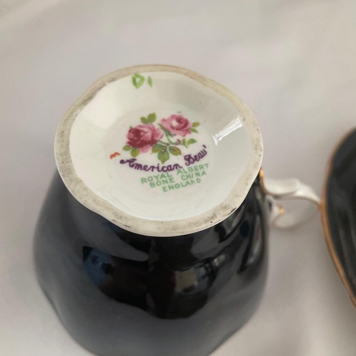 We have paired this pretty black floral China tea pot with four fine bone China cups and saucers that includes Royal Albert, Aynsley and more. Items are all of average weight for their size.
