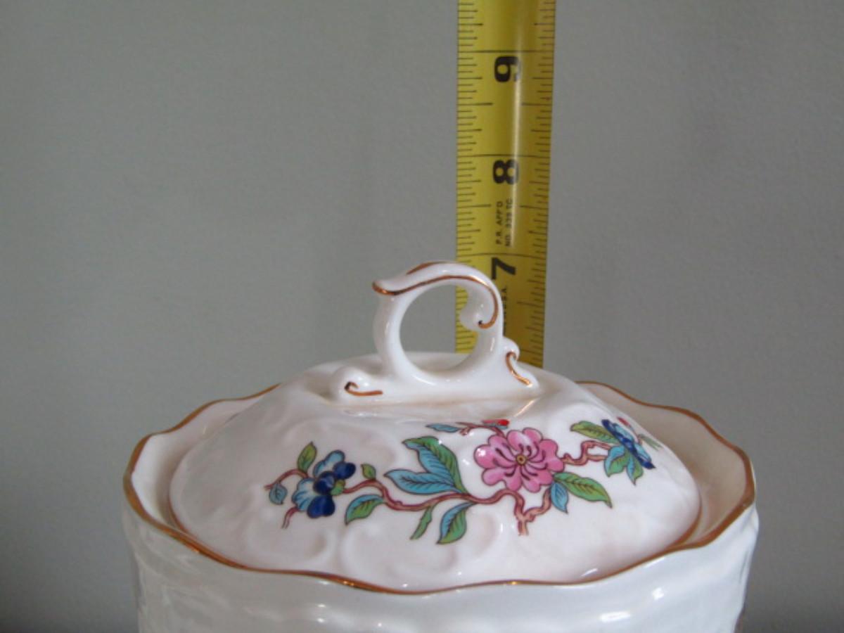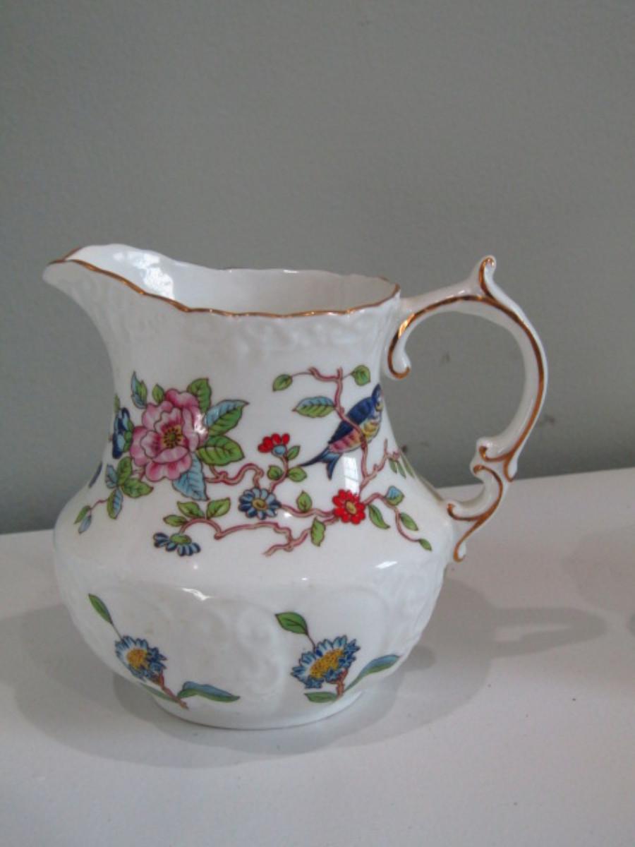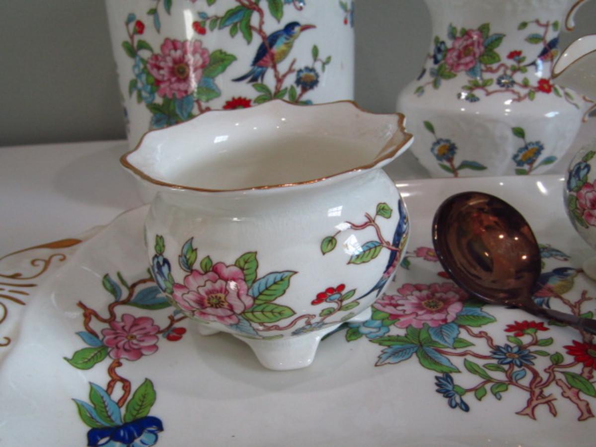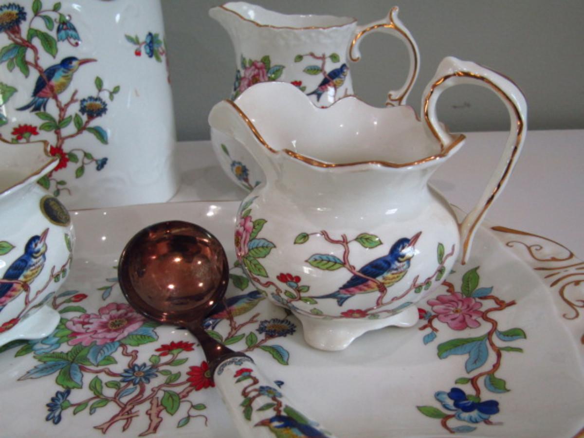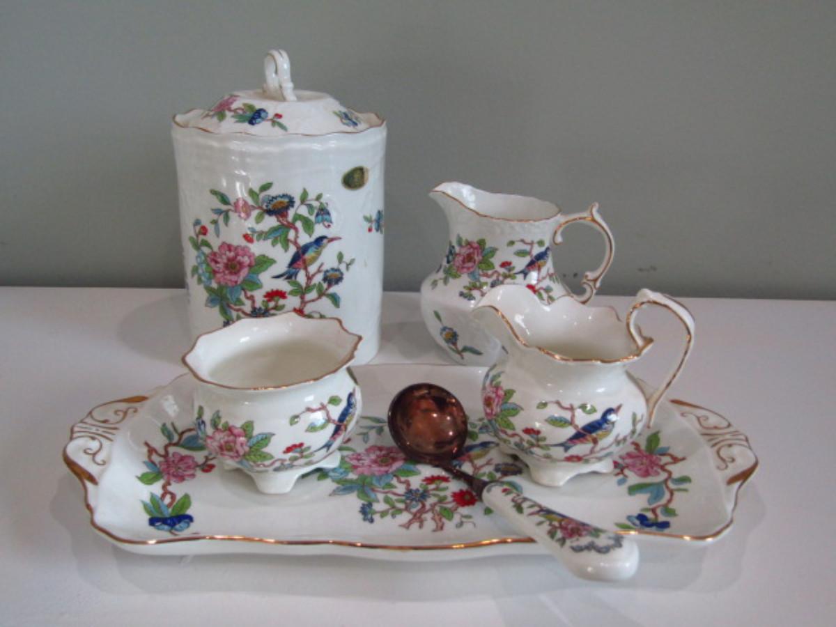 Tea Time Pieces by Aynsley- Pembroke Pattern (DR). Creamer and sugar with under/serving plate, large creamer, biscuit barrel with lid, and spoon
