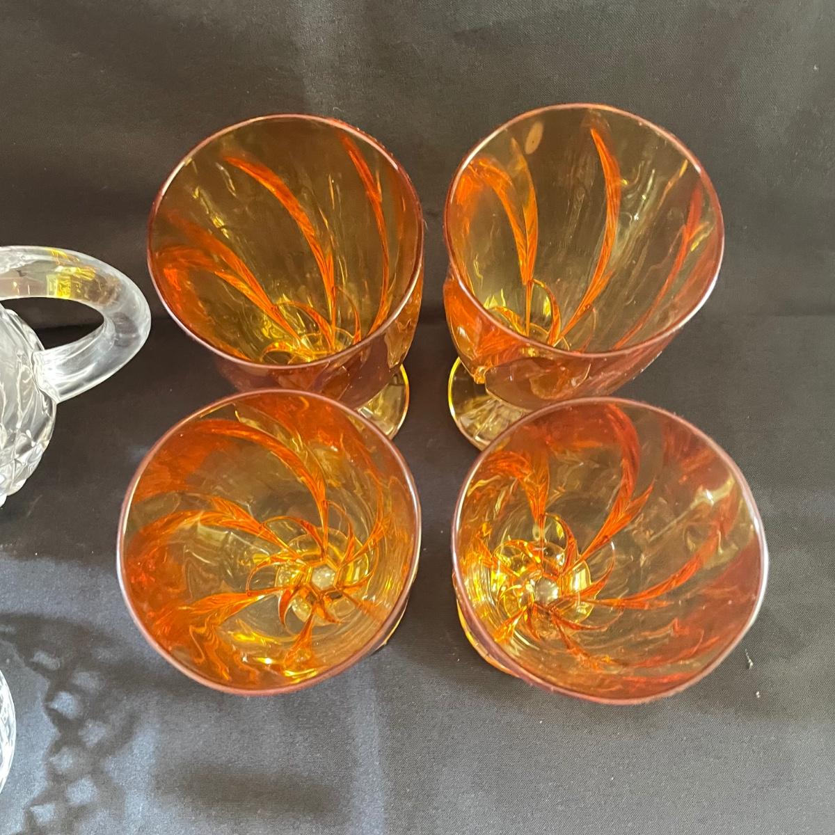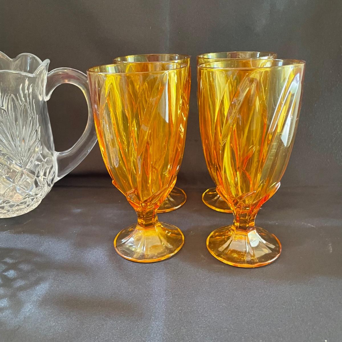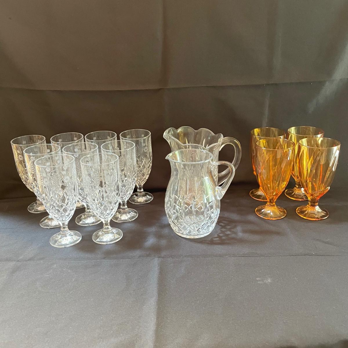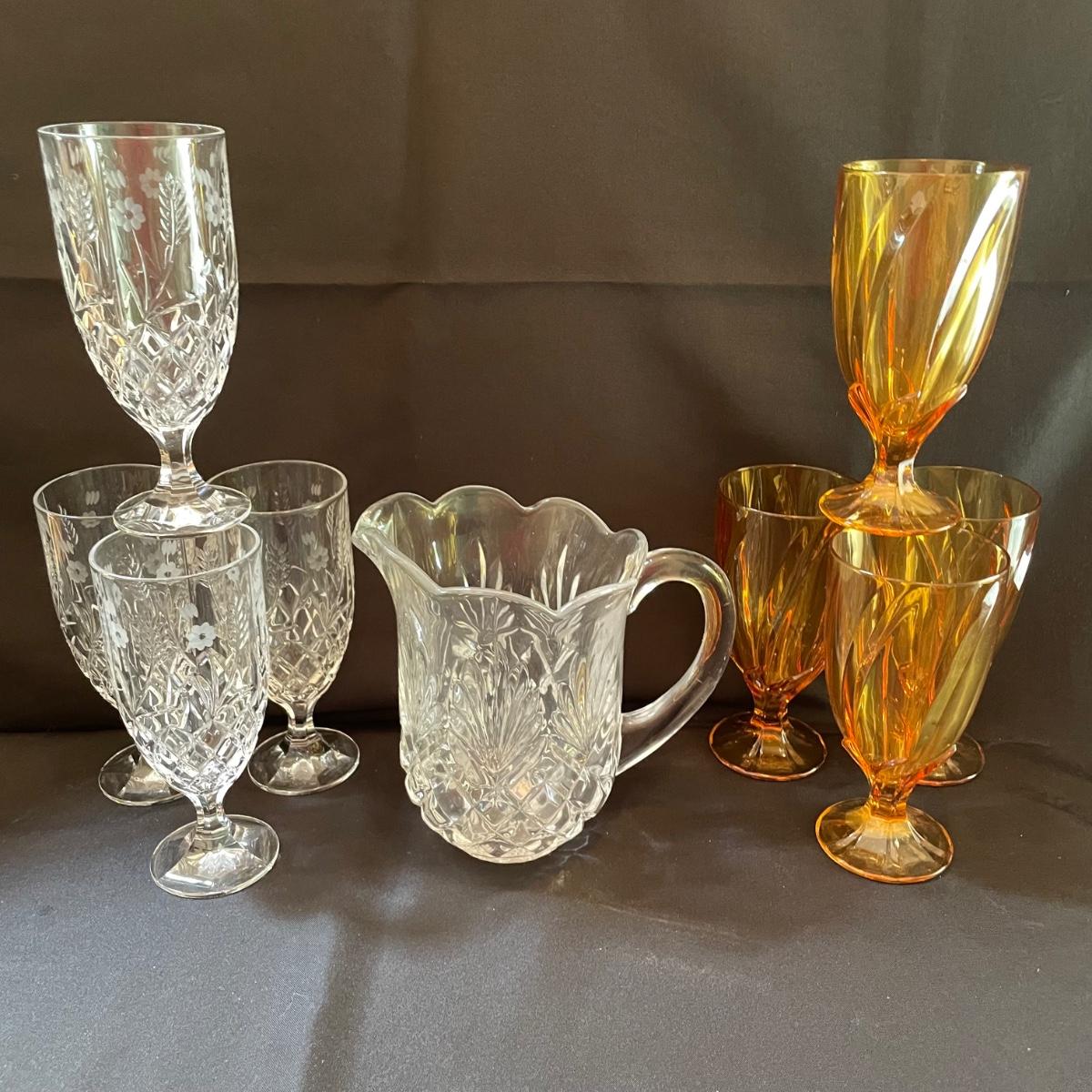 Two glass pitchers and two sets of footed glassware perfect for sweet and unsweetened iced tea. A set of nine floral etched glasses and a set of four swirled amber glasses. Two clear glass pitchers round out the lot. The larger pitcher measures 8.5” x 5.5” x 8.25” H (with handle). The clear glasses are slightly taller than the amber at 8”H. Shipping available.