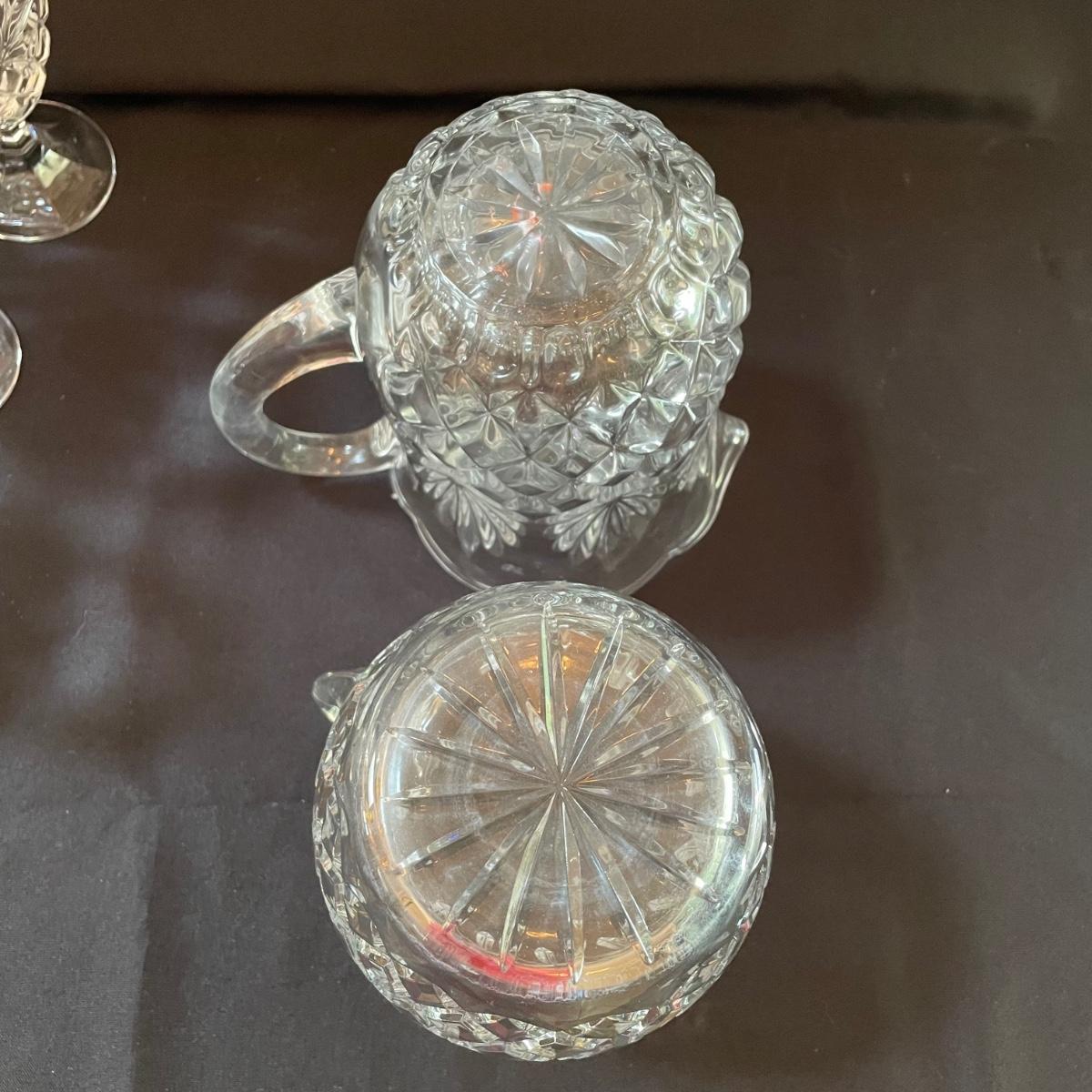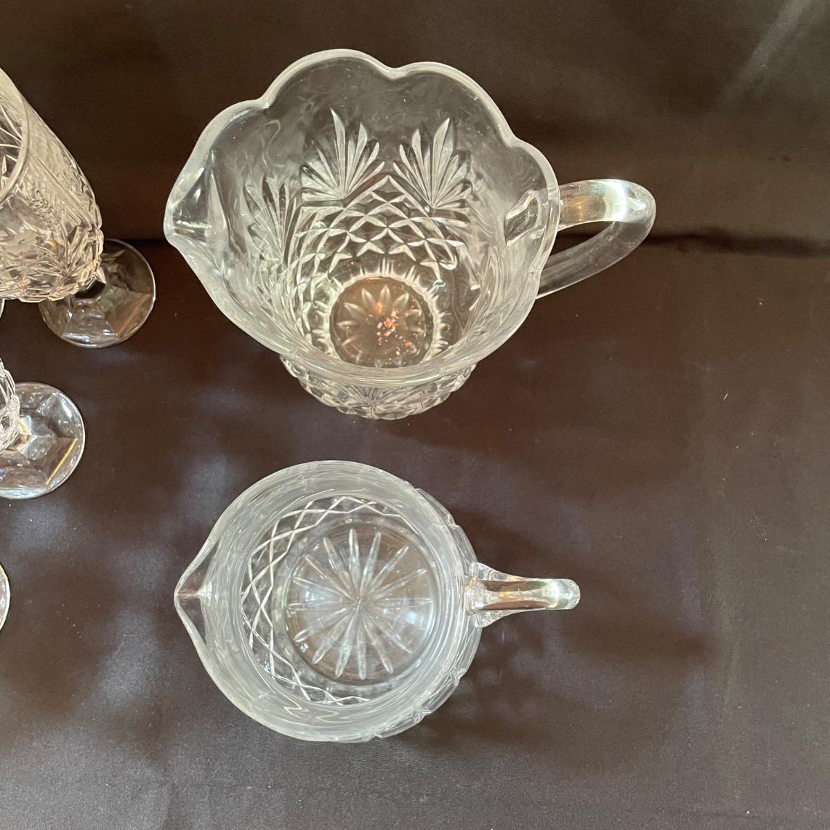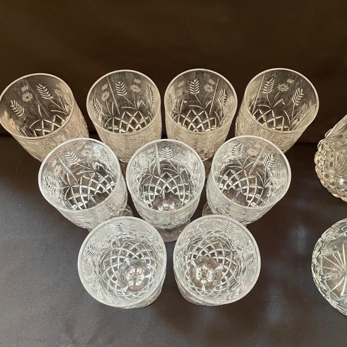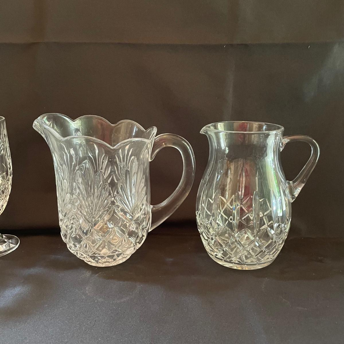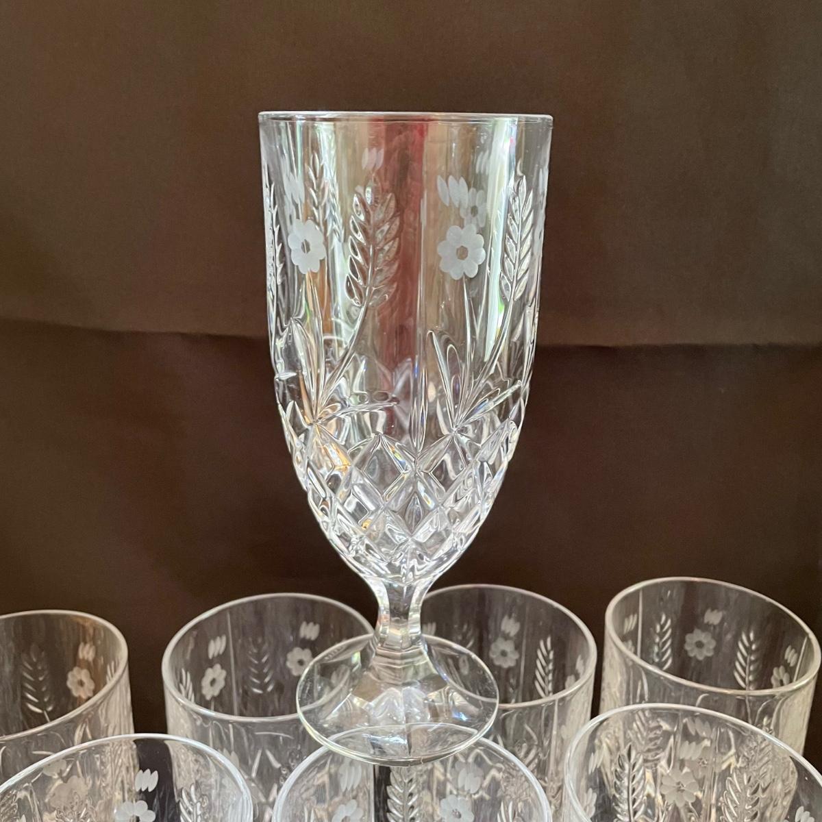 Two glass pitchers and two sets of footed glassware perfect for sweet and unsweetened iced tea. A set of nine floral etched glasses and a set of four swirled amber glasses. Two clear glass pitchers round out the lot. The larger pitcher measures 8.5” x 5.5” x 8.25” H (with handle). The clear glasses are slightly taller than the amber at 8”H. Shipping available.